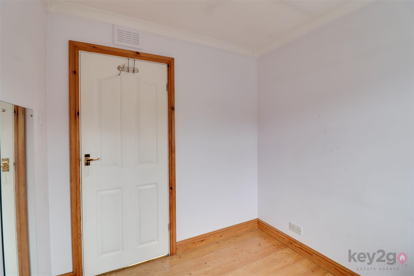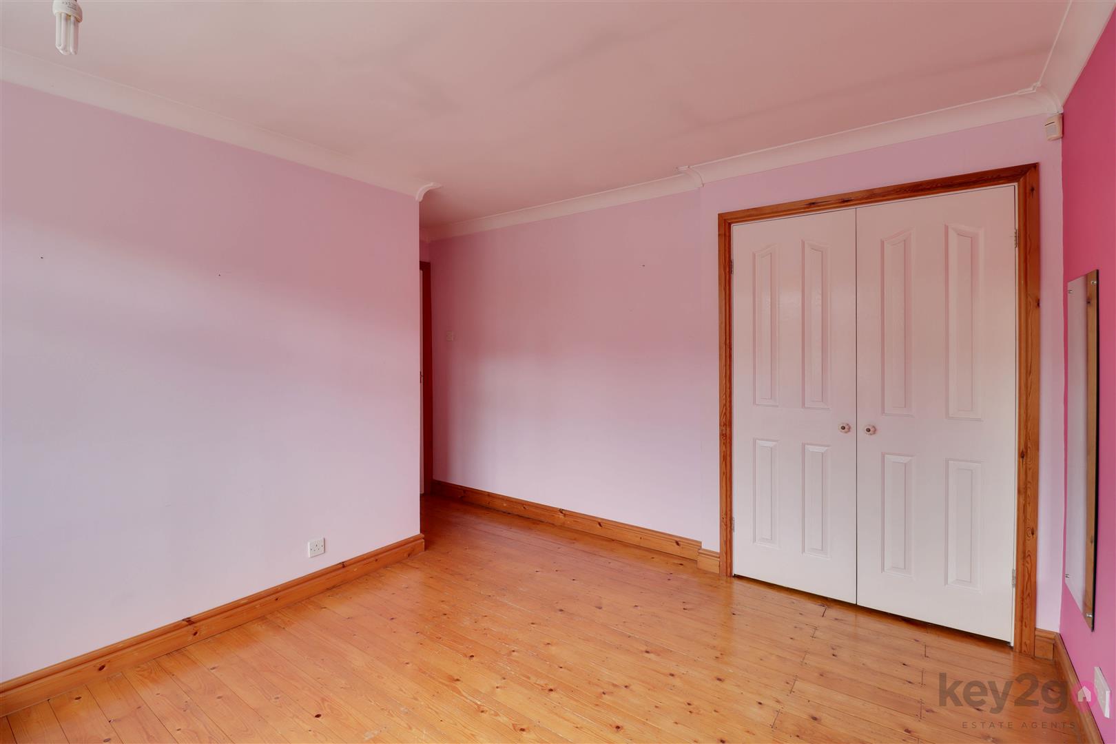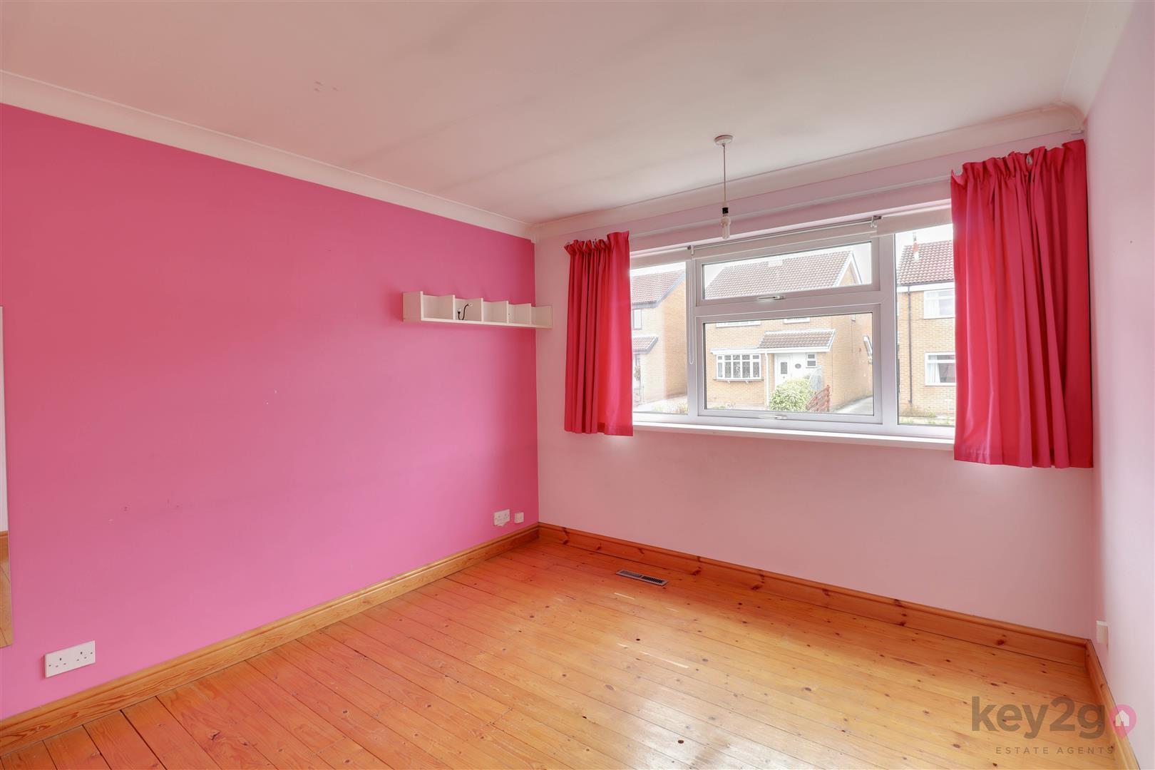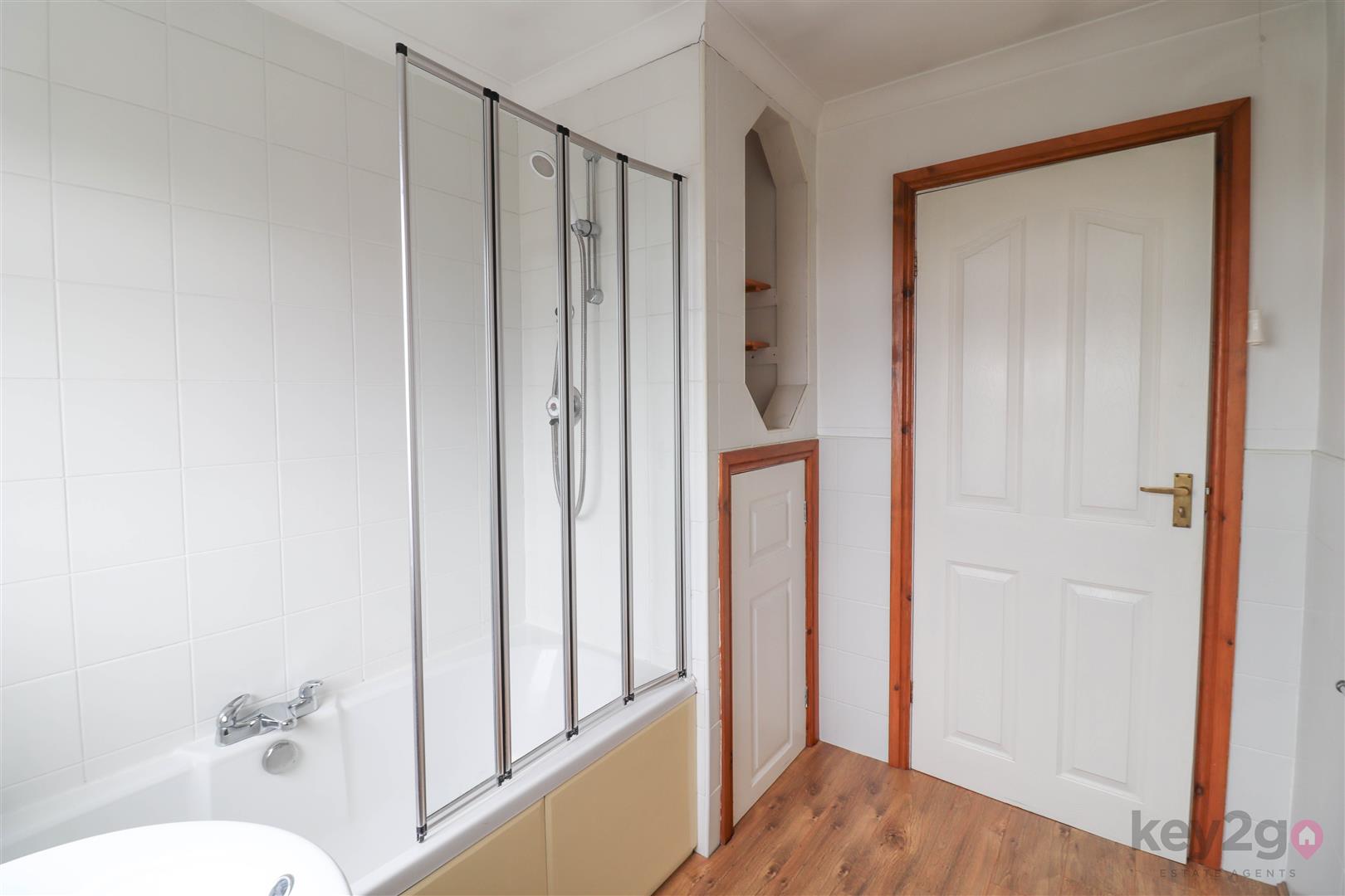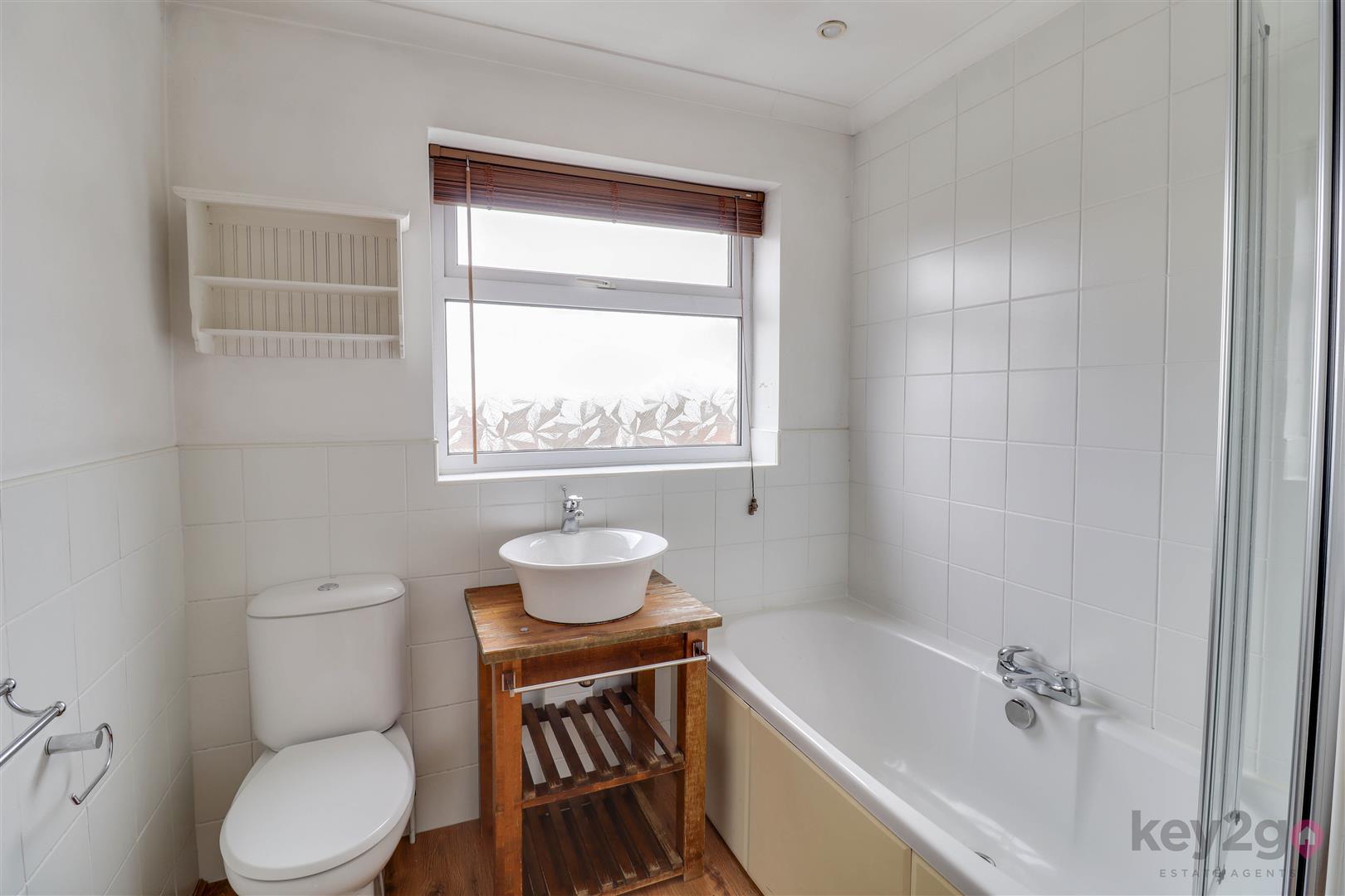 Carpeted stairs lead to the landing with two windows. Bedroom one is a double with built-in storage and a window. Bedroom two is a double with wood flooring, built-in storage, and a window. The single bedroom is neutrally decorated with wood flooring and a window. The bathroom is stylish and semi-tiled, featuring a bath with shower and glass screen, low-level WC, wash hand basin, and an obscure window.