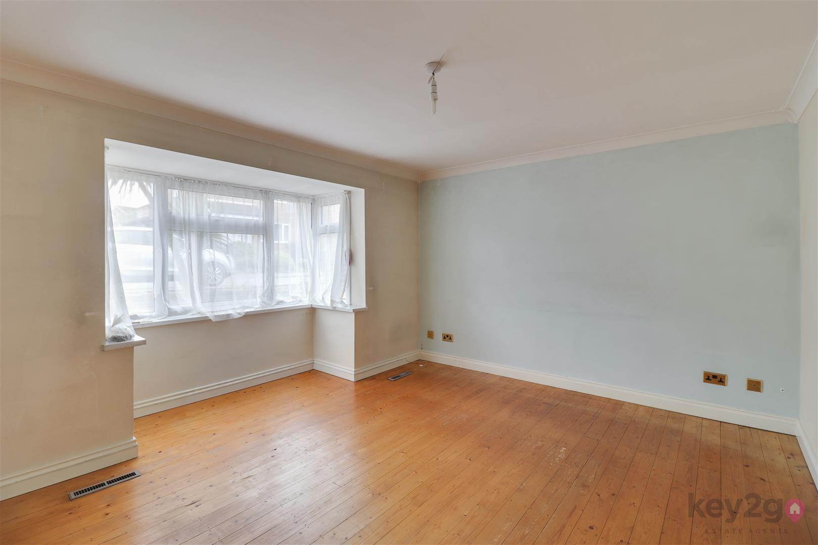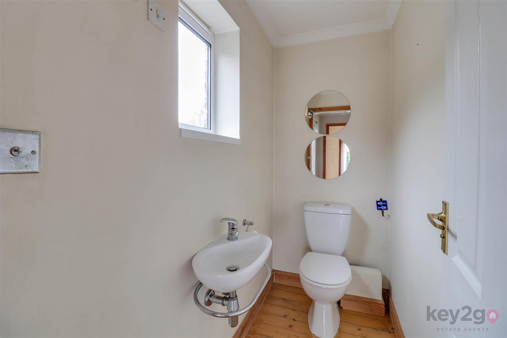 A uPVC door opens into the hallway, finished in neutral decor with stairs leading upstairs. The lounge is spacious with a bay window and wood flooring. The dining room is neutrally decorated, featuring double sliding doors leading to the rear garden and a door to the kitchen. The kitchen offers ample wall and base units with contrasting worktops, integrated under-counter fridge and freezer, oven, electric hob, dishwasher, washing machine, two sinks, a walk-in storage cupboard, and a door leading to the rear. The downstairs W/C is finished in neutral tones, with a low-level WC, wood flooring, and an obscure window.