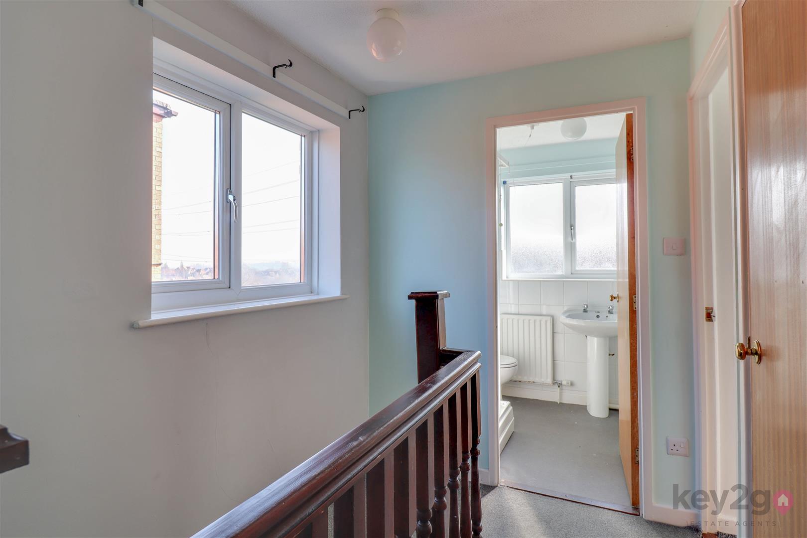 On the first floor, there are two double bedrooms, a single bedroom, and a cupboard housing the hot water tank. The bathroom features a bath, separate shower cubicle, pedestal sink, and WC.