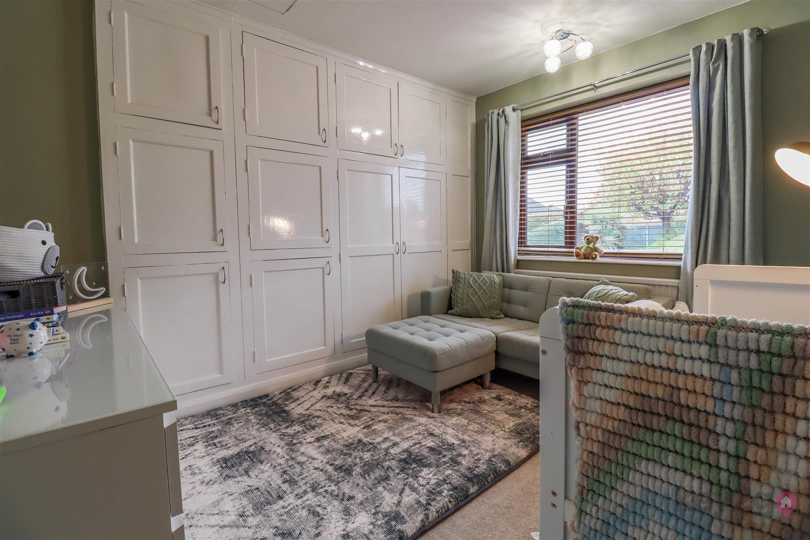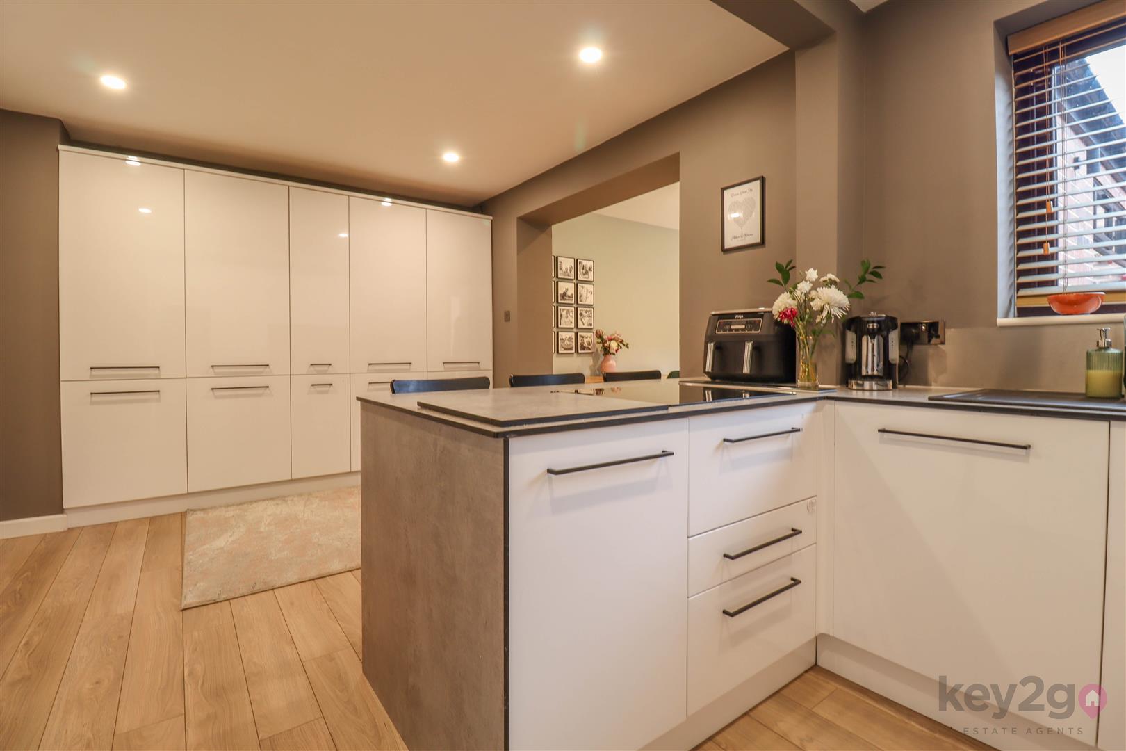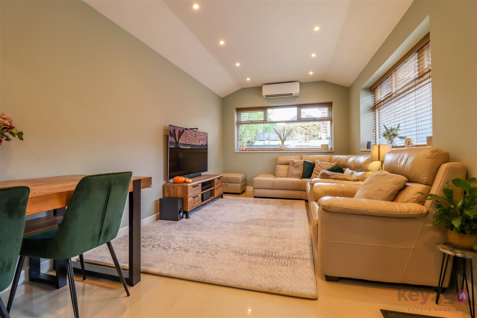 A composite door opens into a welcoming hallway that is bright and spacious, with stairs rising to the first floor and a useful storage cupboard. A door leads to the kitchen, which features a stunning high-quality design with compact laminate worktops. Double doors open to a snug, which could be used as a playroom, office, or additional bedroom. The kitchen is open to the extended living room, providing a sizeable family space with access to the rear garden and air conditioning.