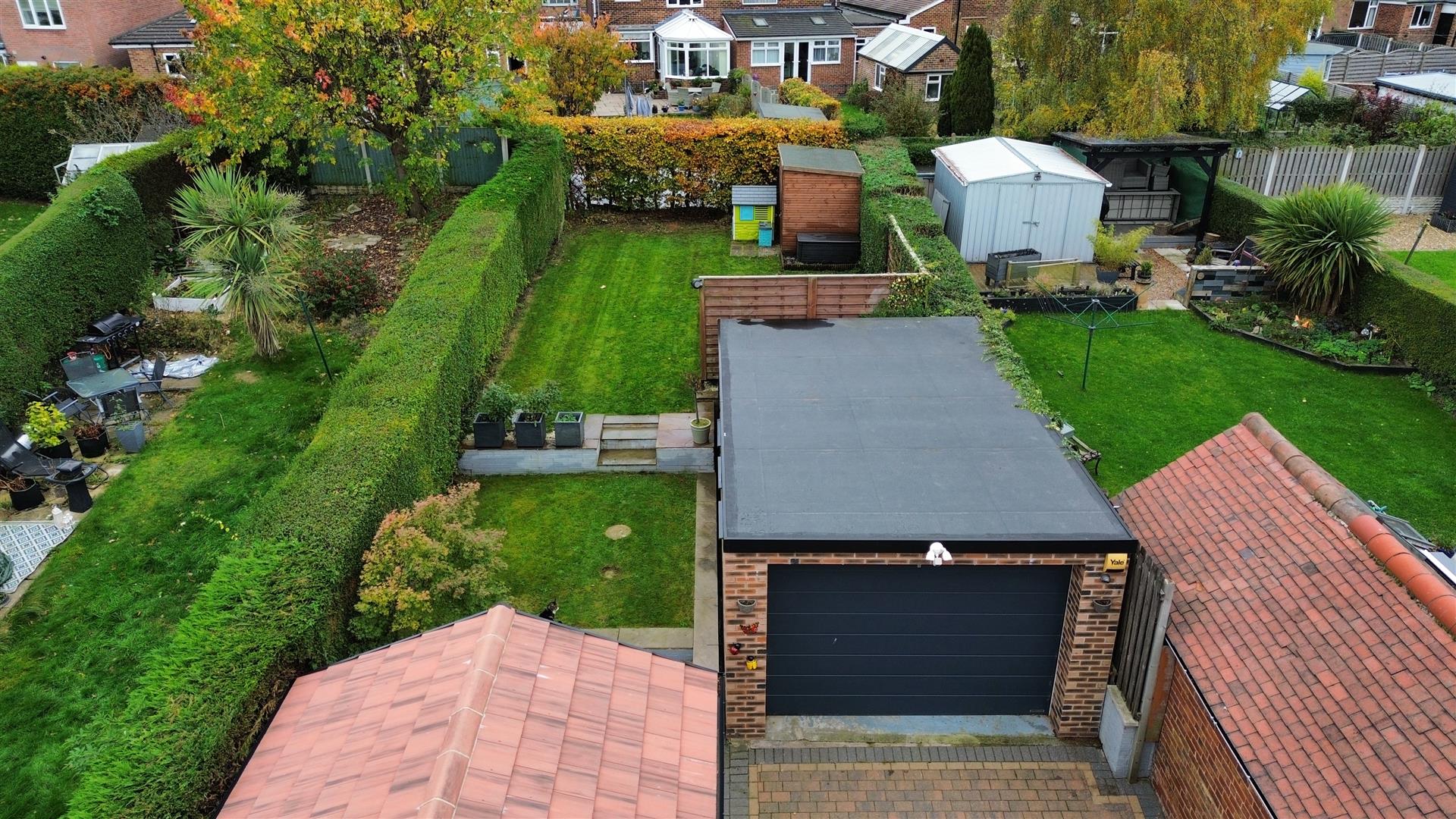 The front of the property features slate chippings and a brick-paved driveway leading to secure electric gates. The driveway continues behind to the rear, where there is a detached garage, a lawn, decking, and a shed. The garden is enclosed with hedging to the boundary.