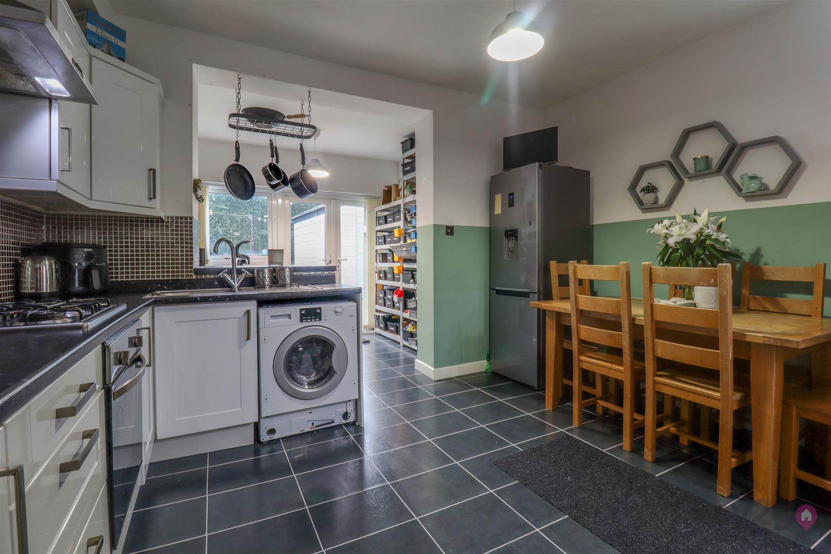 A side entrance leads into a welcoming and spacious hallway with stairs rising to the first floor and a door into the lounge. The lounge is cosy and bright, featuring a walk-in bay window to the front. To the rear is an extended kitchen/diner offering additional space ideal for seating or a home office. The modern kitchen benefits from a large understairs storage cupboard and provides access to the rear garden.