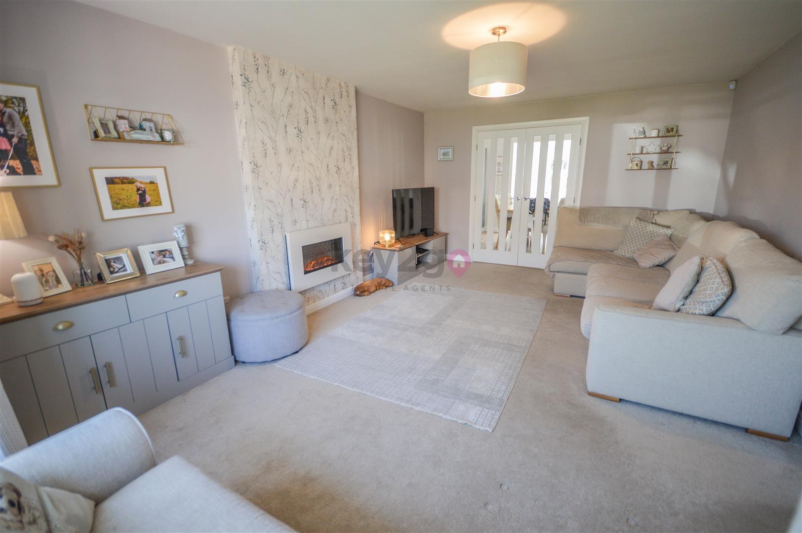 A spacious reception room with carpeted flooring, a feature wallpapered chimney breast and a feature fireplace with an electric fire. Ceiling light, radiator and walk in bay window to the front. Double doors to the kitchen/diner.