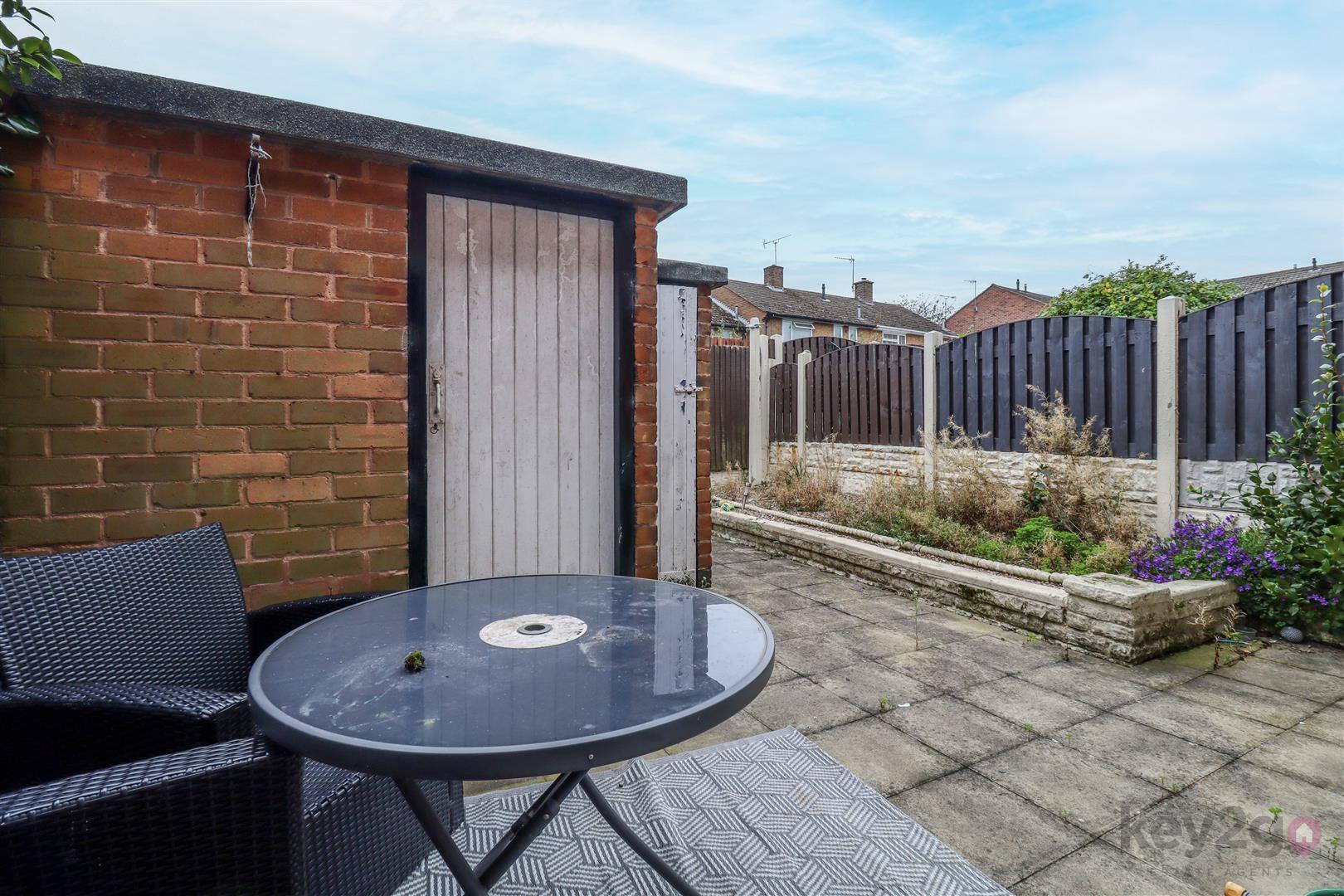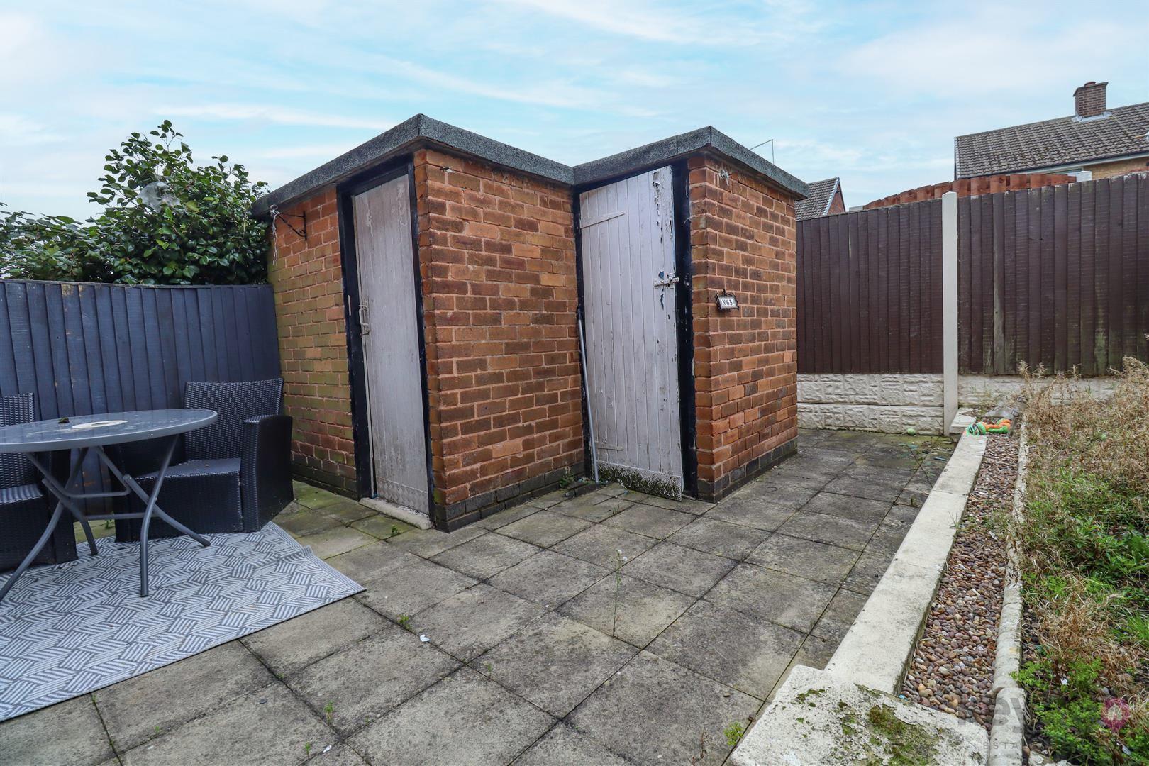 having a lawn to the front with a garden path. The rear features a patio area, flower beds, brick-built outhouses, and a pathway giving access to the front.