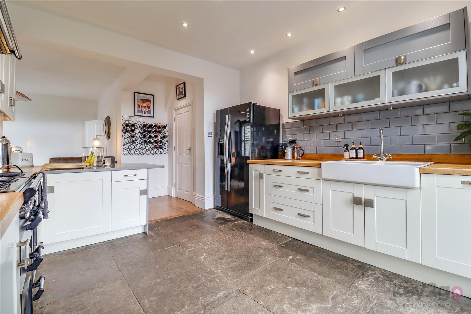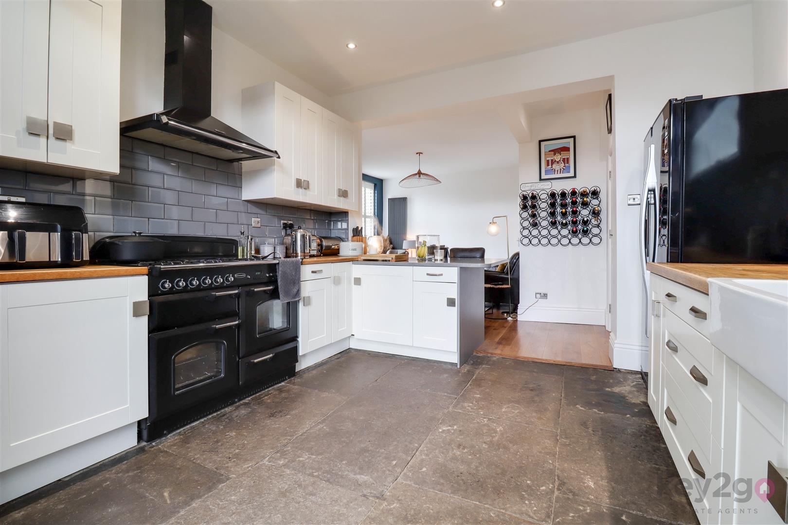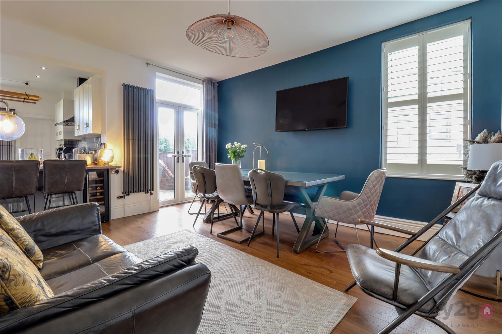 Entrance is via a composite door into a welcoming hallway, boasting in character with a range of original features. A door leads through to the lounge with solid oak flooring, a warm and inviting space featuring a log burner and a window fitted with stylish shutter blinds. To the rear, the property opens into a stunning open-plan kitchen/diner, thoughtfully designed to blend modern style with period charm. The space has a unique combination of laminate and original 1900s stone flooring, adding both character and practicality. Patio doors lead out to a small decked area, while a second set of patio doors opens onto the rear garden. Additional doors from the kitchen provide access to the cellar, as well as a useful utility space and a convenient downstairs WC.