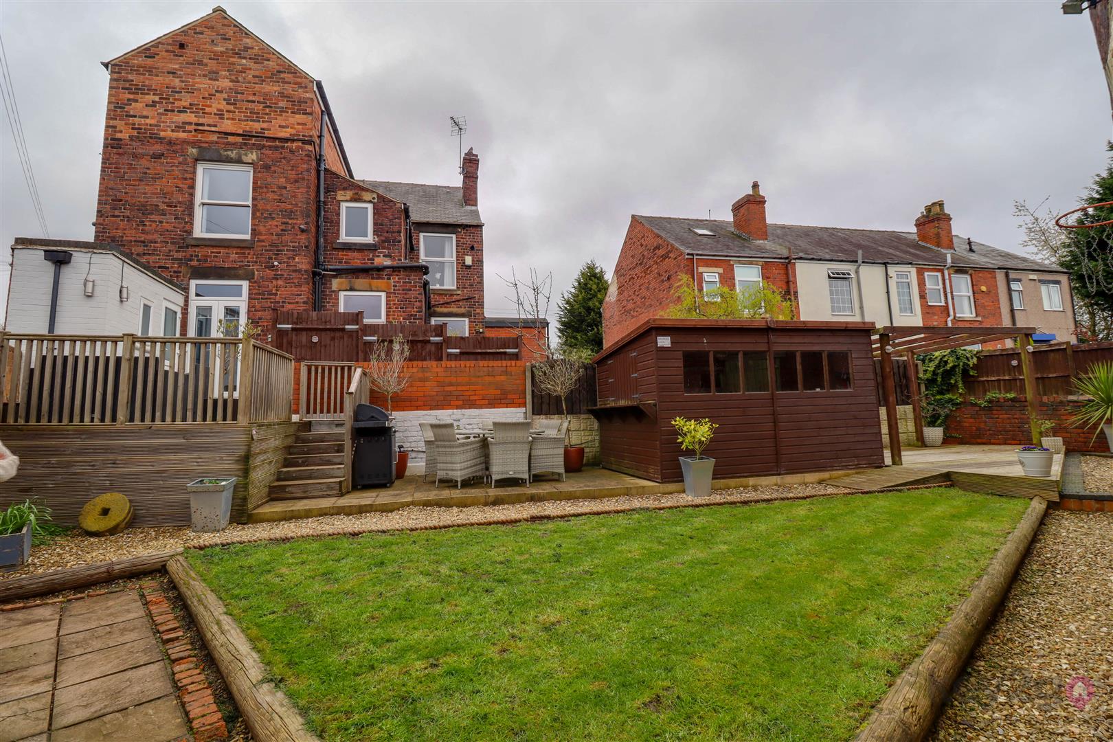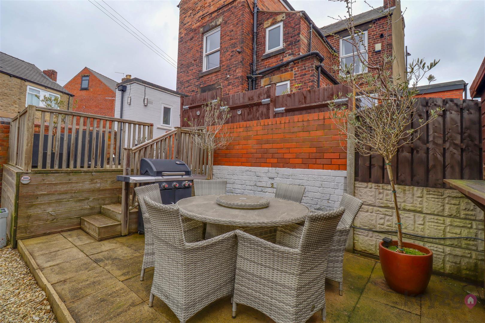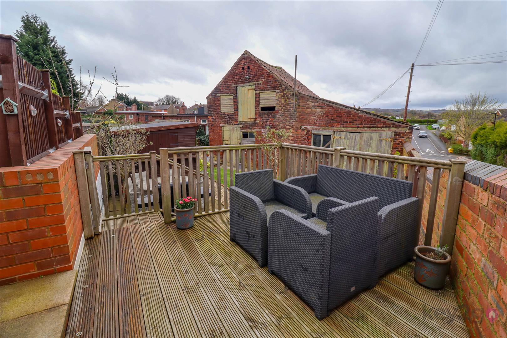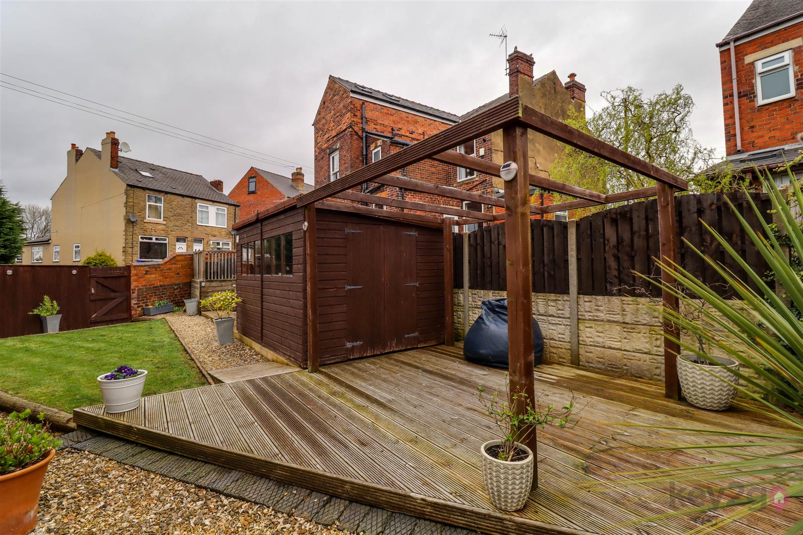 To the rear, the property boasts a generous tiered and fully enclosed garden, thoughtfully designed to provide a variety of outdoor spaces. These include two decked seating areas, a lawn, a pebbled section, and a garden shed currently utilised as a bar—ideal for entertaining. In addition, there are two substantial outhouses, presenting excellent potential for a range of uses.