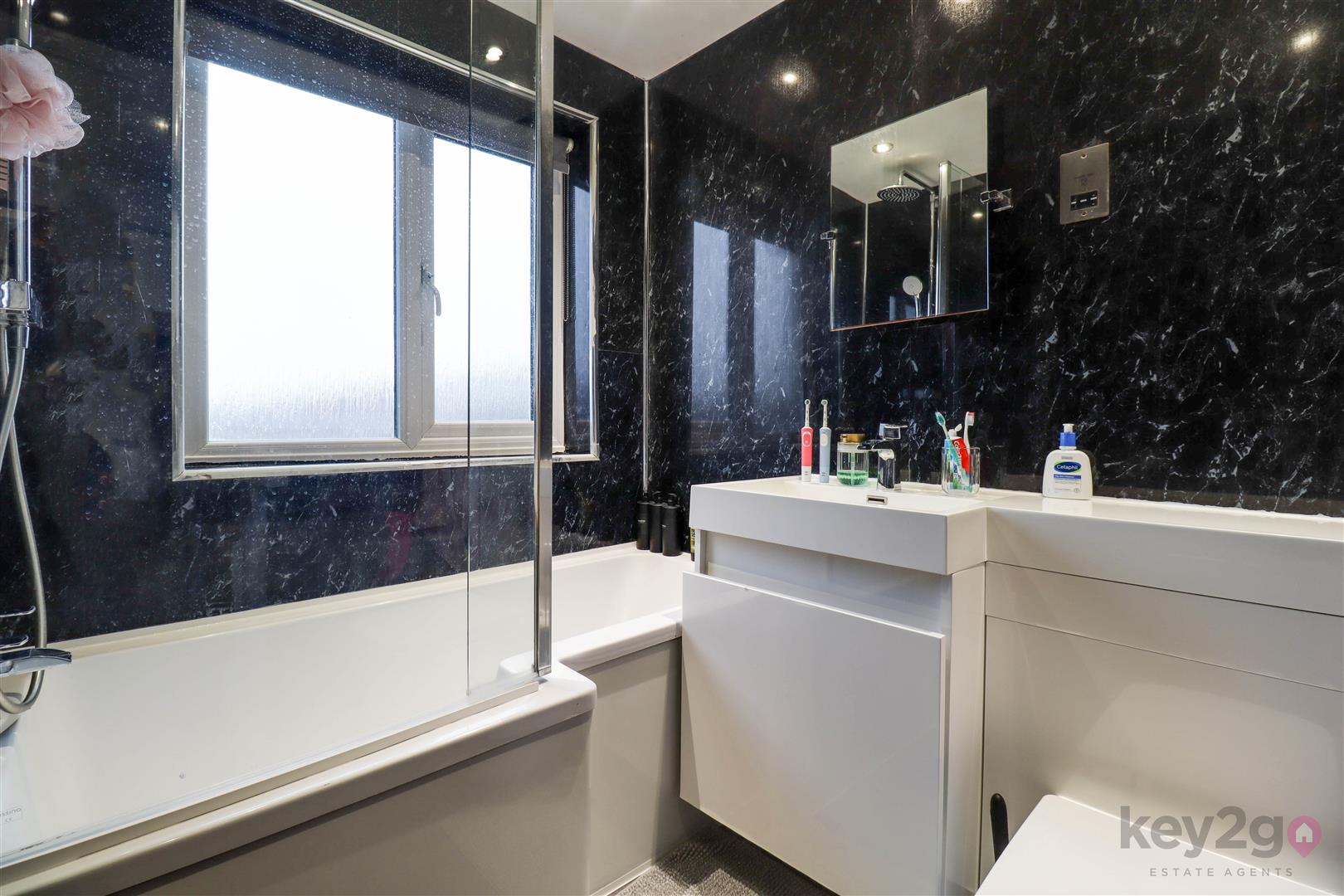 A good-sized, bright double bedroom is located to the front of the property. The second double bedroom sits to the rear and benefits from a cupboard housing the boiler. There is a single bedroom to the front. The bathroom is positioned to the rear and features a ‘P’-shaped bath with overhead shower, vanity wash basin and a back-to-wall WC, with acrylic wall panelling and an obscure window.