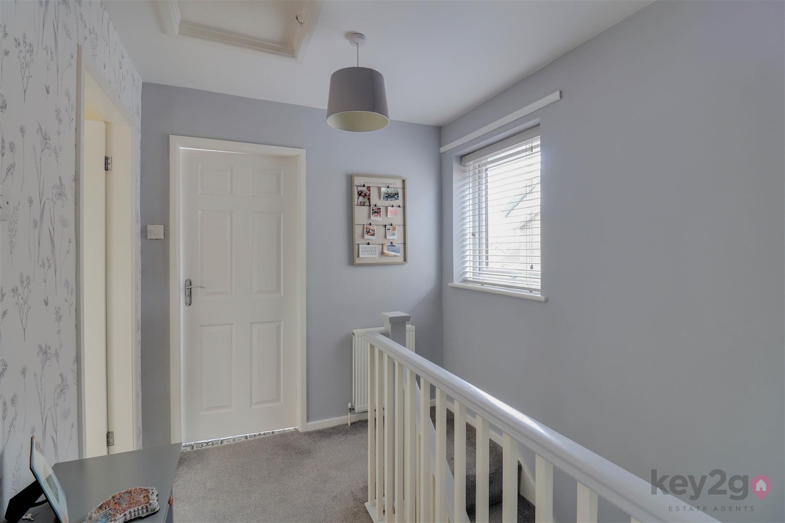 Stairs rise to the first-floor landing with doors leading to the three bedrooms and the bathroom. Bedroom one is a double bedroom with a window overlooking the front. Bedroom two is also a double bedroom, benefiting from a storage cupboard and a window overlooking the rear. Bedroom three is a single bedroom, currently used as an office, with a window to the front. The bathroom is modern and fitted with a bath with an overhead shower, a vanity unit with a wash basin, and a WC.
