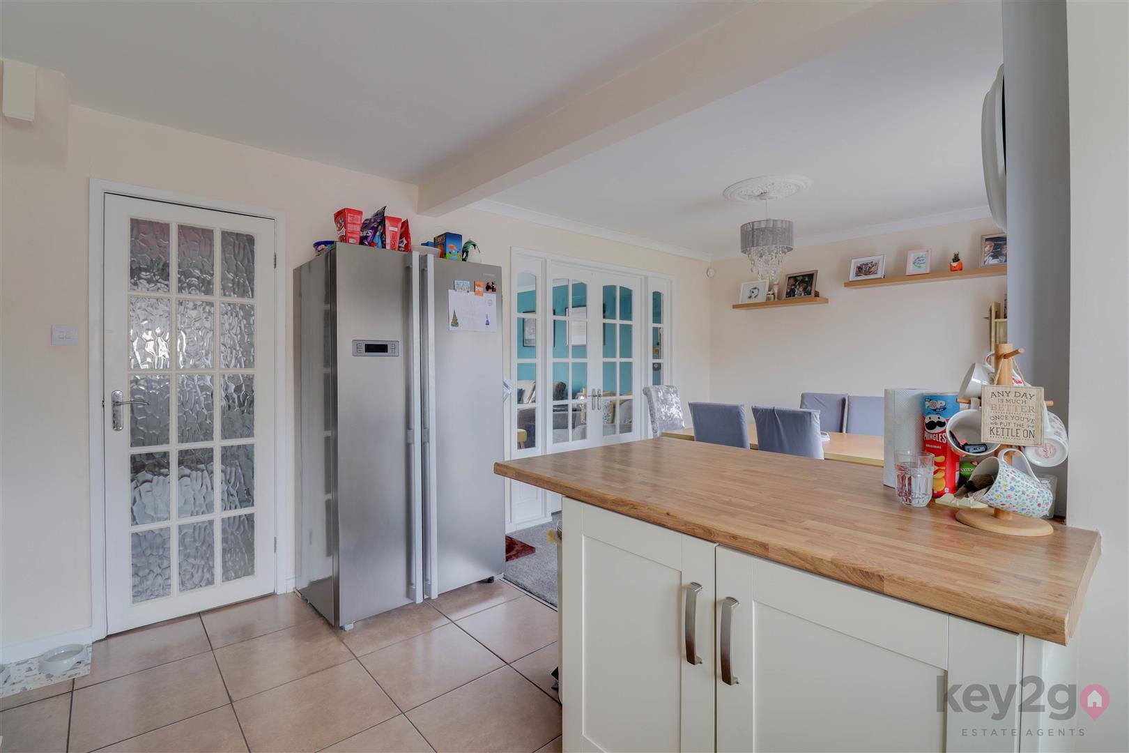 Enter into the welcoming hallway with stairs rising to the first floor and doors leading to the kitchen/diner, lounge and downstairs WC. The lounge is bright and spacious, with a large window to the front and double doors leading through to the kitchen/diner.The kitchen/diner is fitted with ample wall and base units, a double oven, hob and extractor fan, and a breakfast bar. There is space for a washing machine, an American-style fridge/freezer, and a dining table. The room also benefits from a door to the rear garden from the kitchen area and a further door to the rear from the dining area. The downstairs WC comprises a WC and wash basin.