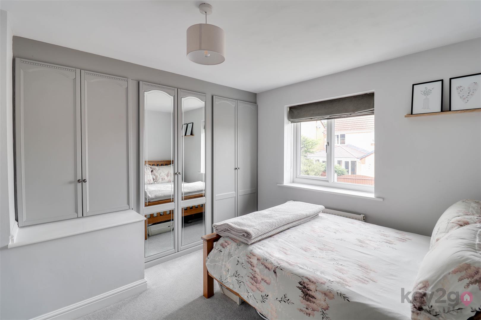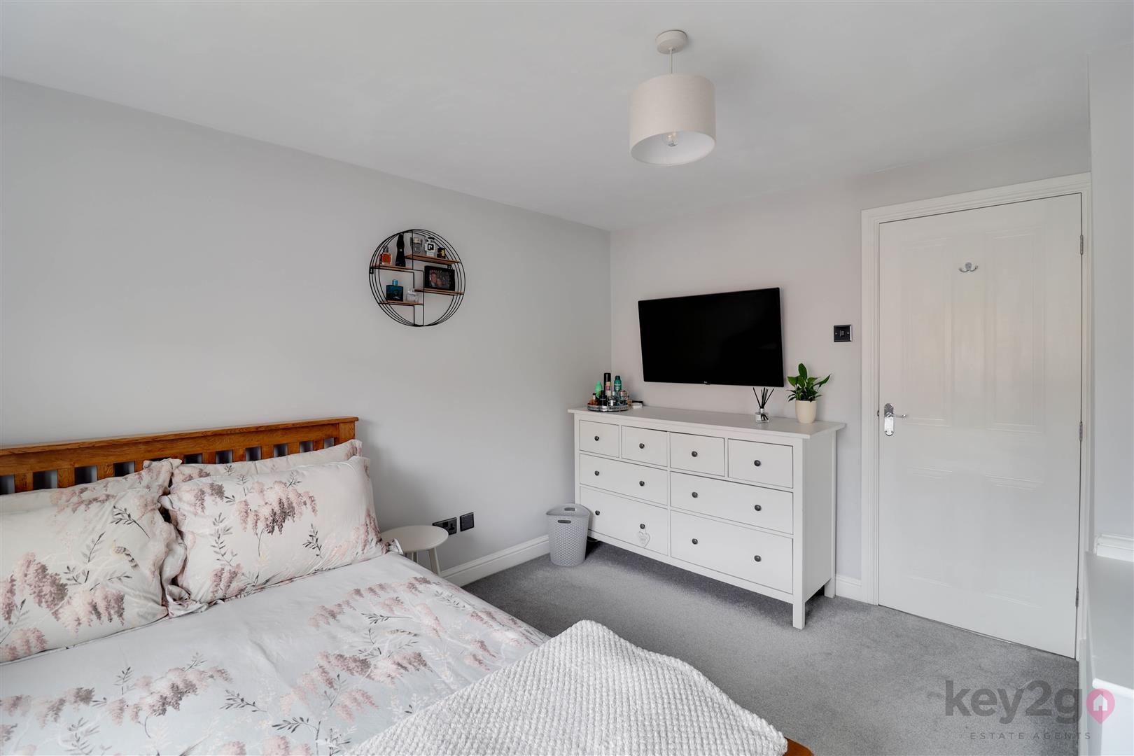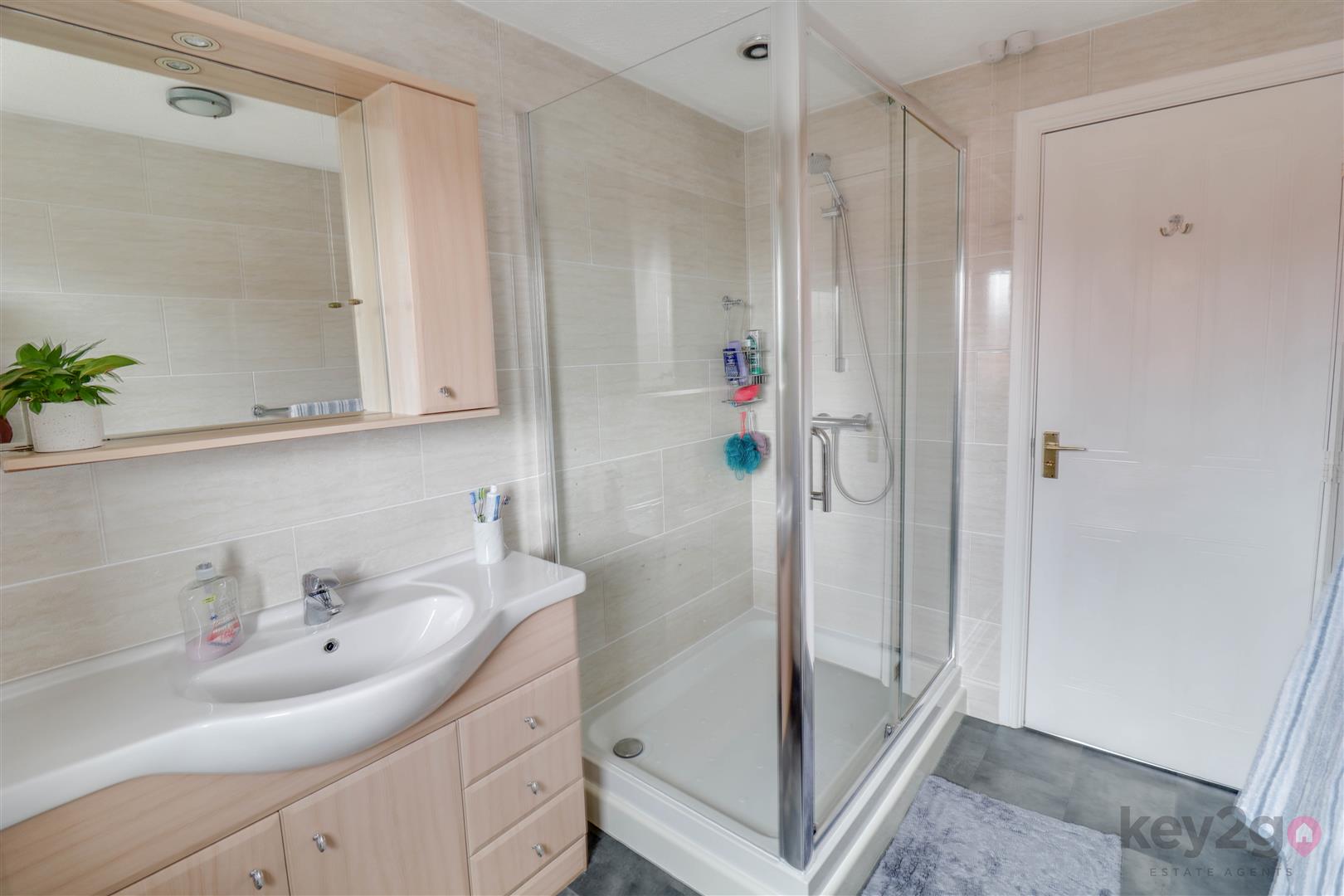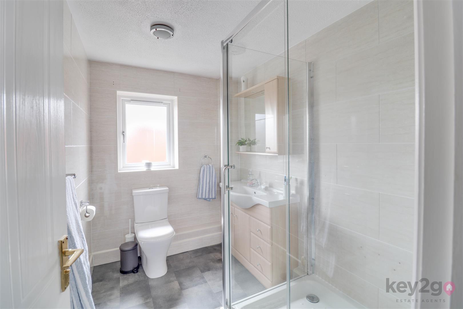 Carpeted stairs with painted décor lead to the first floor, giving access to the bedrooms and bathroom. Bedroom one is a spacious double with carpet flooring, painted décor, a large built-in wardrobe, and a window. Bedroom two is a generous single with neutral décor, laminate flooring, a window, and access to the loft. The stylish bathroom features a large walk-in shower unit with a glass surround and sliding door, a fitted sink unit with storage, and a close-coupled WC.