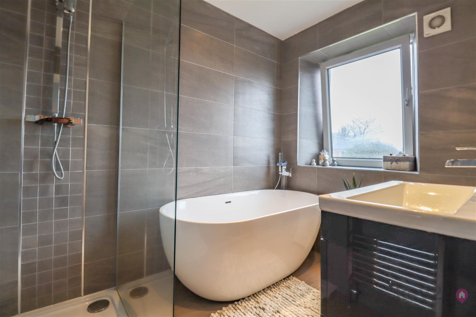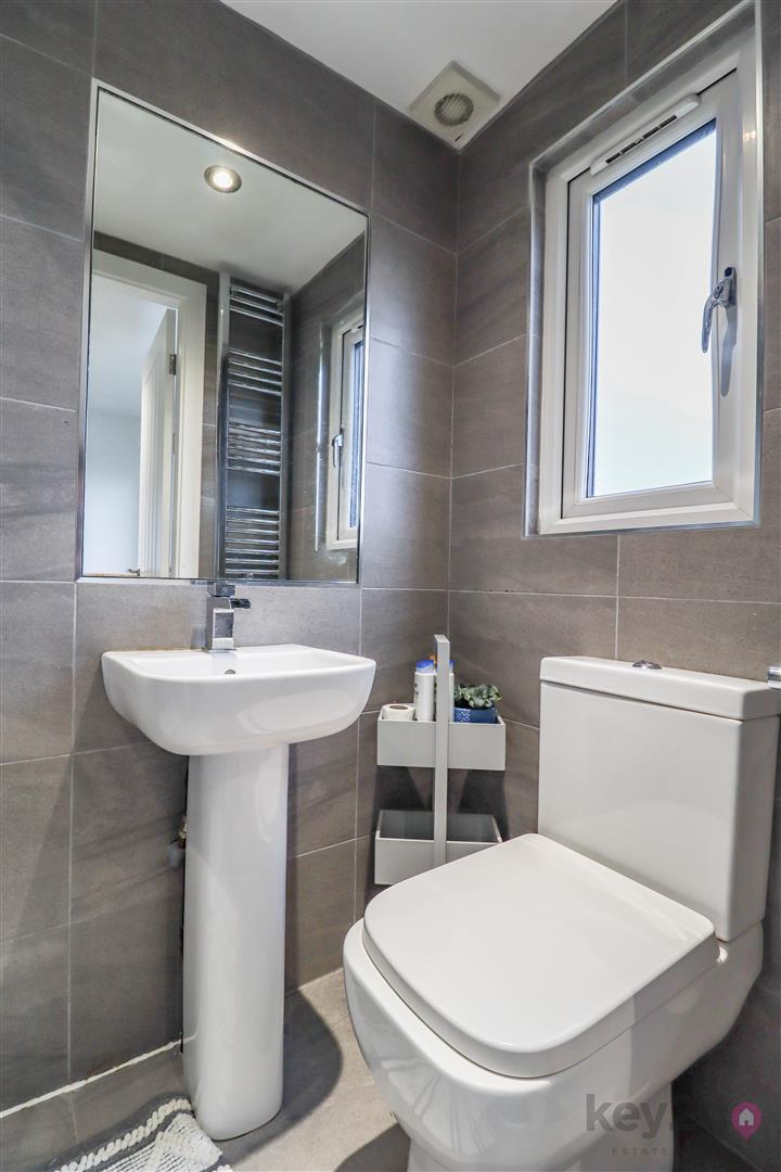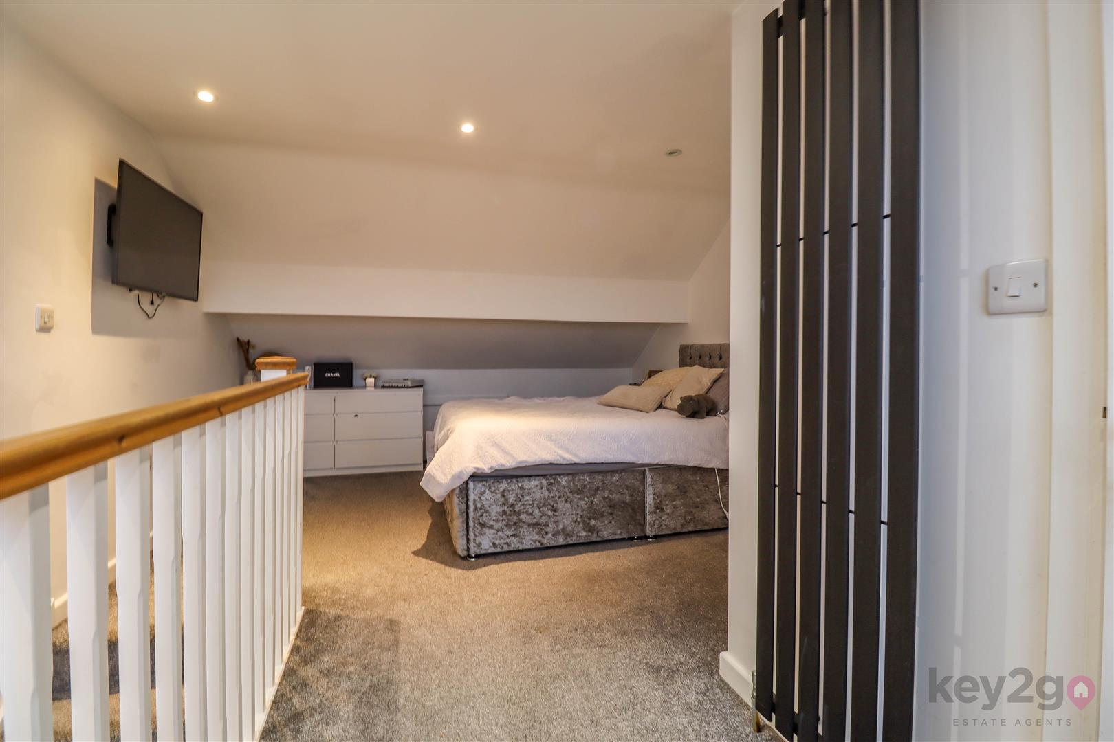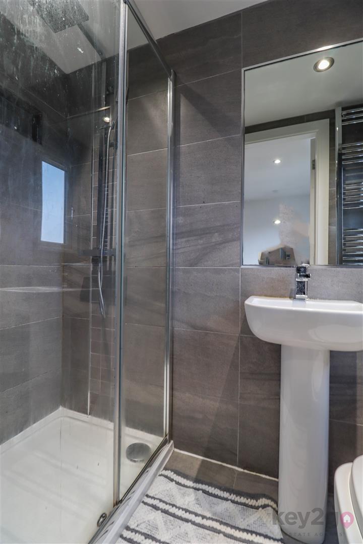 Stairs rise to the second-floor bedroom, which is a large room featuring a rear-facing dormer window and useful eaves storage. The bedroom also benefits from access to an en-suite, fitted with a walk-in shower, pedestal sink and low-flush WC.