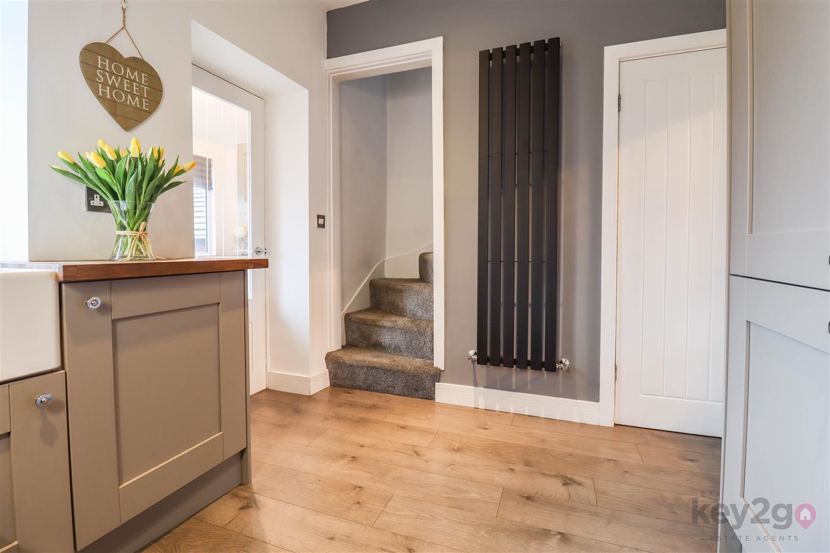 The ground floor comprises a bright living area with a front-facing window and a feature chimney breast. To the rear is a modern shaker-style kitchen with solid wood worktops and a Belfast sink, enjoying views over the rear garden. There is access to the cellar head and stairs rising to the first floor. A useful utility area provides additional storage and gives access out to the rear garden.