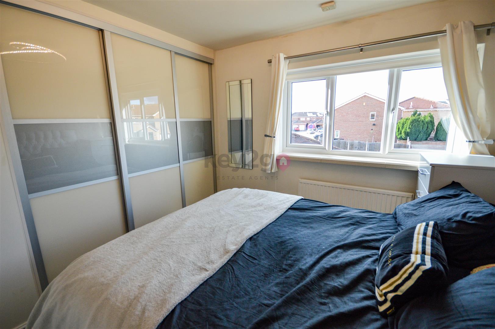 A second double bedroom with neutral decor, carpeted flooring and fitted wardrobes. Ceiling light, radiator and window to the rear.
