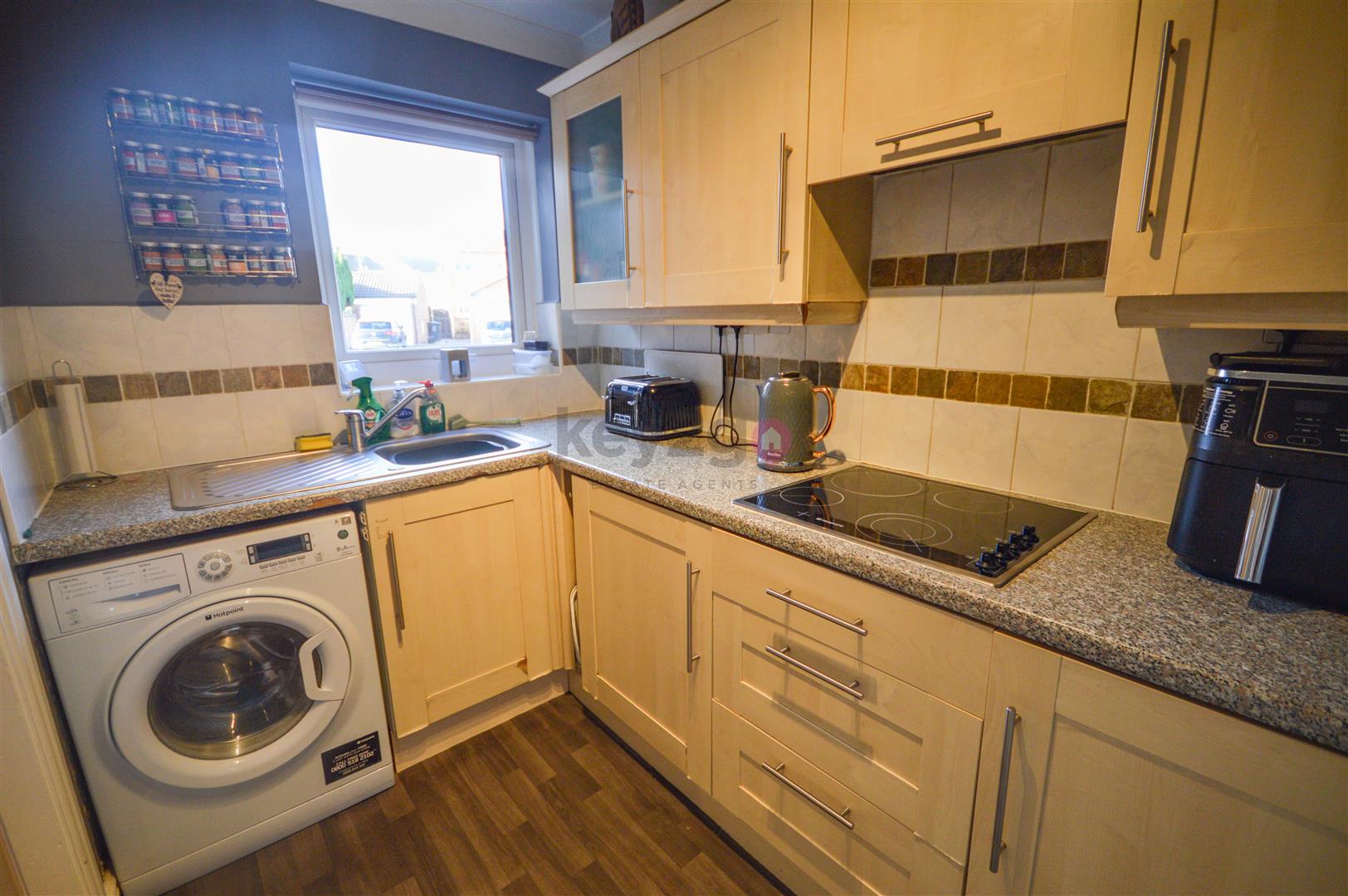 Fitted with wall and base units, contrasting worktops and tiled splash back. Stainless steel sink with a drainer. Oven, hob and extractor fan. Integrated fridge and under counter space for a washing machine. Ceiling light, radiator, window to the front and vinyl flooring.