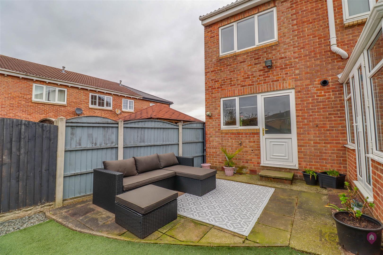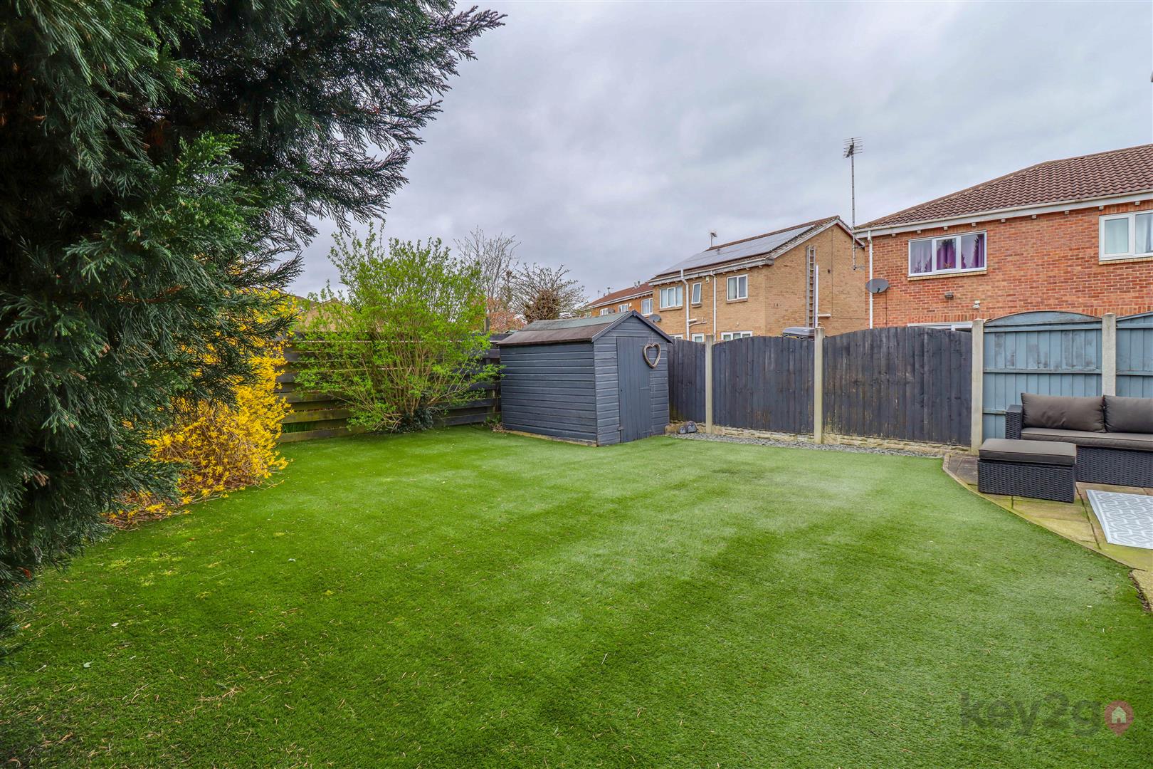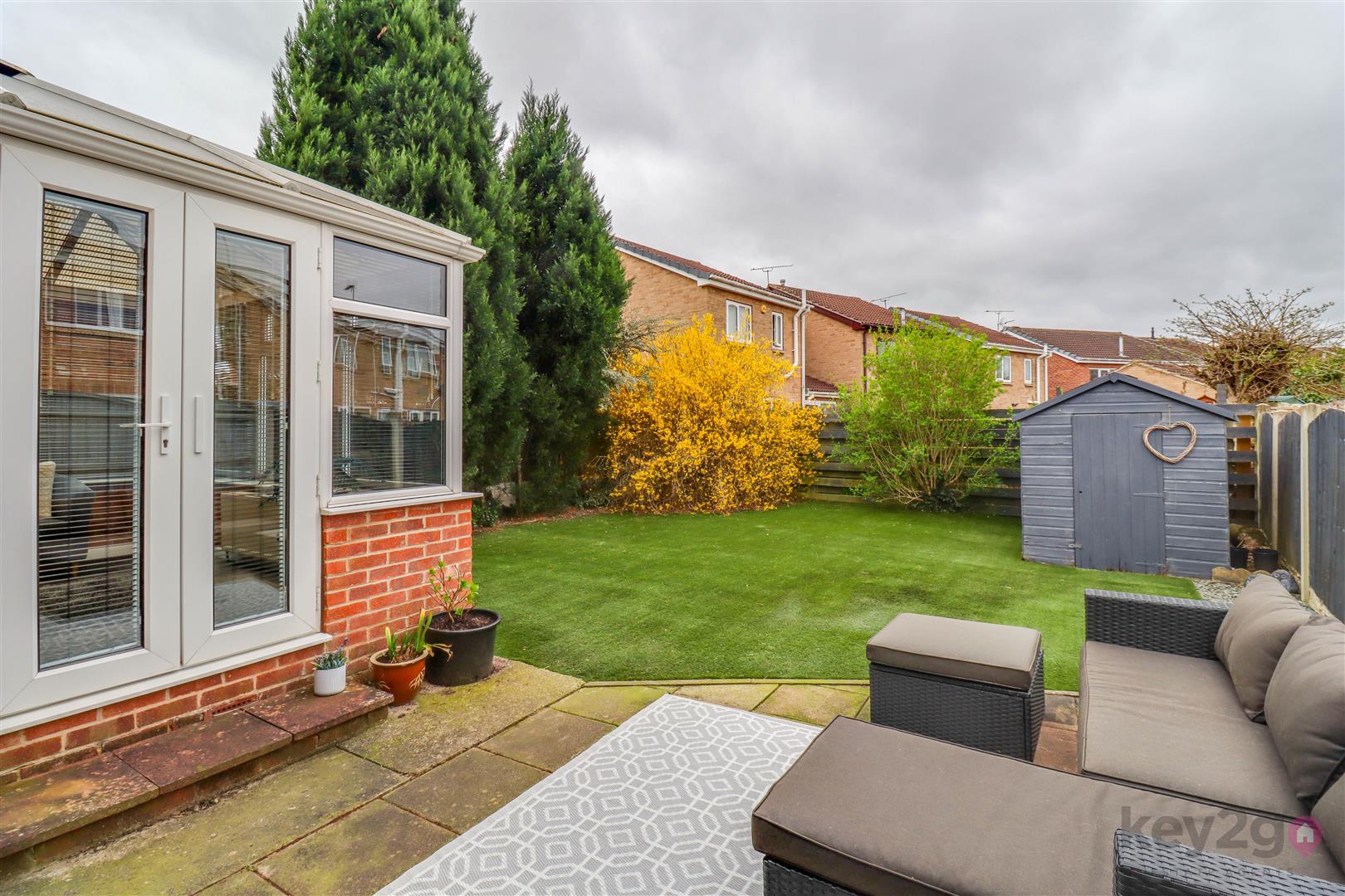 The rear garden has been thoughtfully arranged to offer a low-maintenance outdoor space, featuring a patio area, alongside an artificial lawn. There is also a useful garden shed, with mature shrubbery, hedging, and fencing to the boundaries, creating a pleasant and private setting.