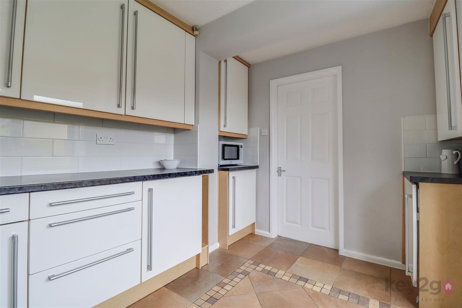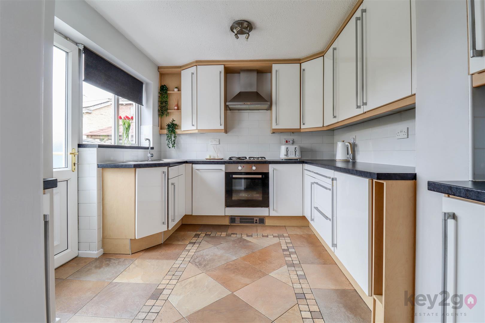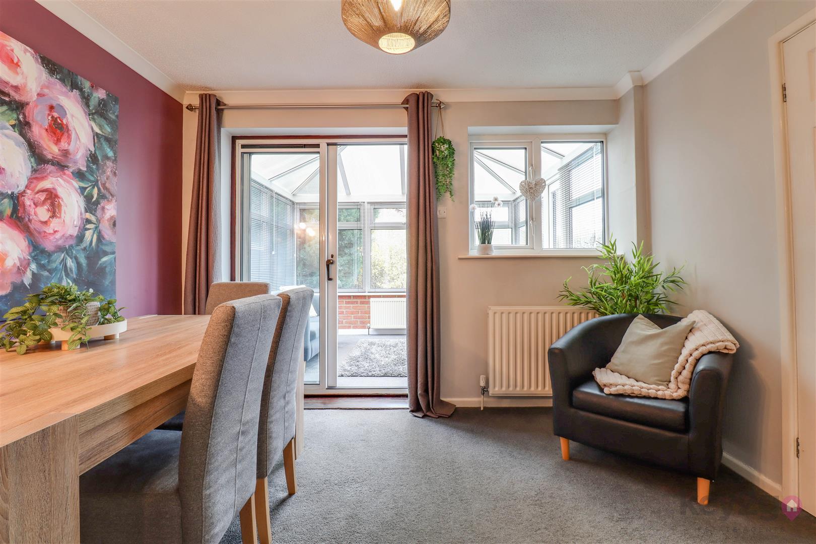 The dining room flows seamlessly into a spacious conservatory, offering a light-filled additional living area with views over the rear garden. It also connects to the modern kitchen, which is fitted with a range of wall and base units, providing ample storage and workspace. Both the conservatory and kitchen benefit from direct access to the rear garden.