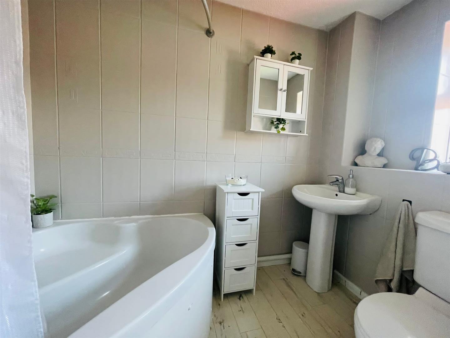The property features a bright double bedroom with a window, electric heater and neutral décor, along with a bathroom fitted with tiled walls, a bath, pedestal sink and WC.