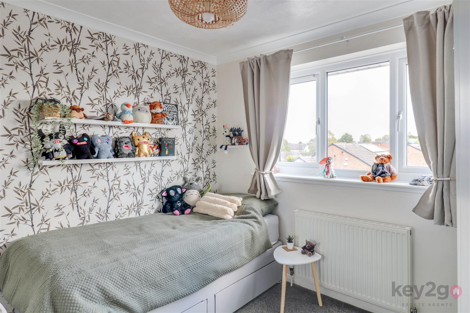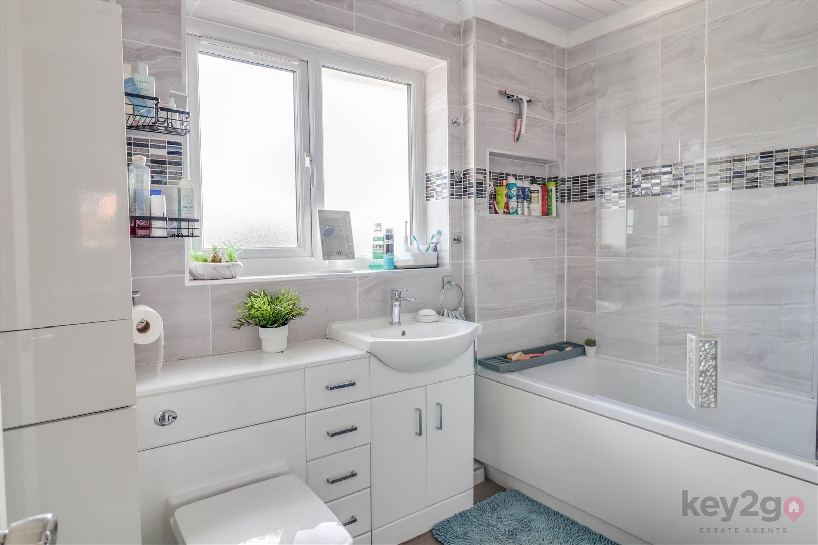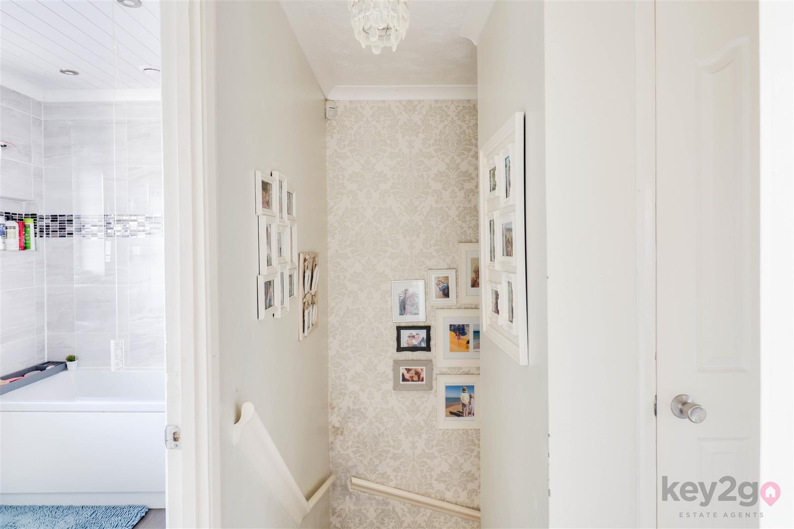 Carpeted stairs with handrail lead up to the first-floor landing, where there is a large storage cupboard. The first bedroom is a spacious double, carpeted with a window and two feature wallpapered walls. The second bedroom is also a double, with carpet, window, and two feature wallpapered walls. The third bedroom is a generous single or small double, neutrally decorated with a wallpapered feature wall, carpet, and window. The bathroom is modern and stylish, fully tiled and fitted with a large storage unit incorporating the WC and sink, a bath with shower over, and a window for natural light.