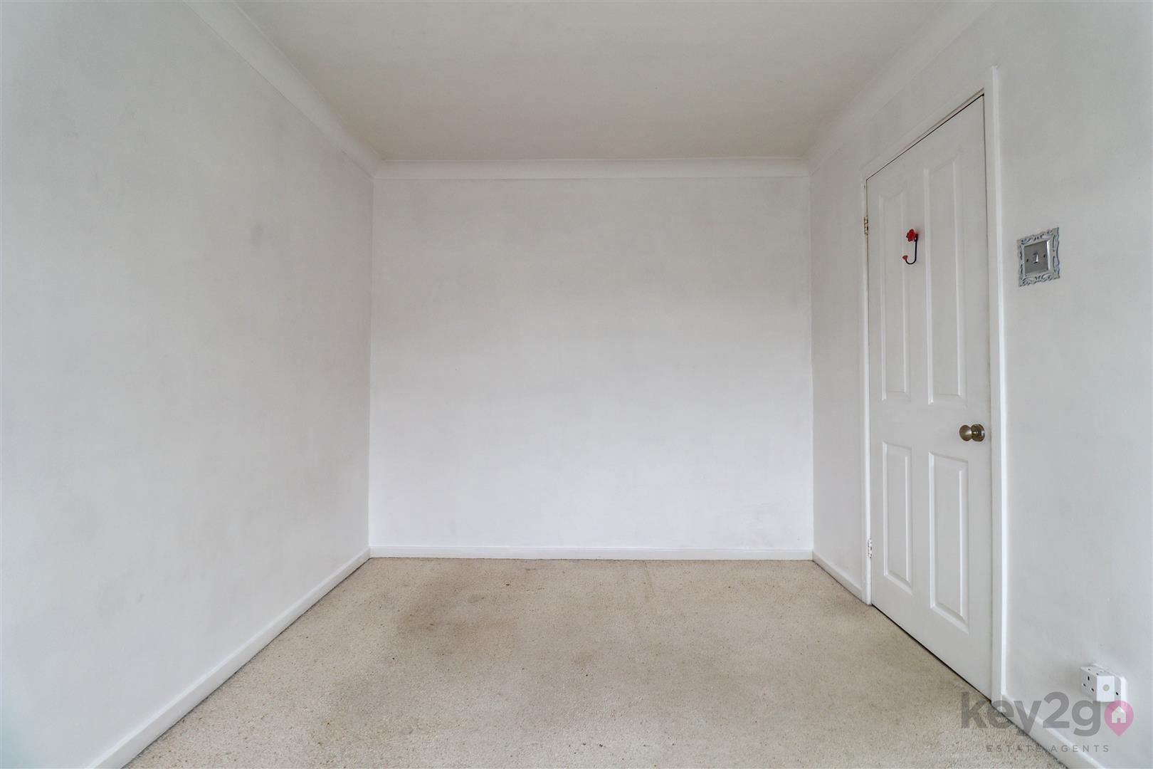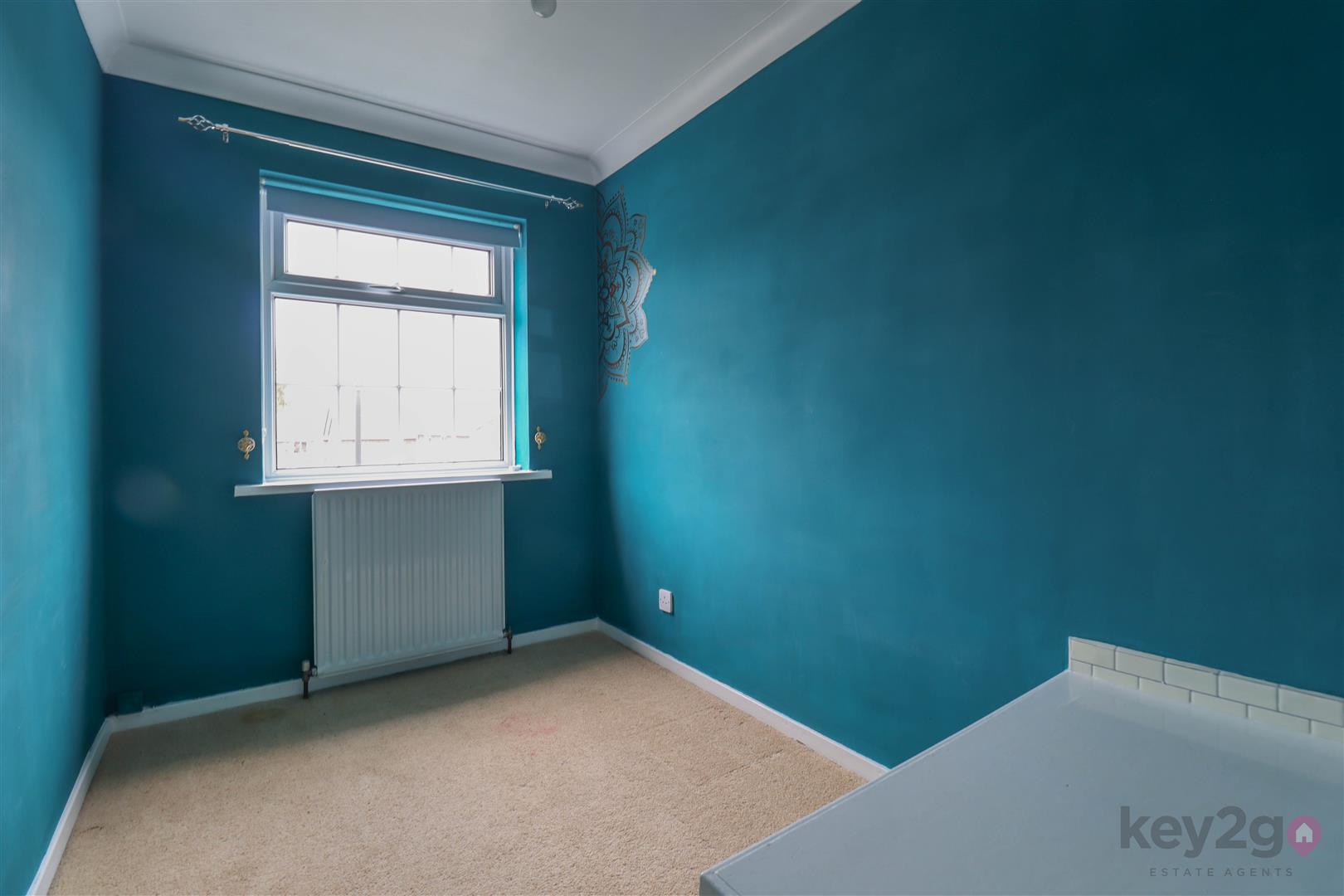 A fourth bedroom with carpeted flooring and painted walls. Ceiling light, radiator and window.