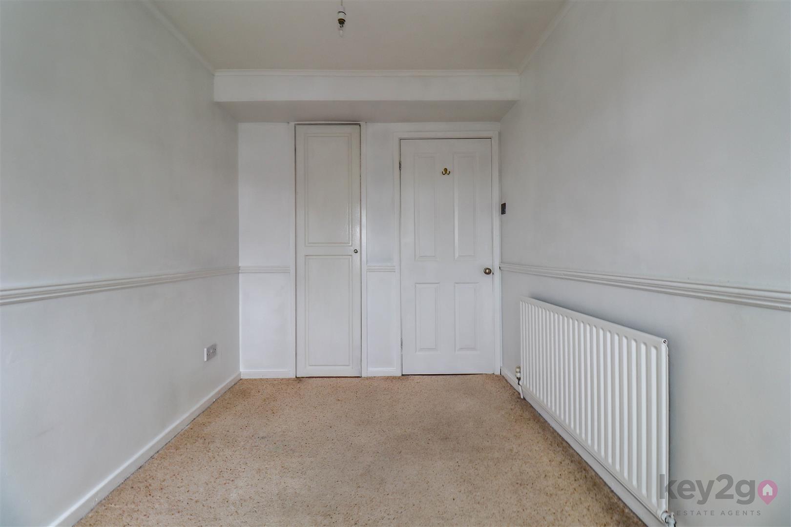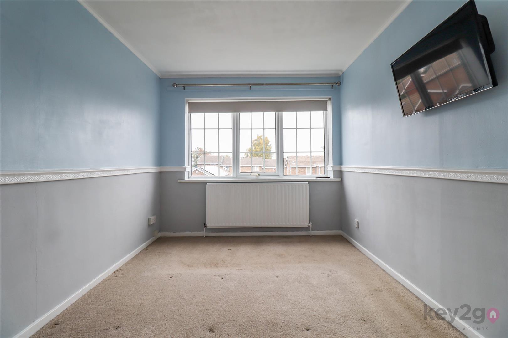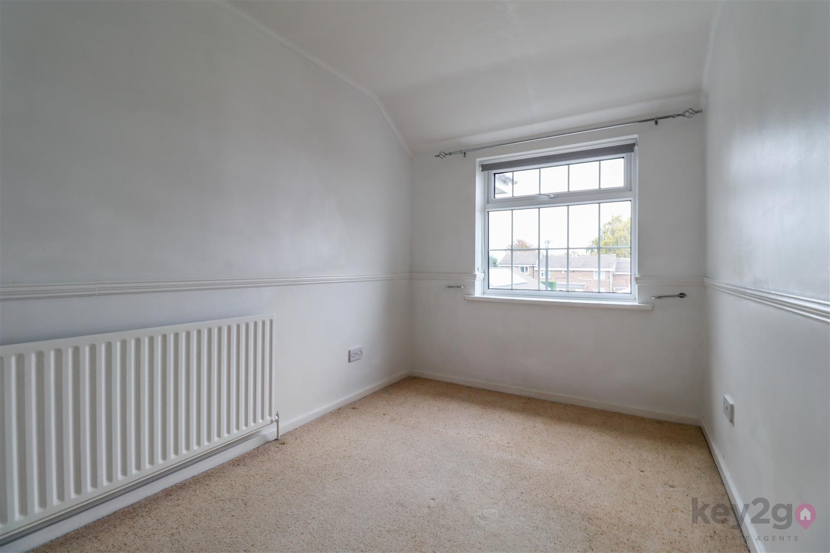 A third bedroom with carpeted flooring and painted walls. Ceiling light, radiator and window.