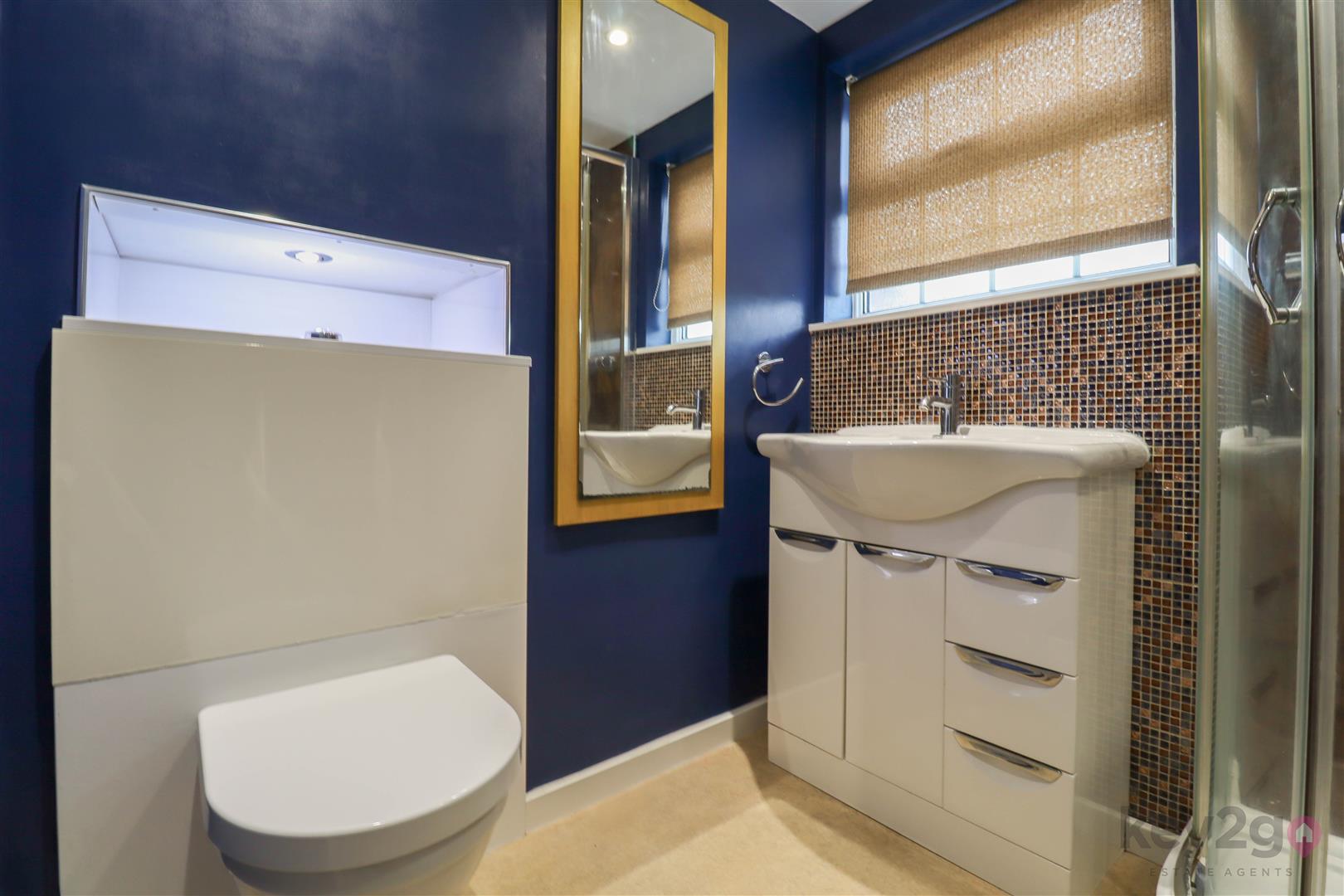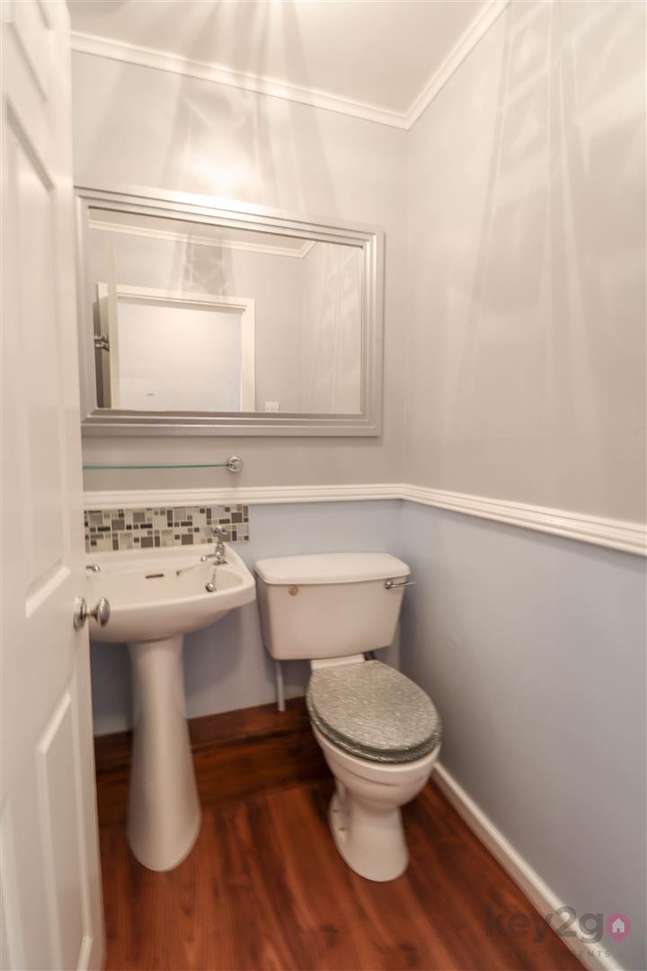 Comprising of a WC, pedestal sink, wood effect flooring and painted walls.