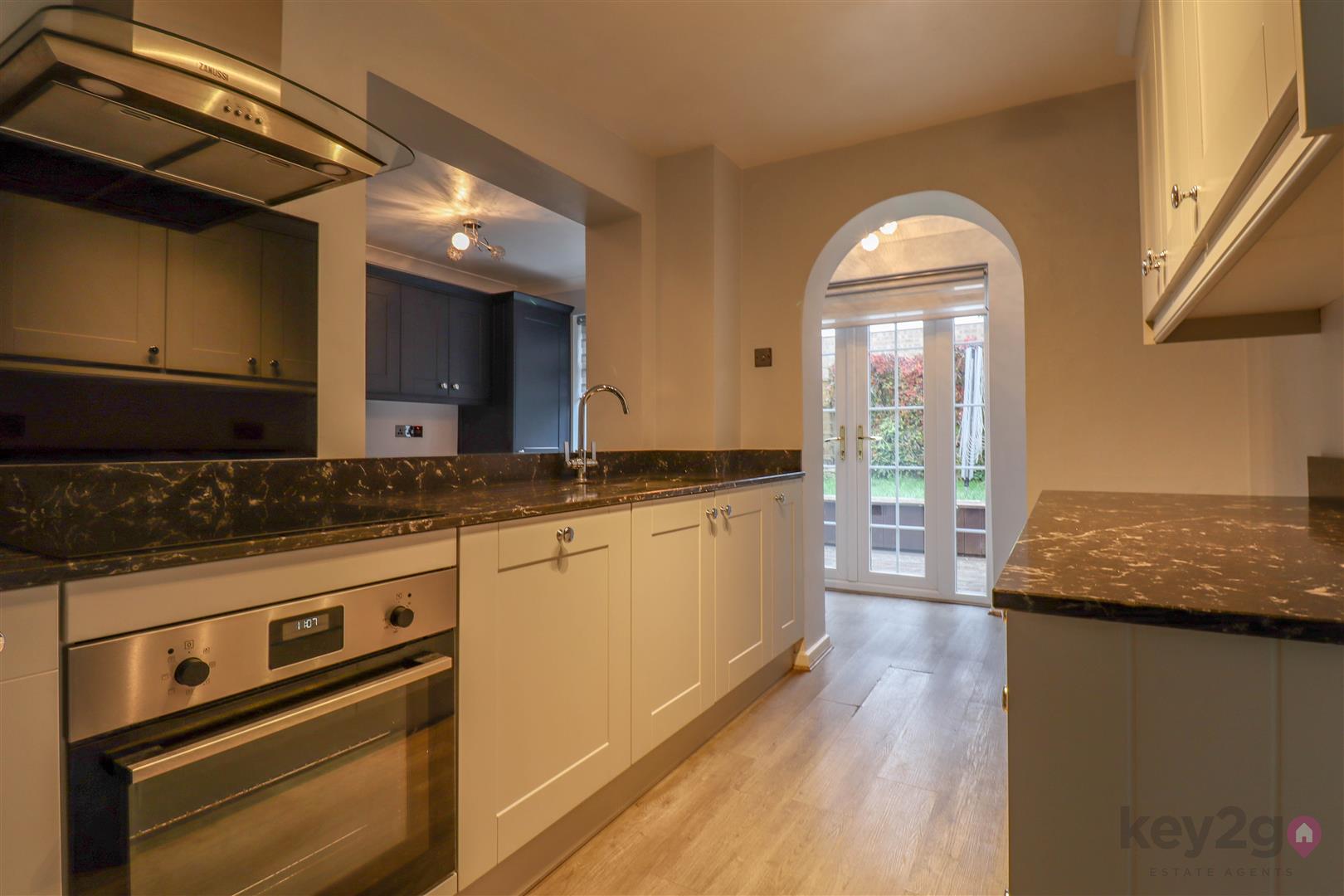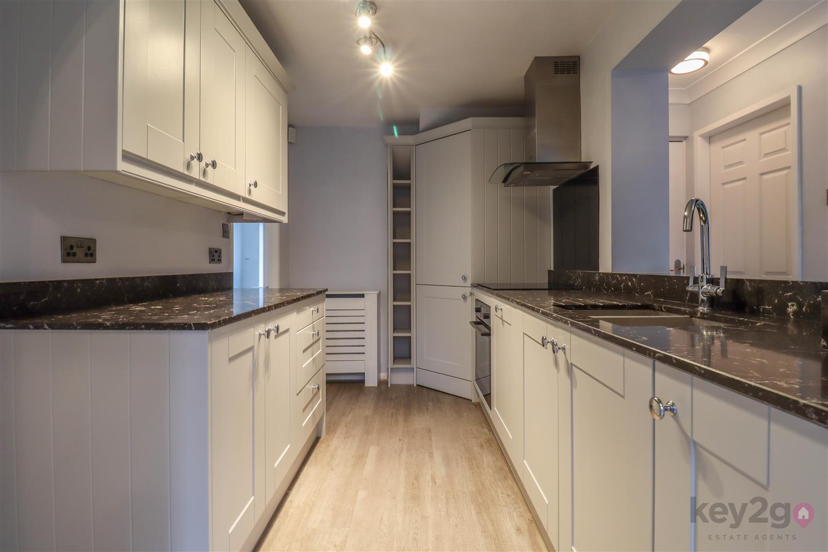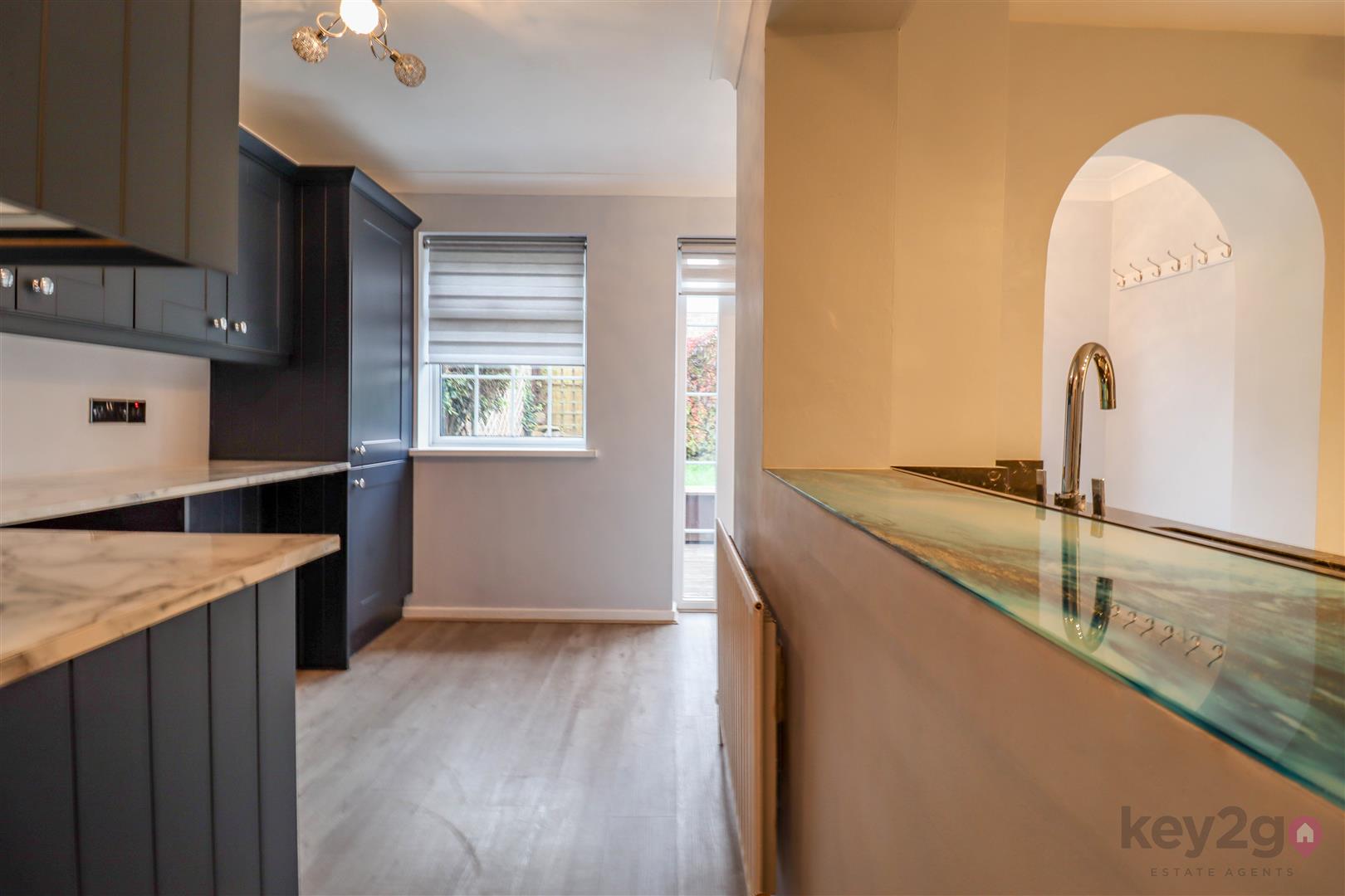 A modern kitchen fitted with wall and base units, quartz worktops and up stands. Oven, ceramic hob and extractor fan. One and a half sunk in sink with a mixer tap. Space for a full height fridge/freezer. Ceiling light, open to the utility area and double doors to the garden.