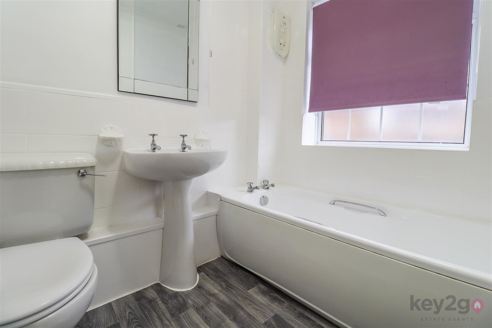 Comprising of a bath, pedestal sink and WC. Tiled walls, vinyl flooring and a window.