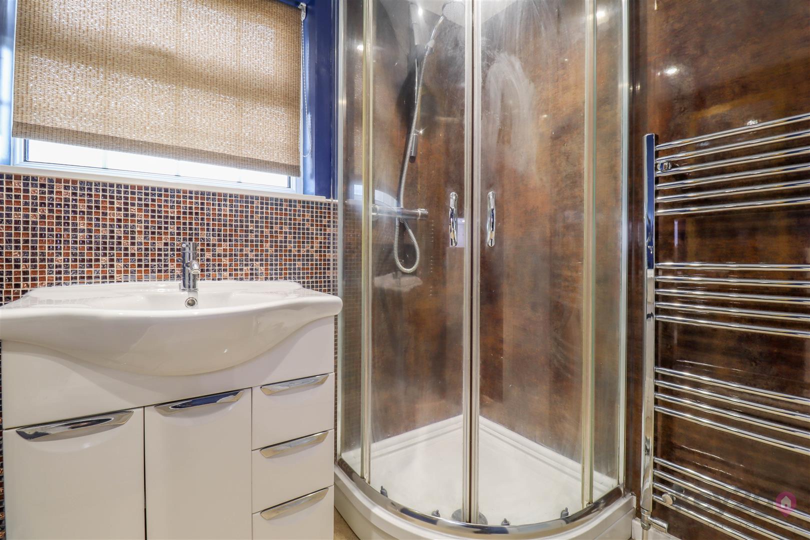 A shower cubicle, WC and sink with storage. Ladder style radiator, window and vinyl flooring.