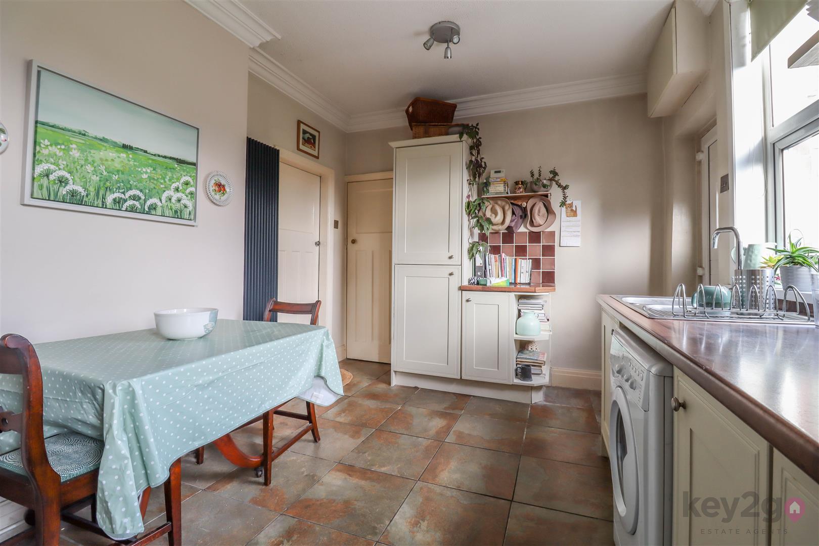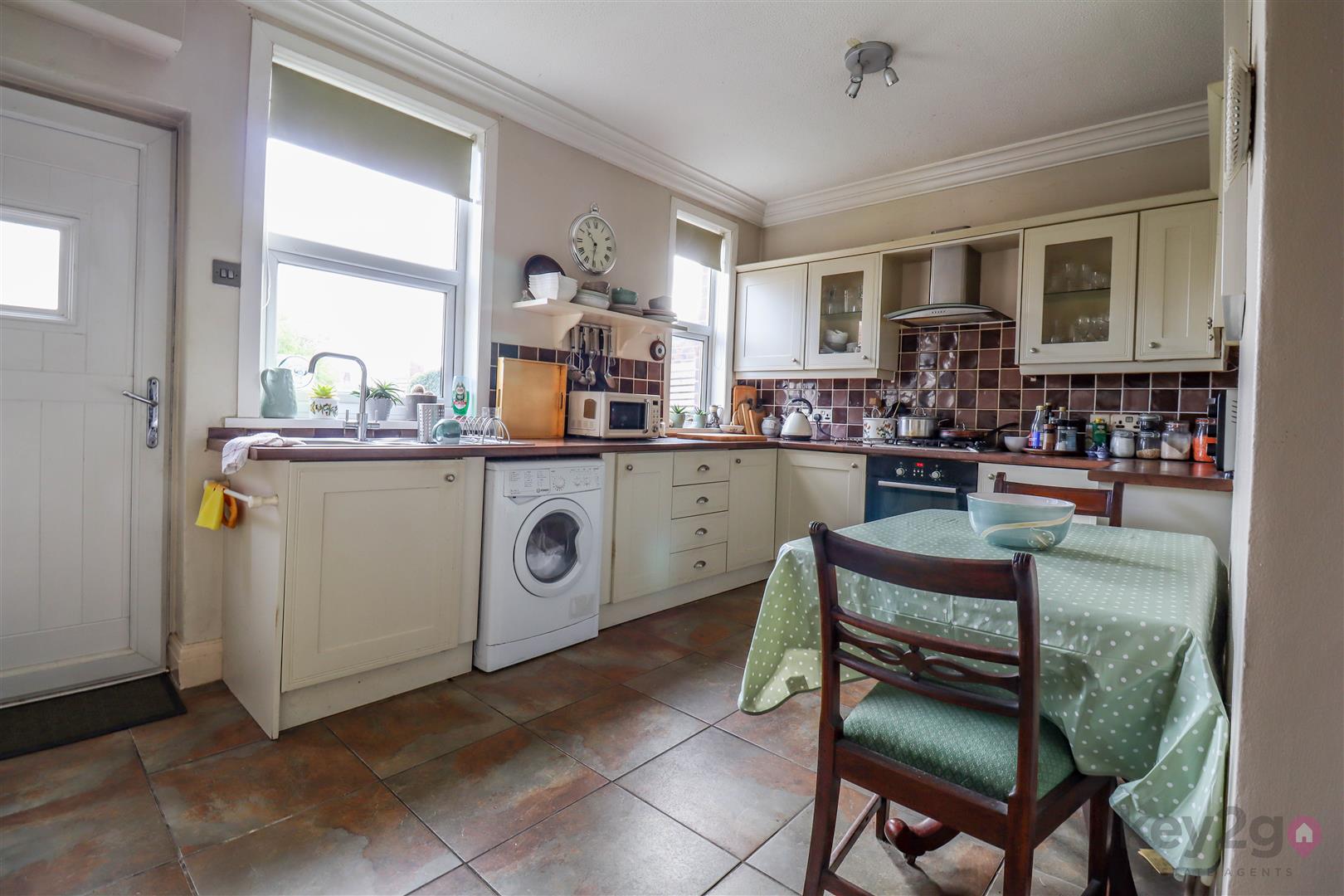 A welcoming entrance hallway with stairs rising to the first floor. The cosy lounge features a front-facing window, while the kitchen/diner offers ample wall and base units, useful understairs storage, and access to the rear garden.