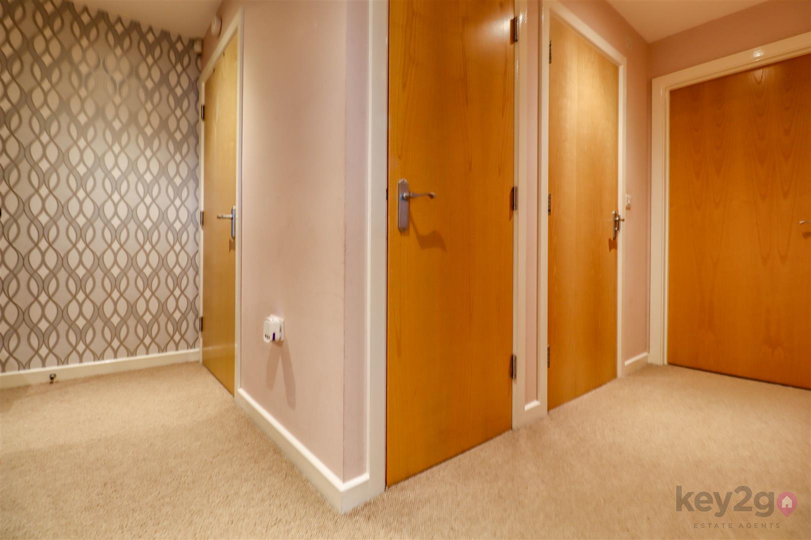 A spacious and welcoming hallway with feature wallpapered wall and carpet flooring. Access to the loft, spotlighting and radiator. Access to the loft, cupboard housing boiler and a second storage cupboard. Doors to the two bedrooms, living space and bathroom.