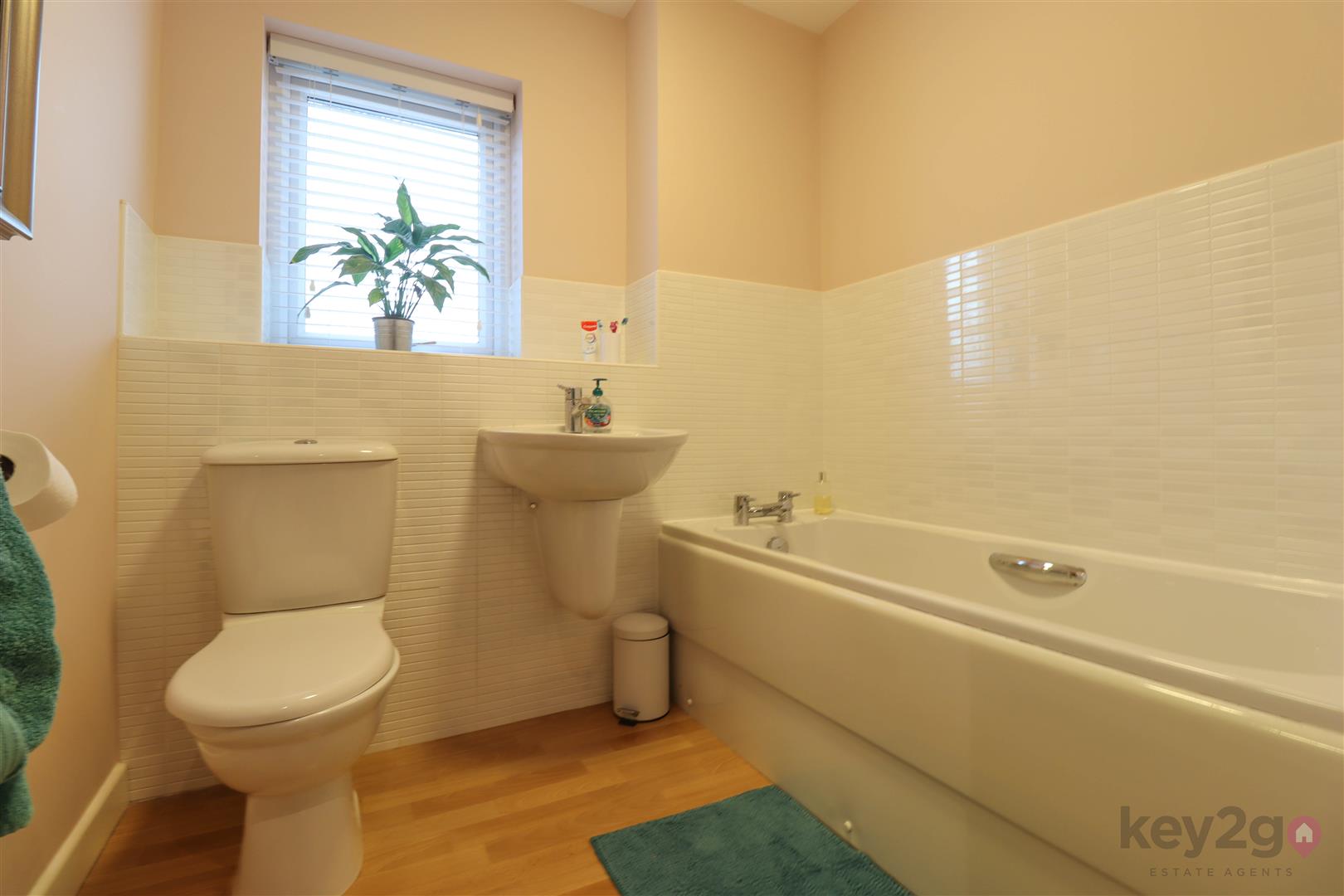 A modern bathroom having bath, floating wash basin and close coupled WC. Ceiling light, radiator and obscure glass window. Part tiled walls and vinyl flooring.