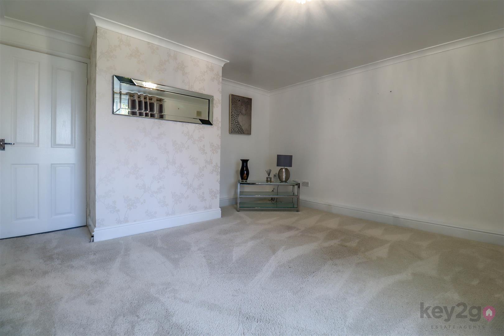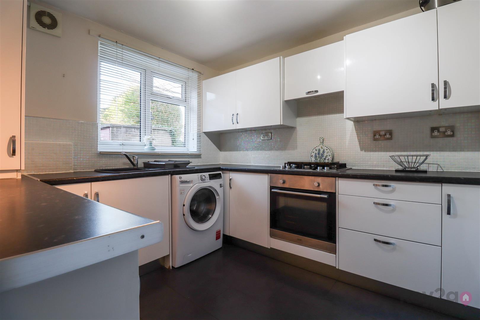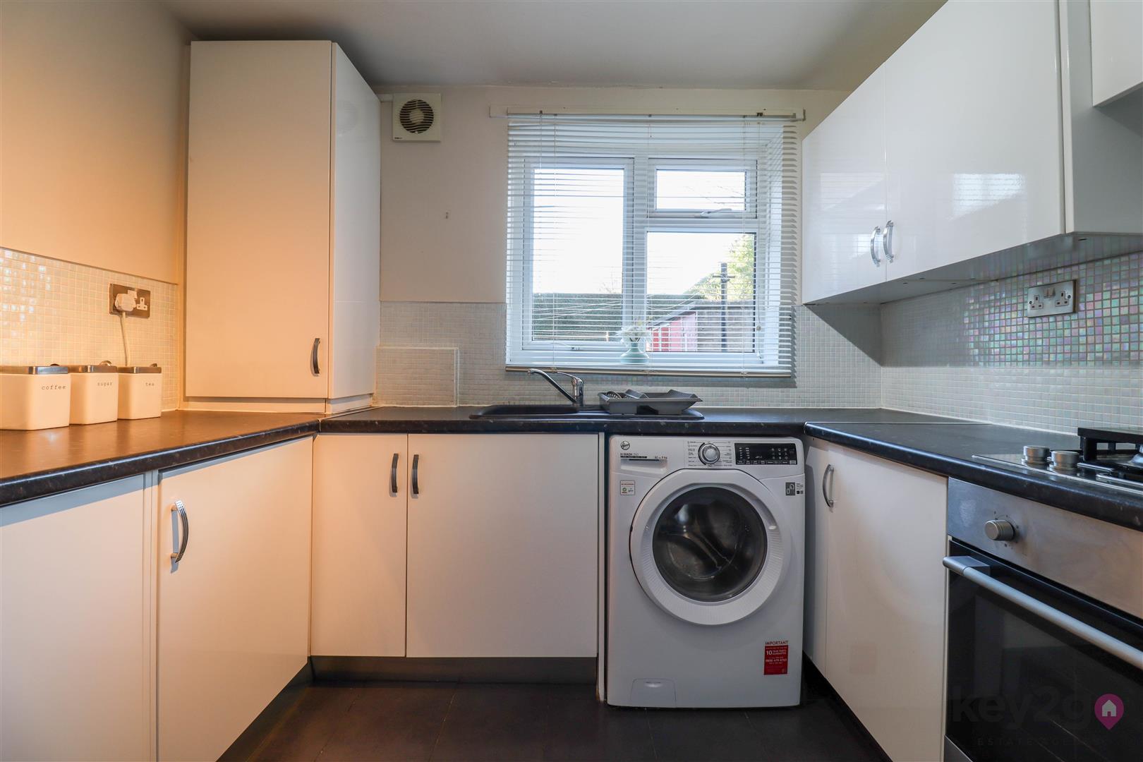 The property benefits from a secure intercom door system and external storage located outside the flat door. A composite door opens into the hallway, providing access to the bright living area with a window to the front and a stylish high-gloss kitchen fitted with an integrated oven, hob and extractor fan, along with an integrated fridge and freezer. There is space for a freestanding washing machine and a cupboard housing the boiler, along with a double bedroom and a stylish bathroom.