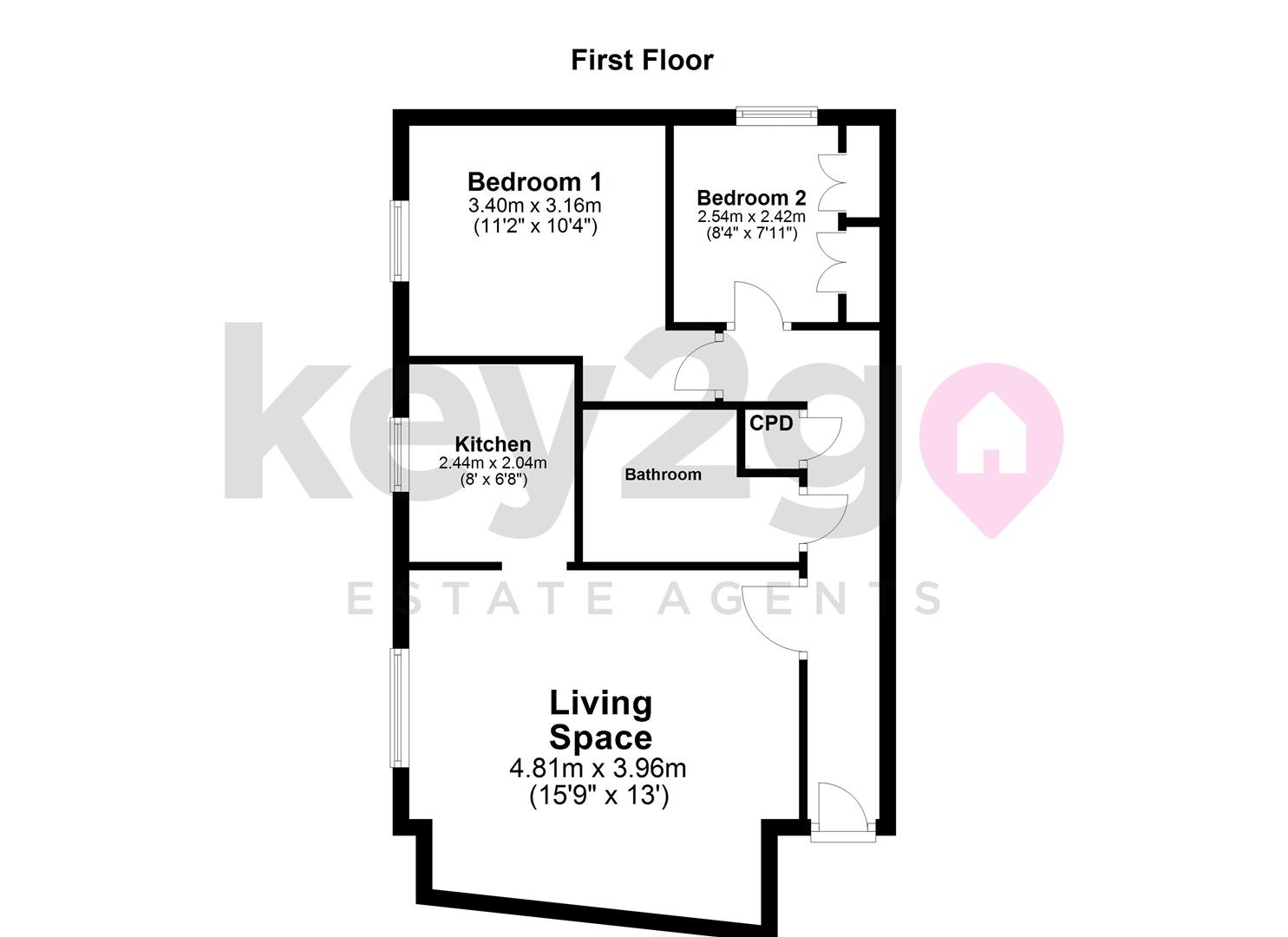First-floor flat accessed through the communal entrance, positioned to the rear on the right-hand side.