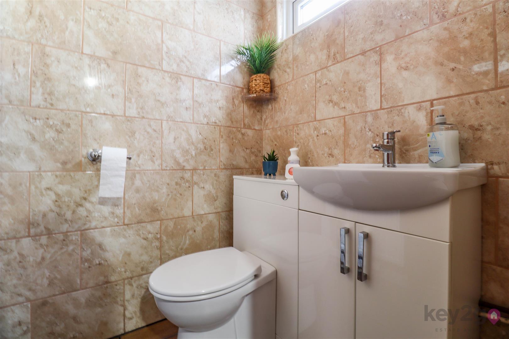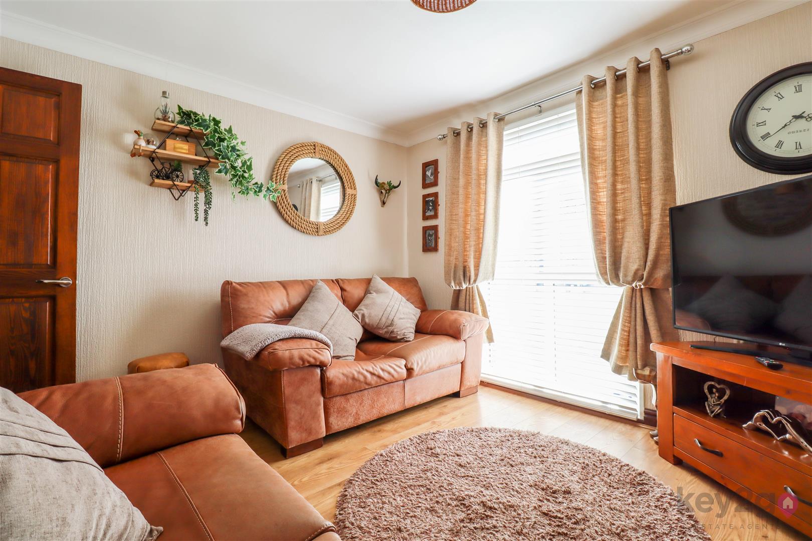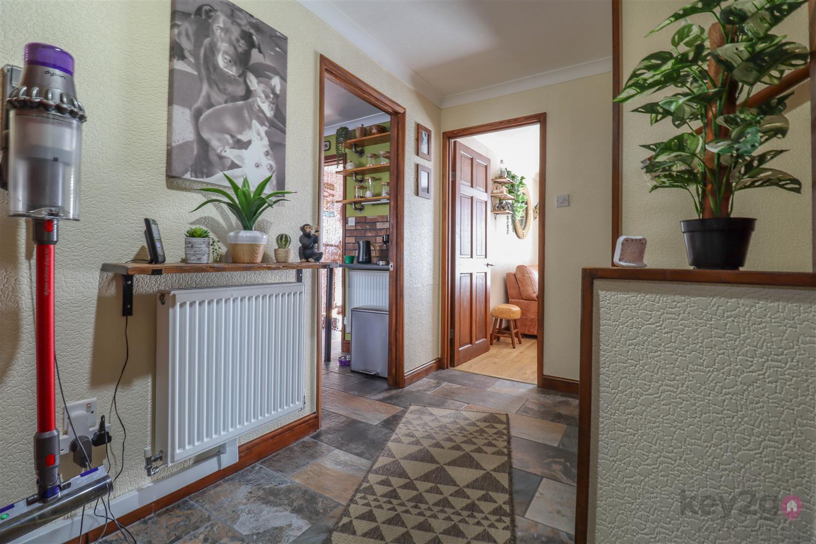 A useful porch area provides access to two large storage cupboards. A door leads into the hallway, with stairs rising to the first floor, two further storage cupboards, and a downstairs WC. To the rear is a cosy living area, with a door leading into the kitchen. The kitchen in turn provides access to the second reception room, which has patio doors opening onto the rear garden.
