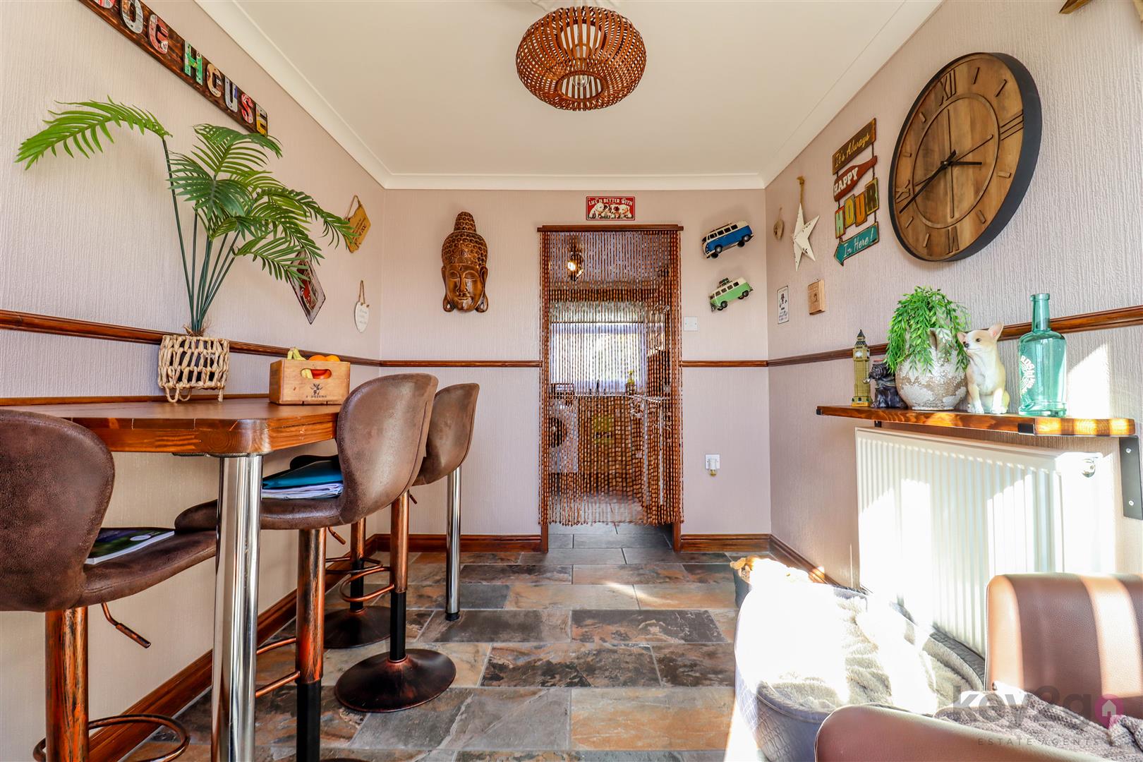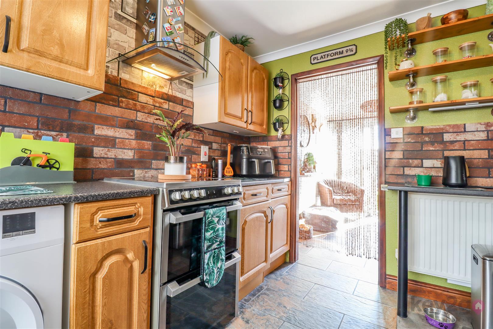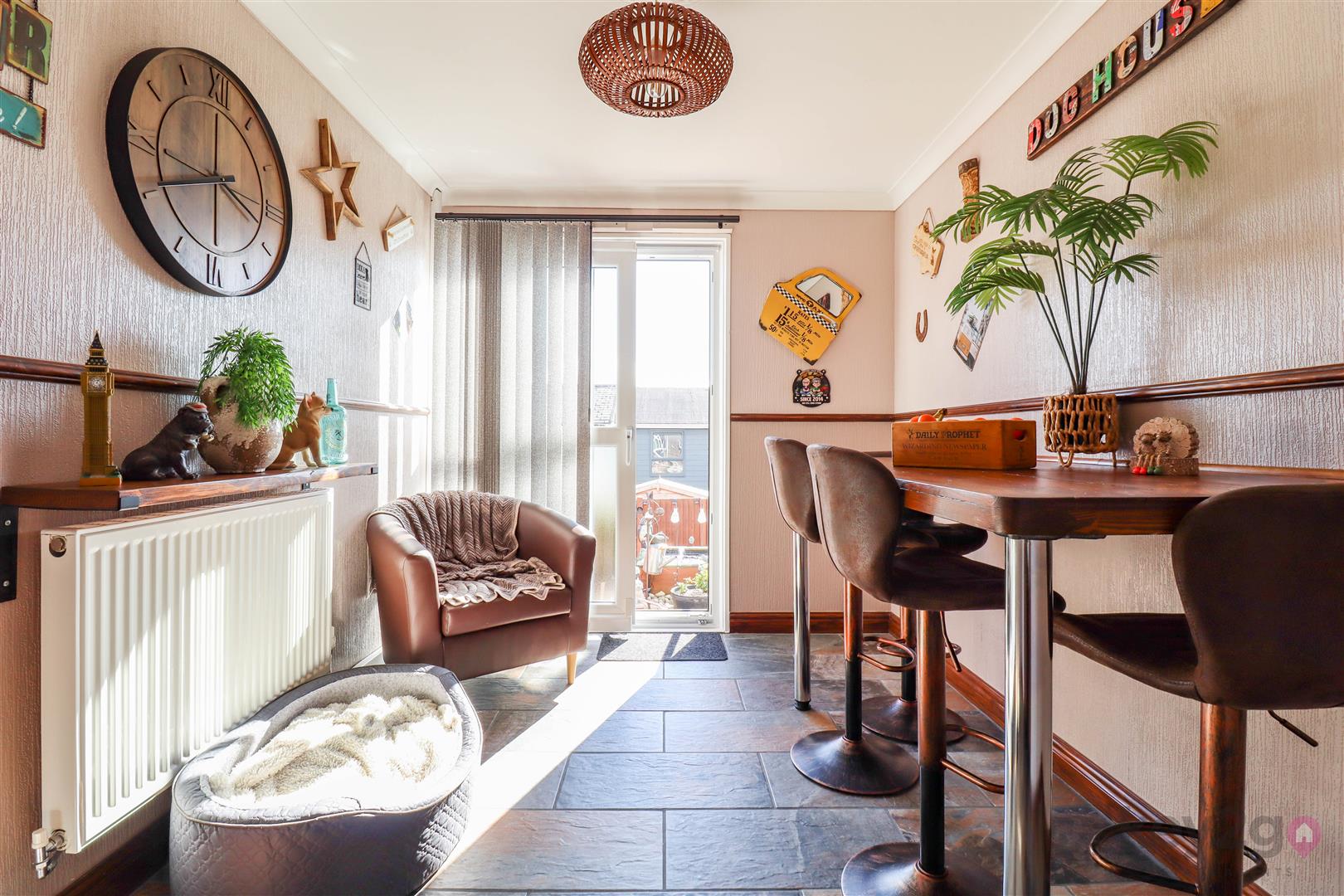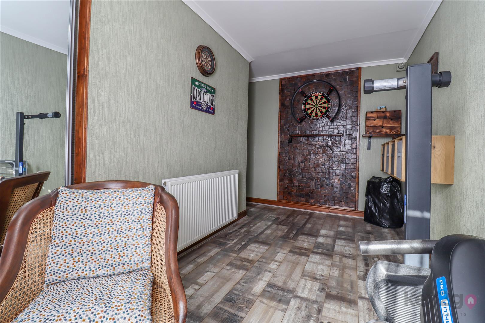 A useful porch area provides access to two large storage cupboards. A door leads into the hallway, with stairs rising to the first floor, two further storage cupboards, and a downstairs WC. To the rear is a cosy living area, with a door leading into the kitchen. The kitchen in turn provides access to the second reception room, which has patio doors opening onto the rear garden.