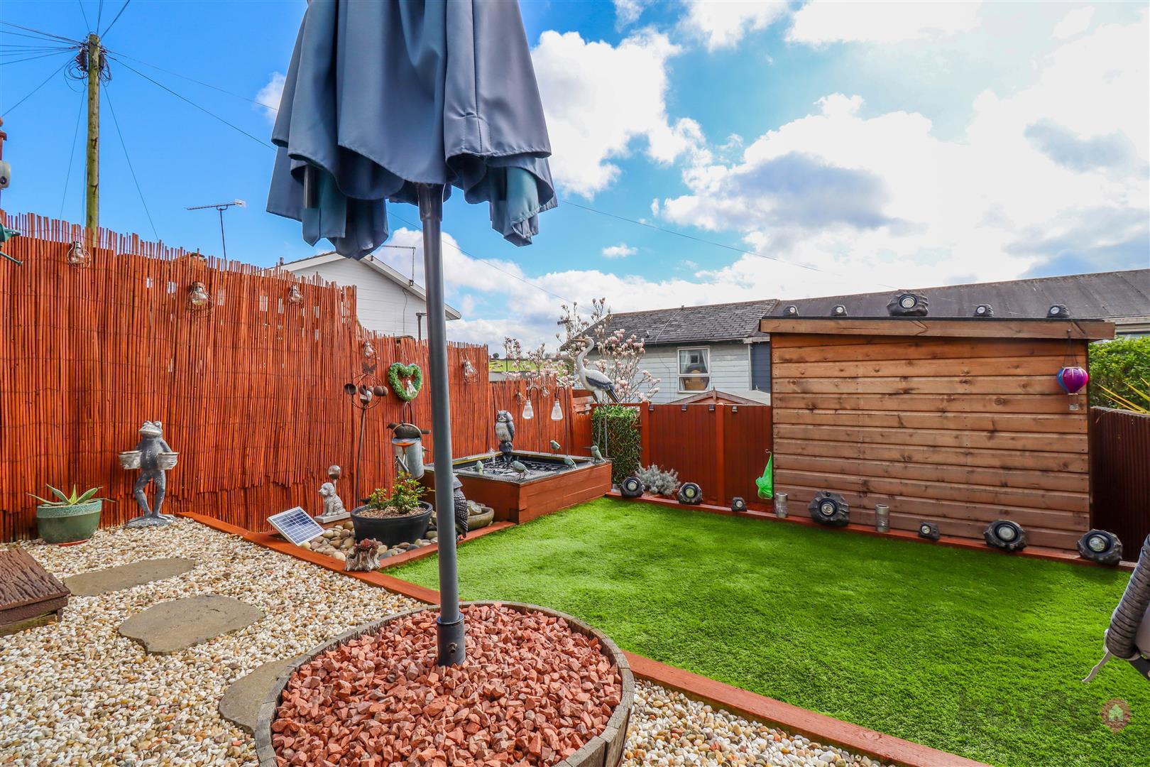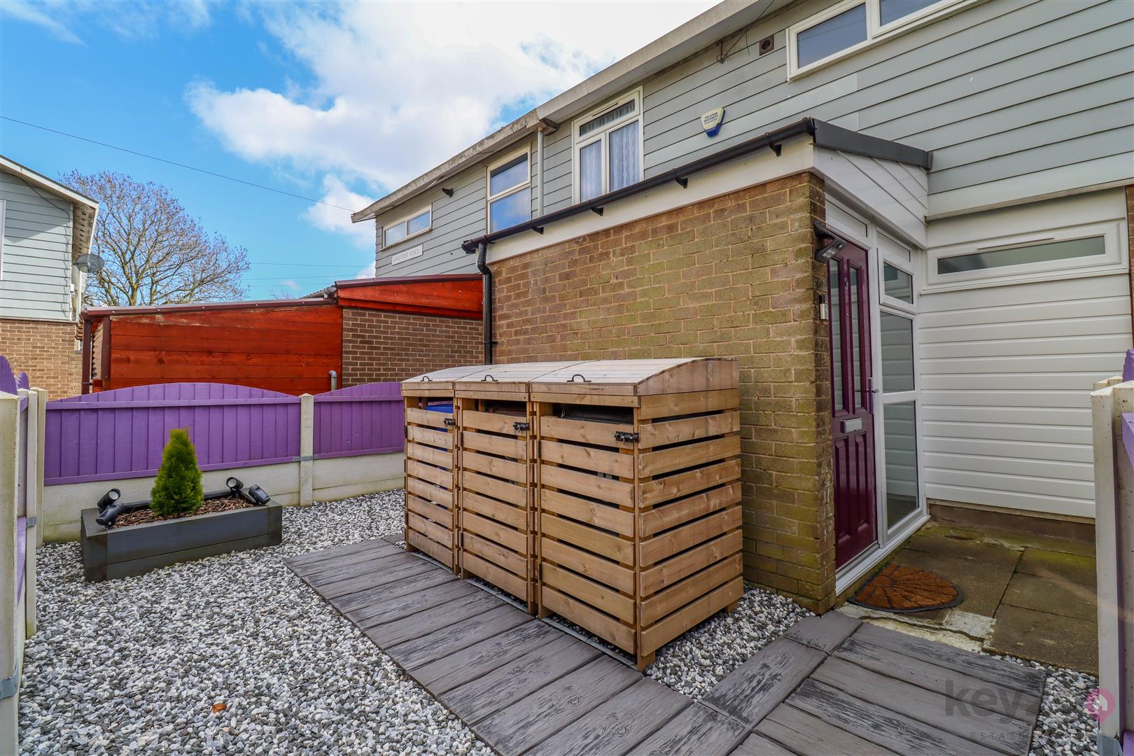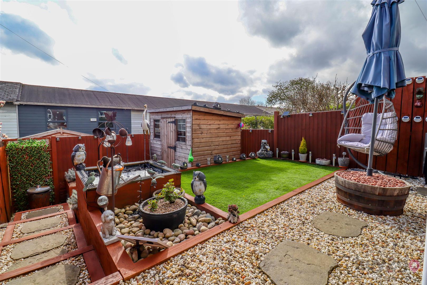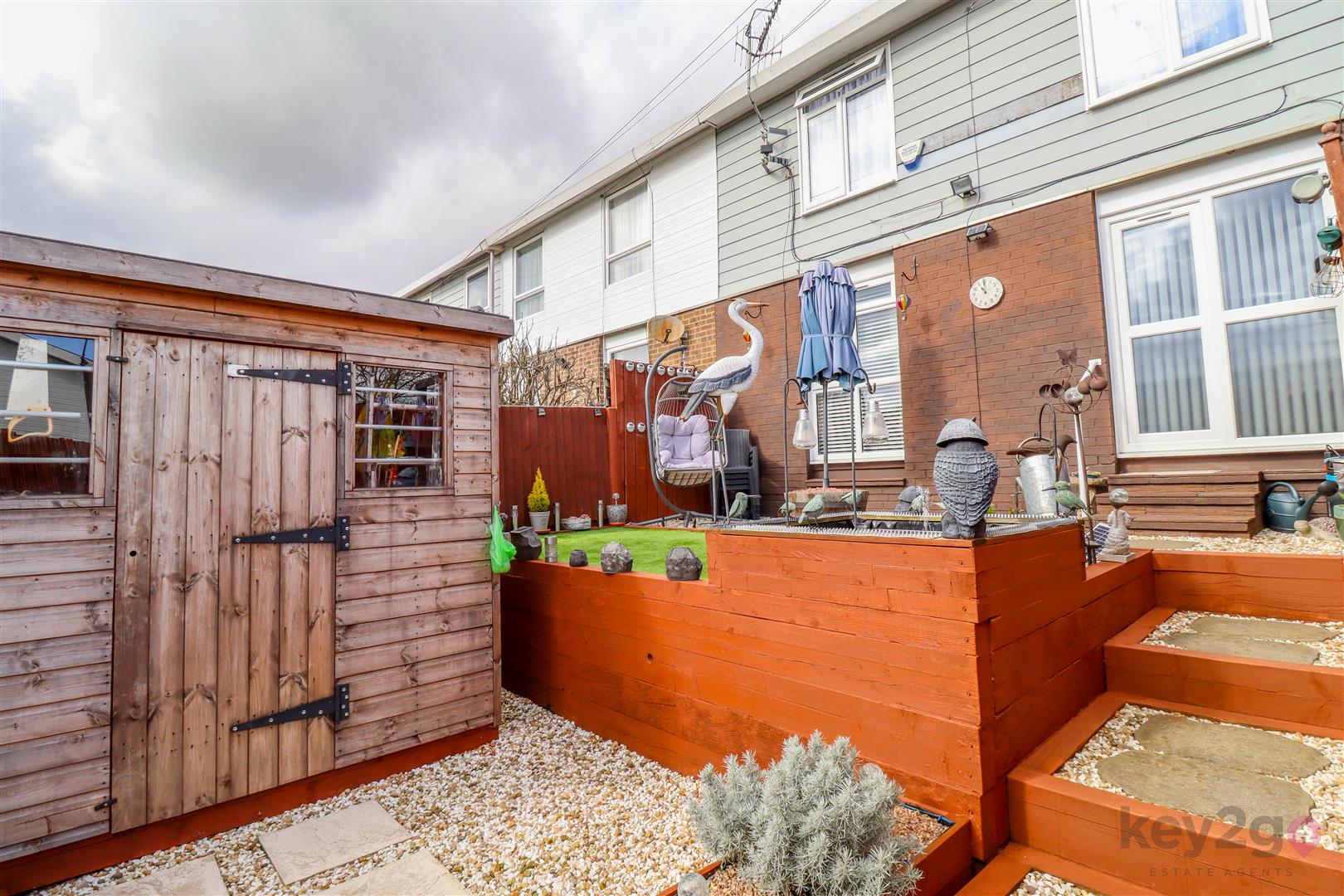 The front is pebbled with fencing to the boundary. To the rear, there is a shared path for neighbouring houses and a landscaped, maintenance-free tiered garden.