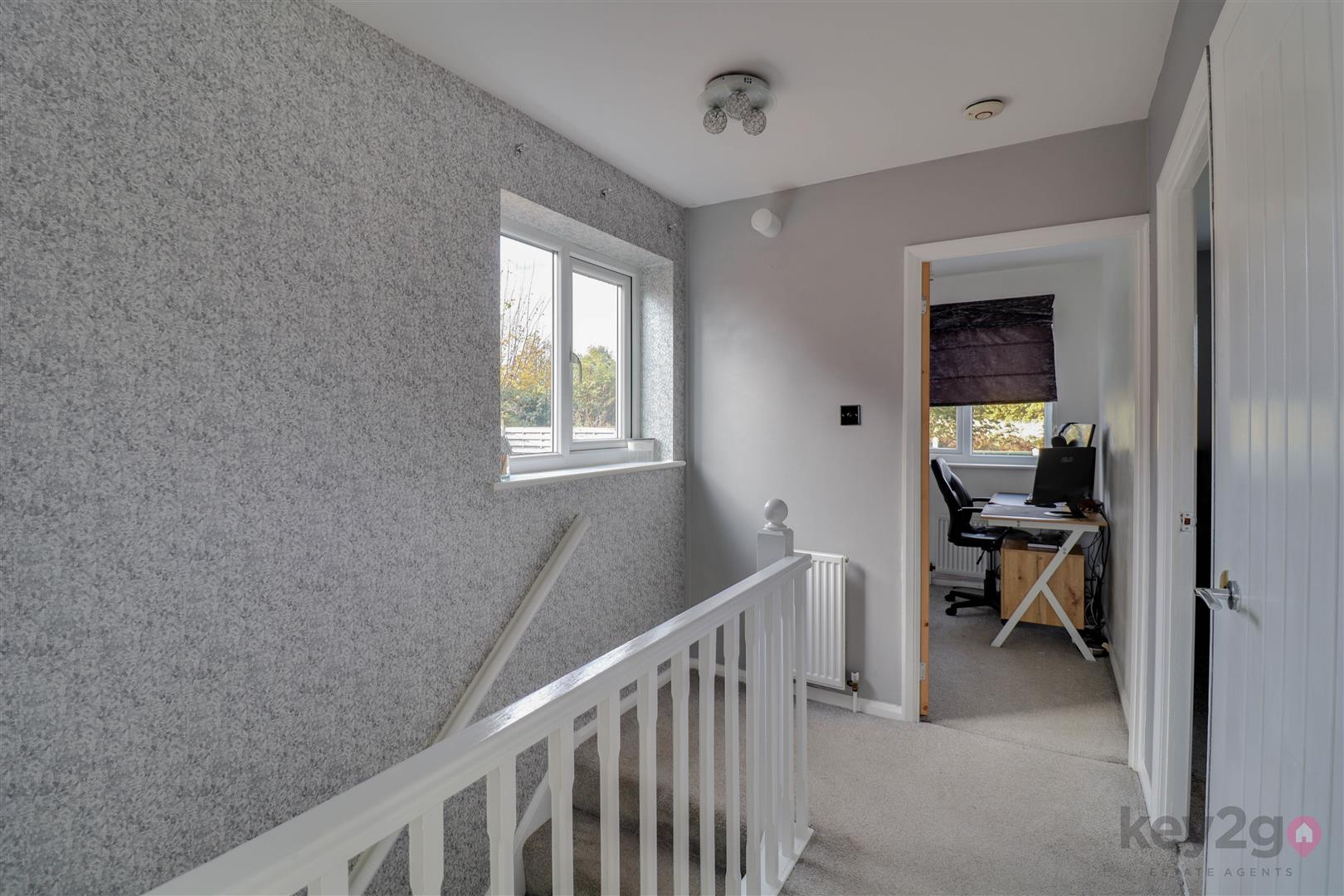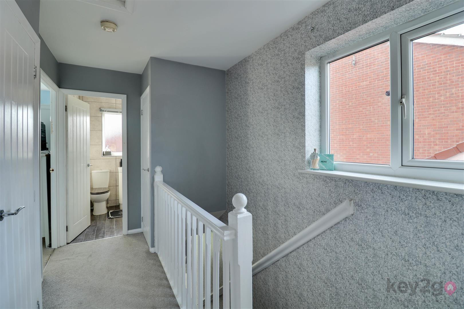 Stairs and landing with carpet, storage cupboard, and window, providing access to all bedrooms and the bathroom. Bedroom one is a double with carpet and fitted wardrobes. Bedroom two is a double with carpet and window. Bedroom three is a single, neutral room with carpet and window. The bathroom is modern and tiled floor to ceiling, featuring a bath with shower, sink with storage unit, CCWC, and obscure window.