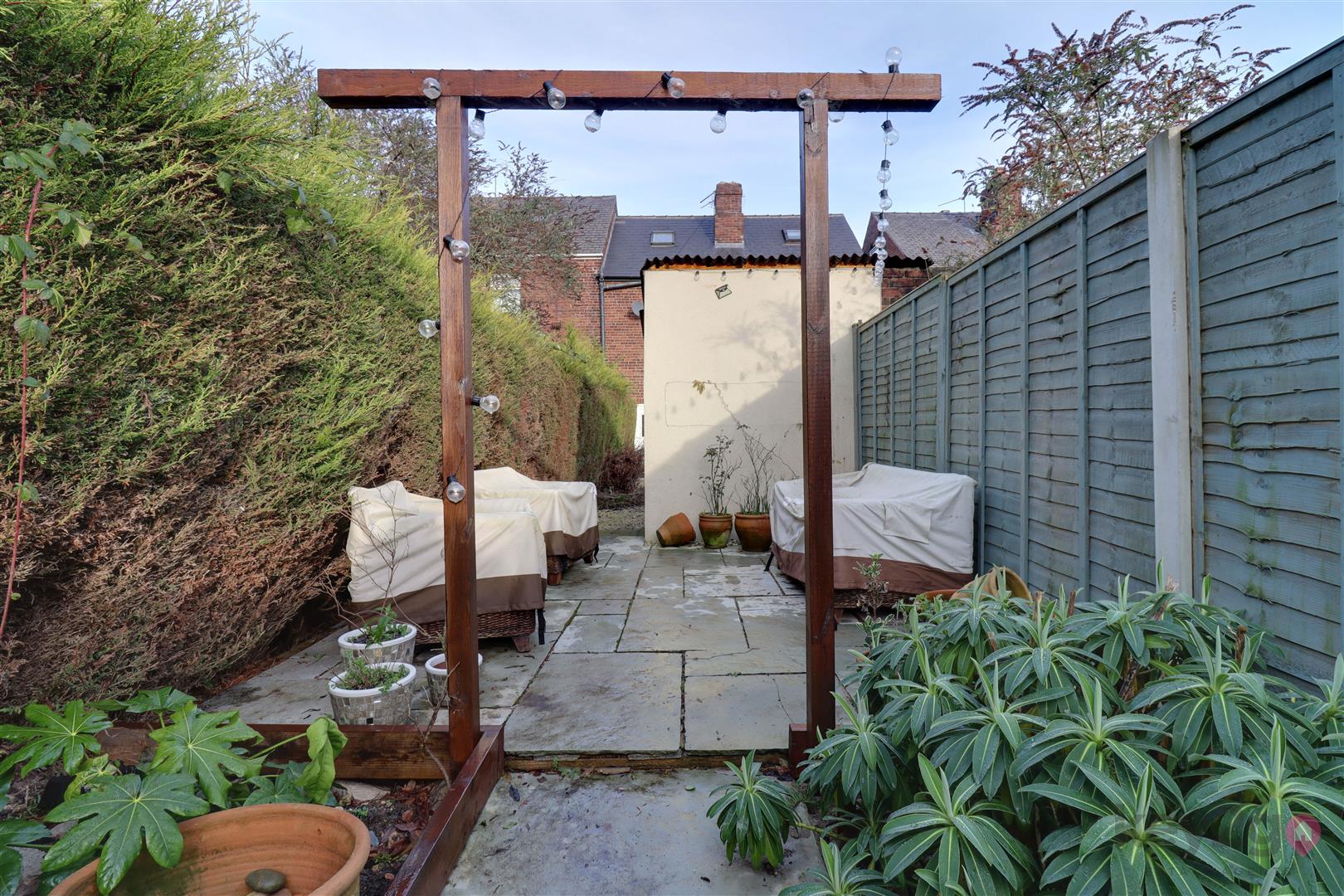 To the front of the property there is a pathway leading to the front door, with slate areas to either side, fencing and a tree.