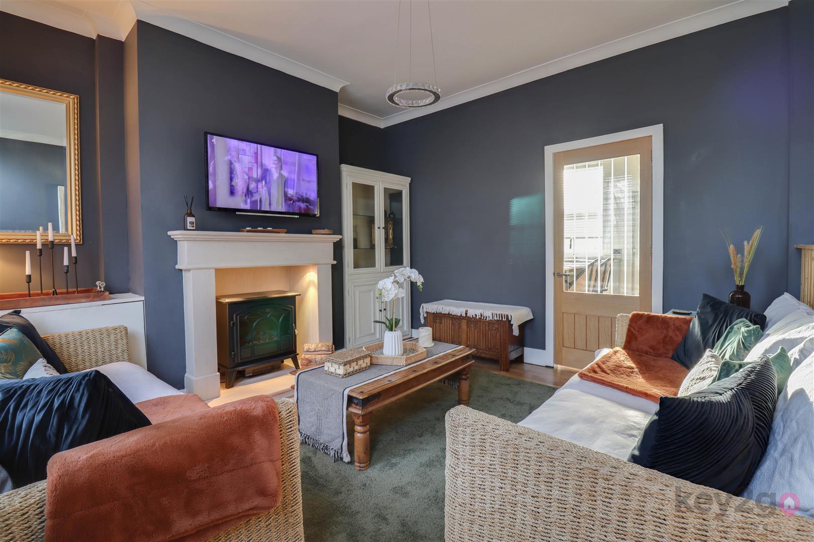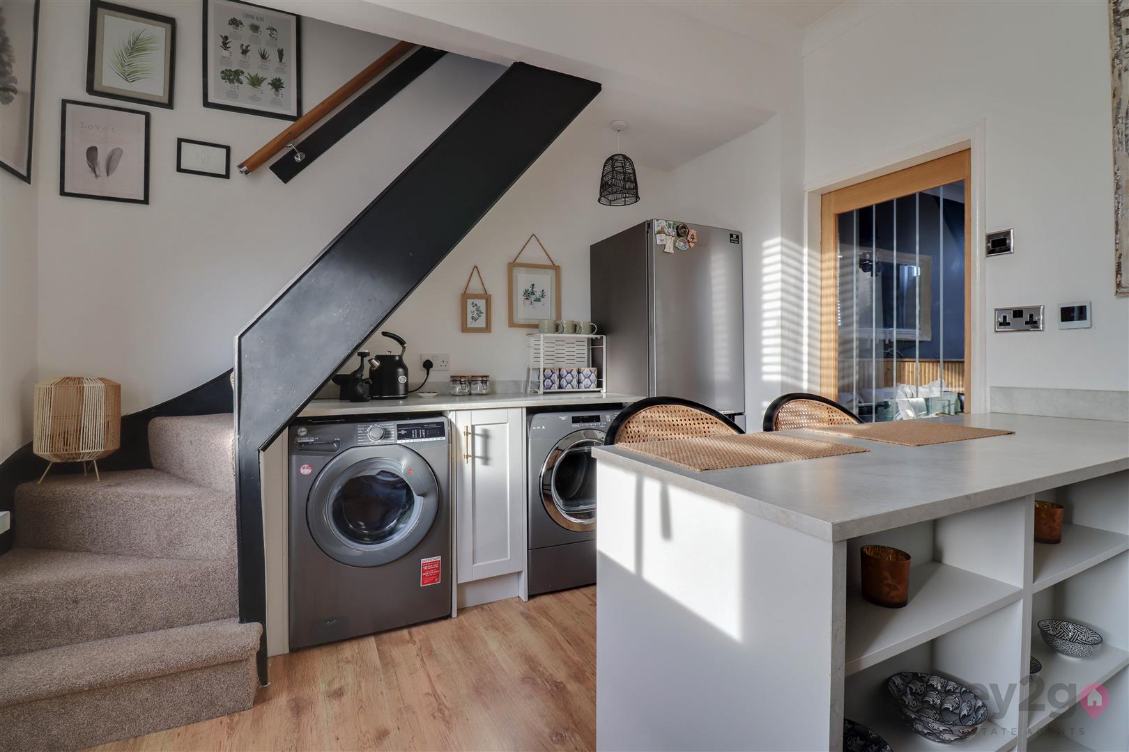 Enter into the bright lounge, which features a fireplace with a log burner and a door leading through to the modern kitchen. The kitchen benefits from a breakfast bar, oven, hob and extractor fan, wine fridge, and space for a full-height fridge/freezer, washing machine and tumble dryer. A door provides access to the rear garden.