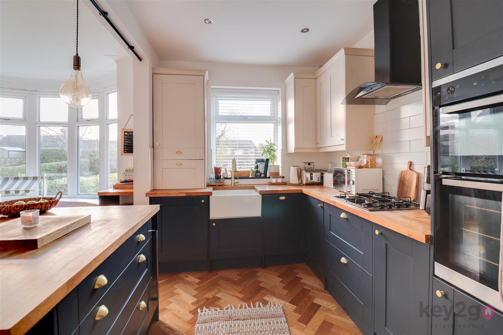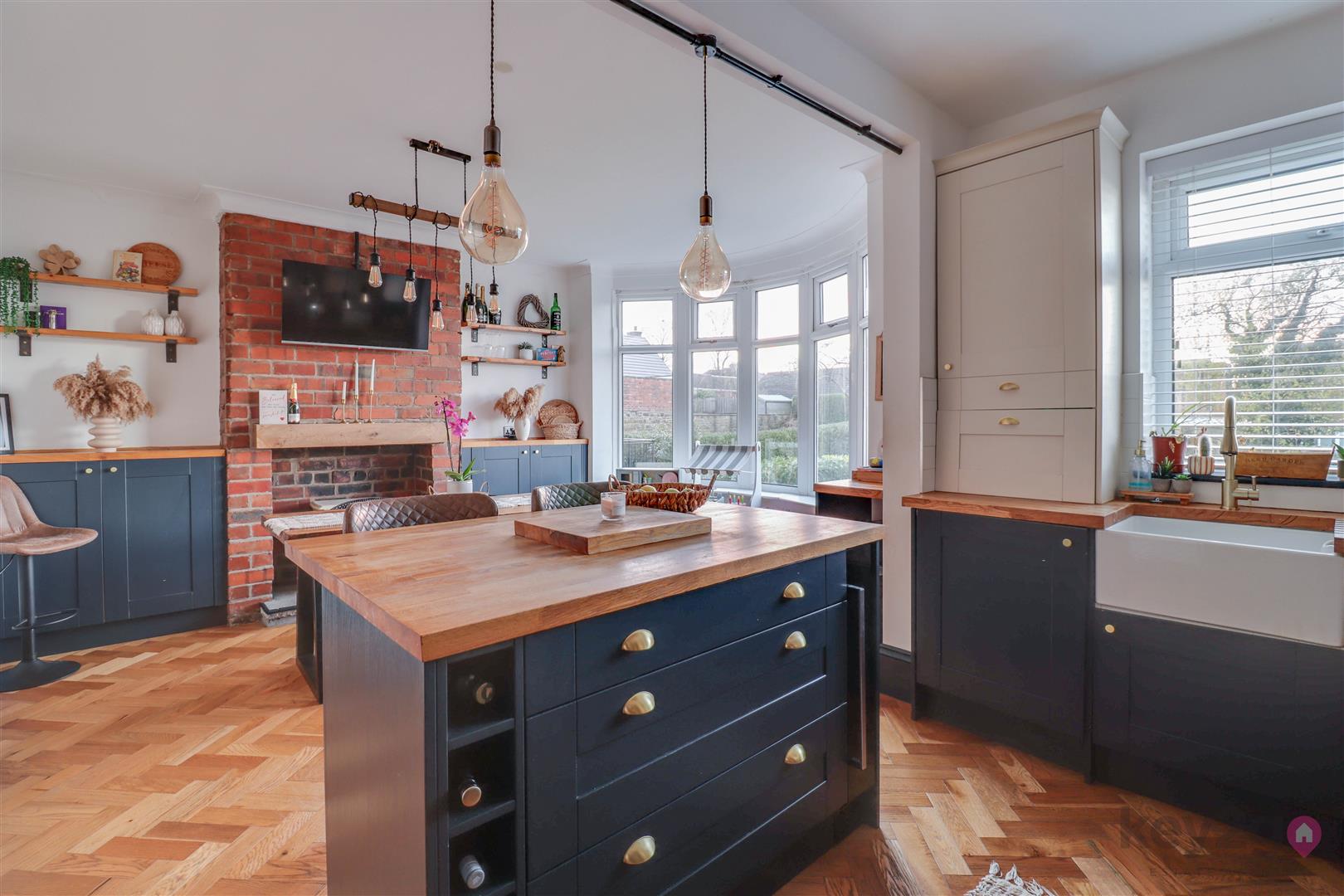 The hallway has a composite door and is bright, spacious and neutral, with panelling, a window and herringbone flooring throughout, with stairs and access to the lounge and kitchen/diner. The living room is bright and well presented, featuring a large bay window, space for a fireplace with a wood mantel, built-in shelving and additional storage, with a spacious layout, neutral decor, a panelled back wall and herringbone flooring creating a cosy and warm space. The kitchen/diner is open, spacious, modern and stylish, with ample wall and base units, light upper cabinets and darker base units, solid wood worktops, a Belfast sink, integrated fridge freezer, double oven, gas hob, washing machine and wine cooler. A central island offers ample storage and breakfast seating, and the dining space is bright and inviting with a large bay window, a brick fireplace, built-in storage and herringbone flooring throughout, making it a perfect space for entertaining.