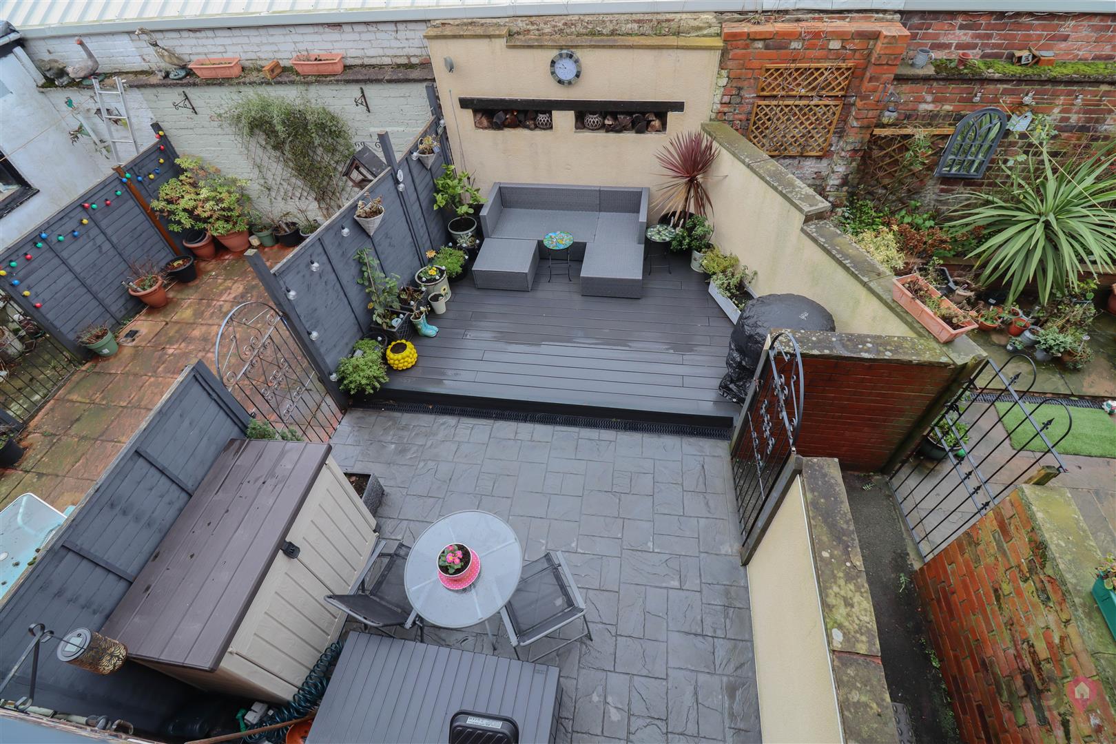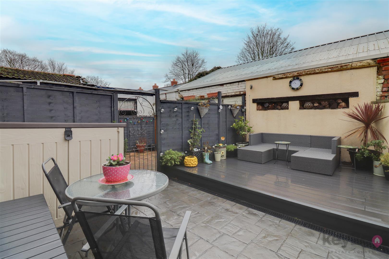 To the front of the property there is an archway with a pathway leading to a gate providing access to the rear garden. The rear garden features a patio area and a decking area, enclosed by fencing.
