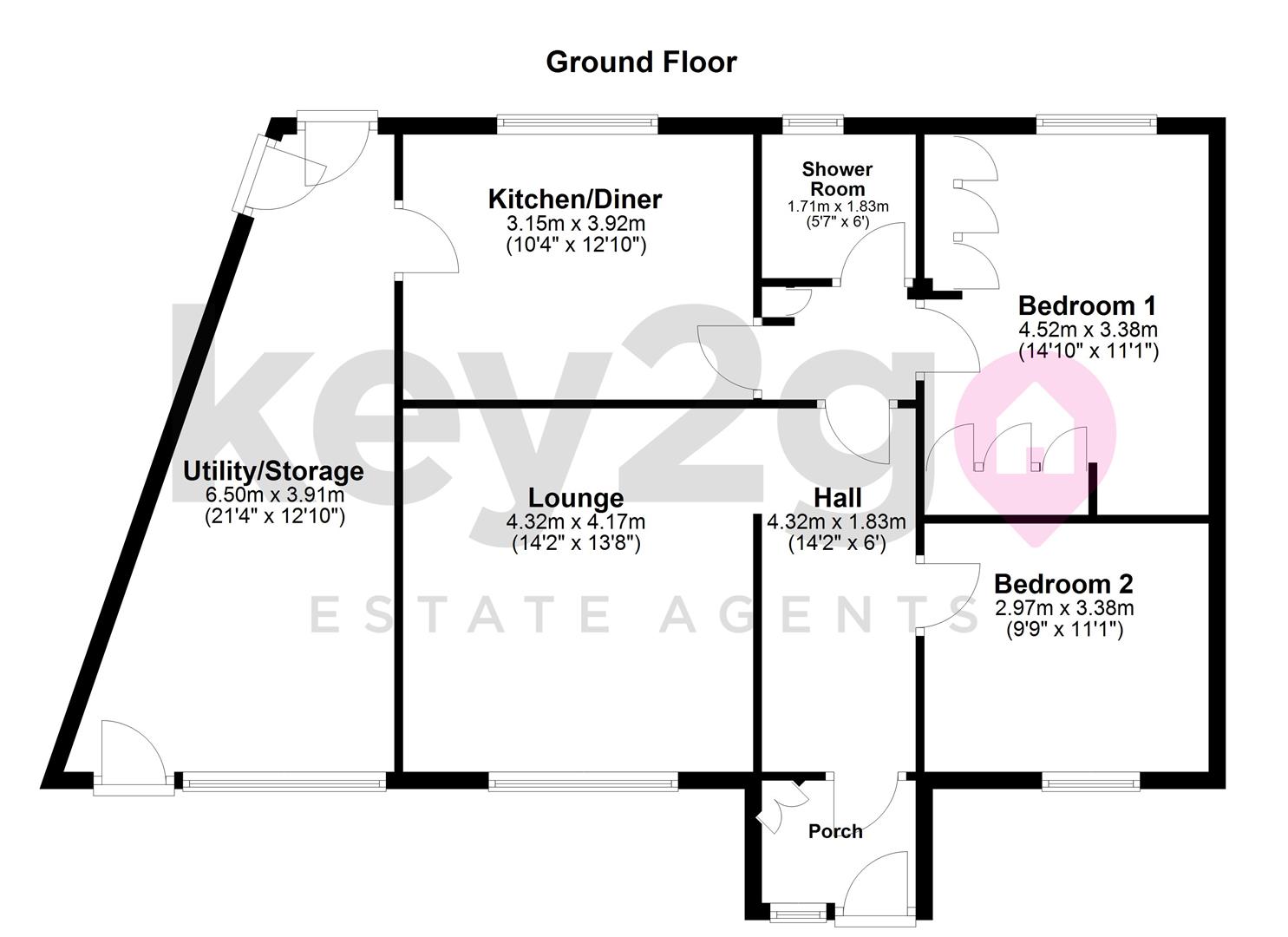 Enter through the porch, which has a small storage cupboard and a door leading into the hallway. This opens into the generously sized and bright lounge, featuring a fireplace. A door leads to bedroom two, which could also be used as a dining room. A further door from the hall gives access to the inner hallway, with doors to the main bedroom, shower room and kitchen/diner. Bedroom one is a good sized double bedroom with ample built-in storage. The shower room comprises a shower cubicle, wash basin and WC. The kitchen/diner is fitted with ample wall and base units, an oven, hob and extractor fan, with space for a dining table. A door from the kitchen leads to the utility/storage room, which has doors providing access to both the front and rear gardens.