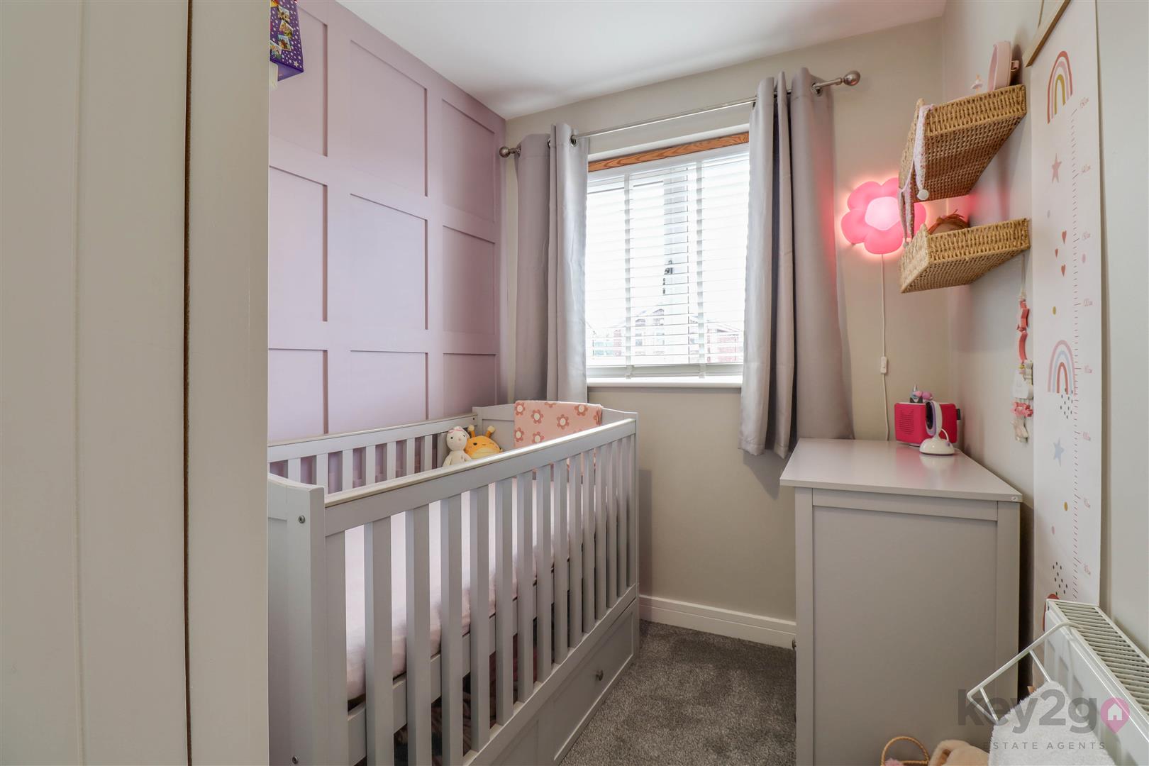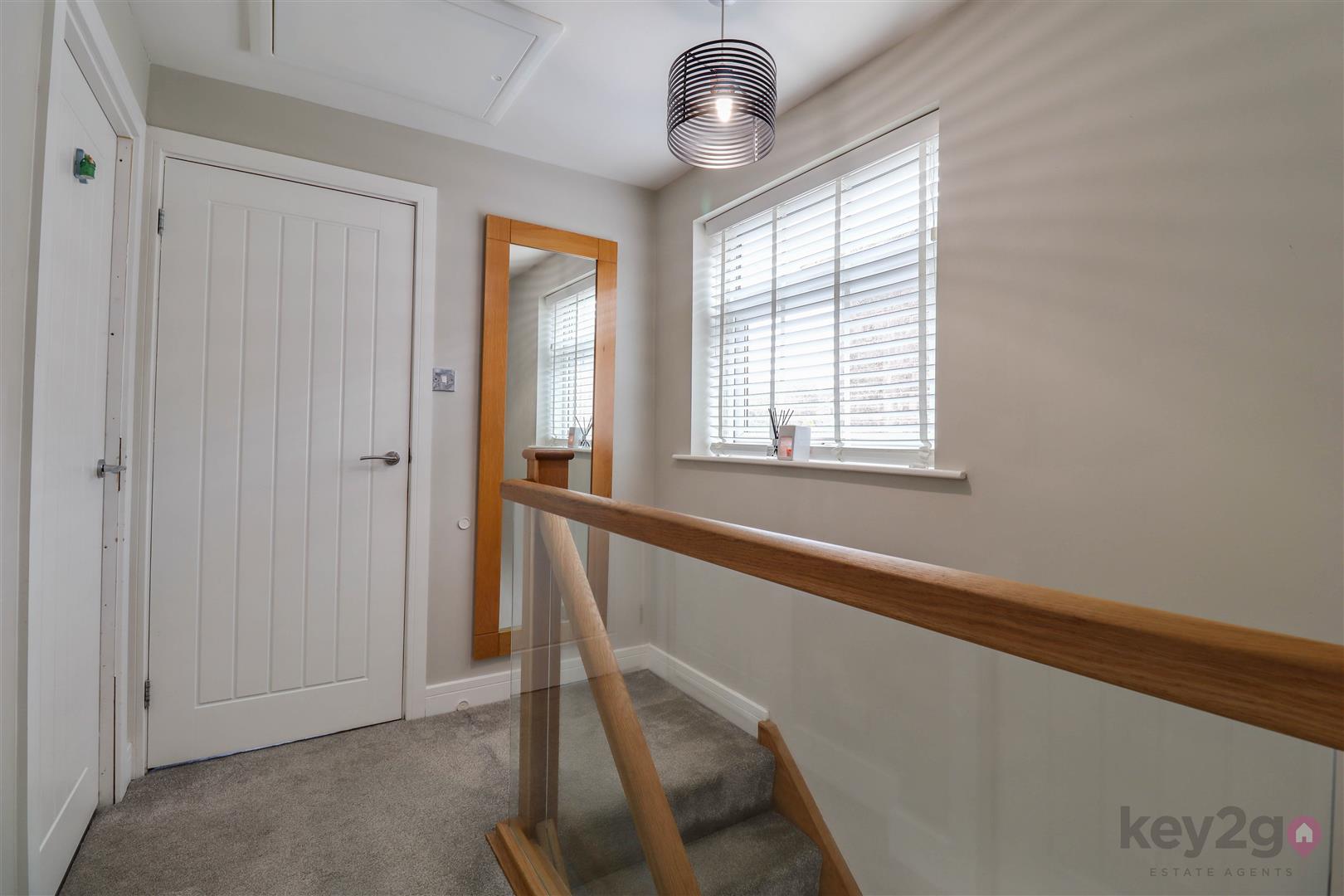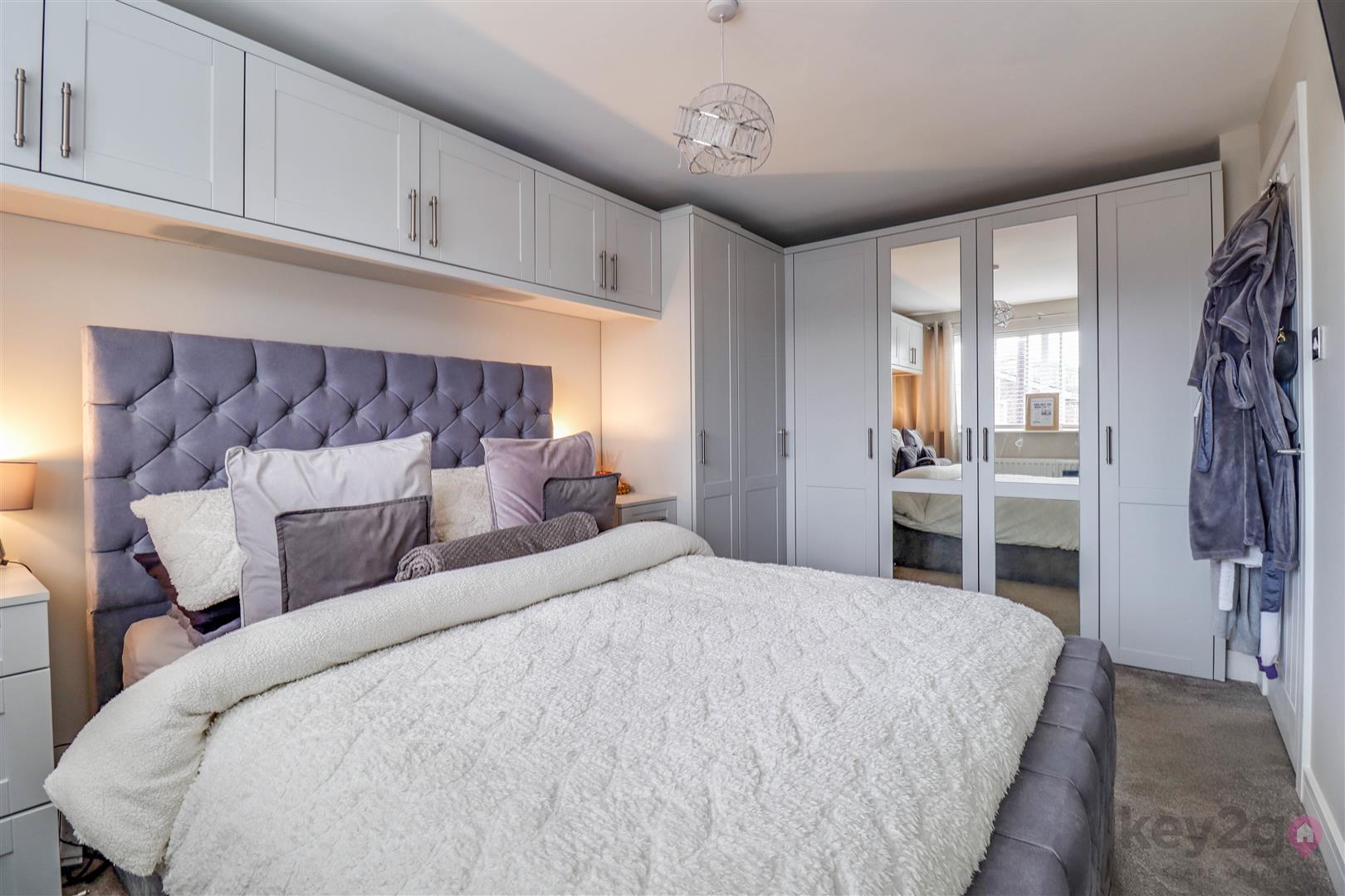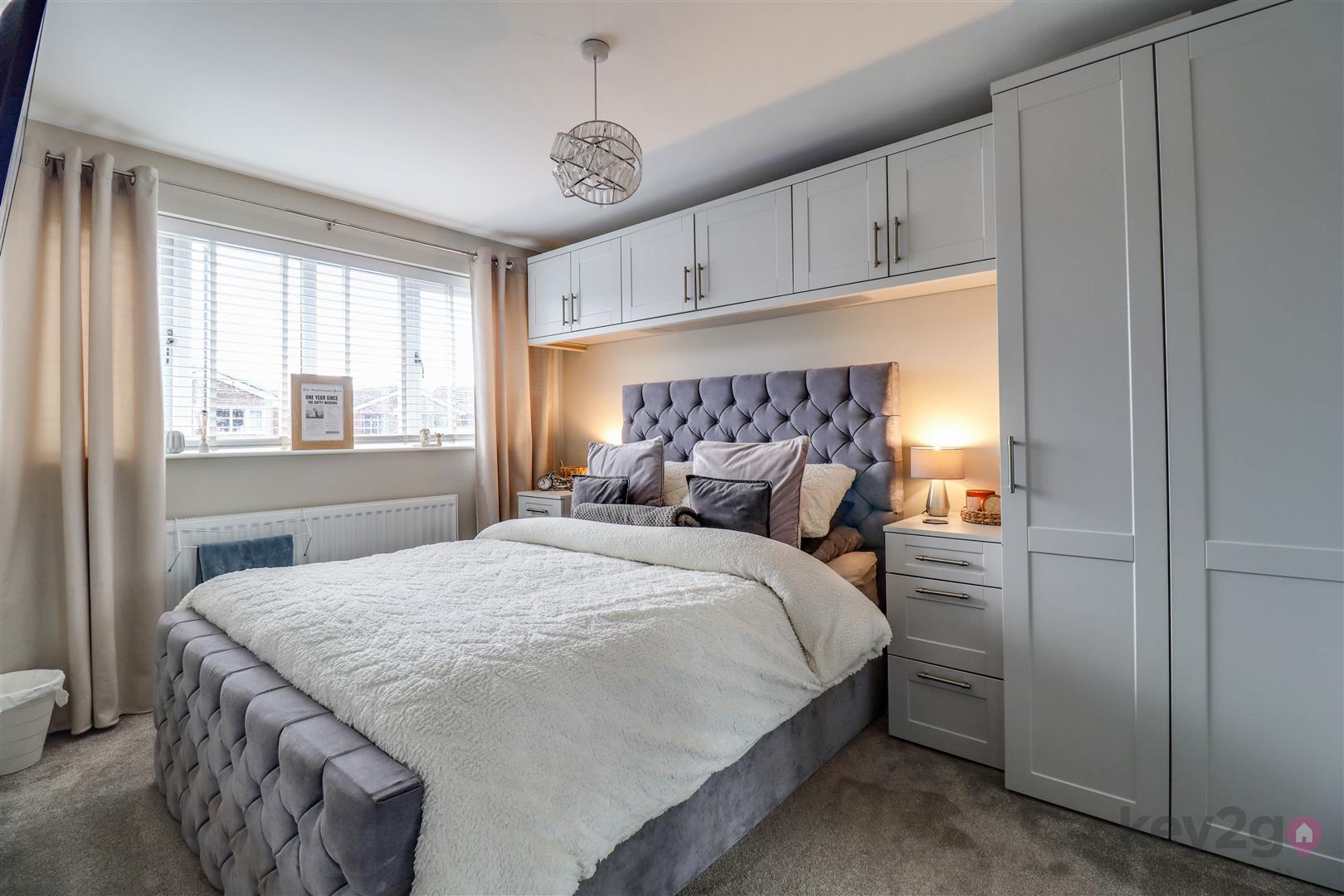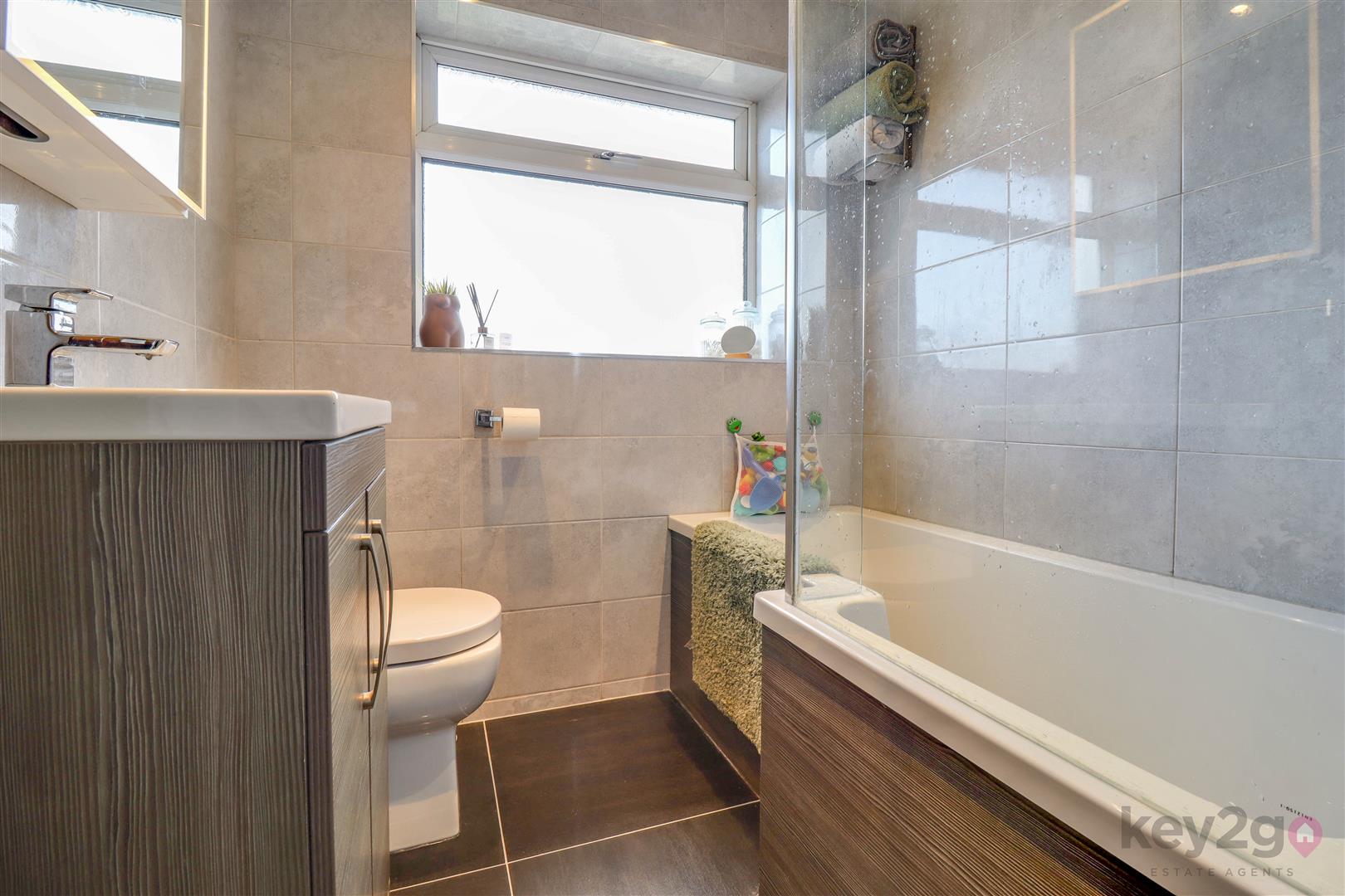 An oak and glass balustrade leads to the first floor landing. The main bedroom is a large double room positioned to the front of the property and benefits from fitted wardrobes. The second bedroom is also a good sized double overlooking the rear. The third bedroom is a single room to the front with useful over-stairs storage. The stylish bathroom is fitted with a ‘P’-shaped bath with shower over, a vanity wash basin and a close-coupled WC.