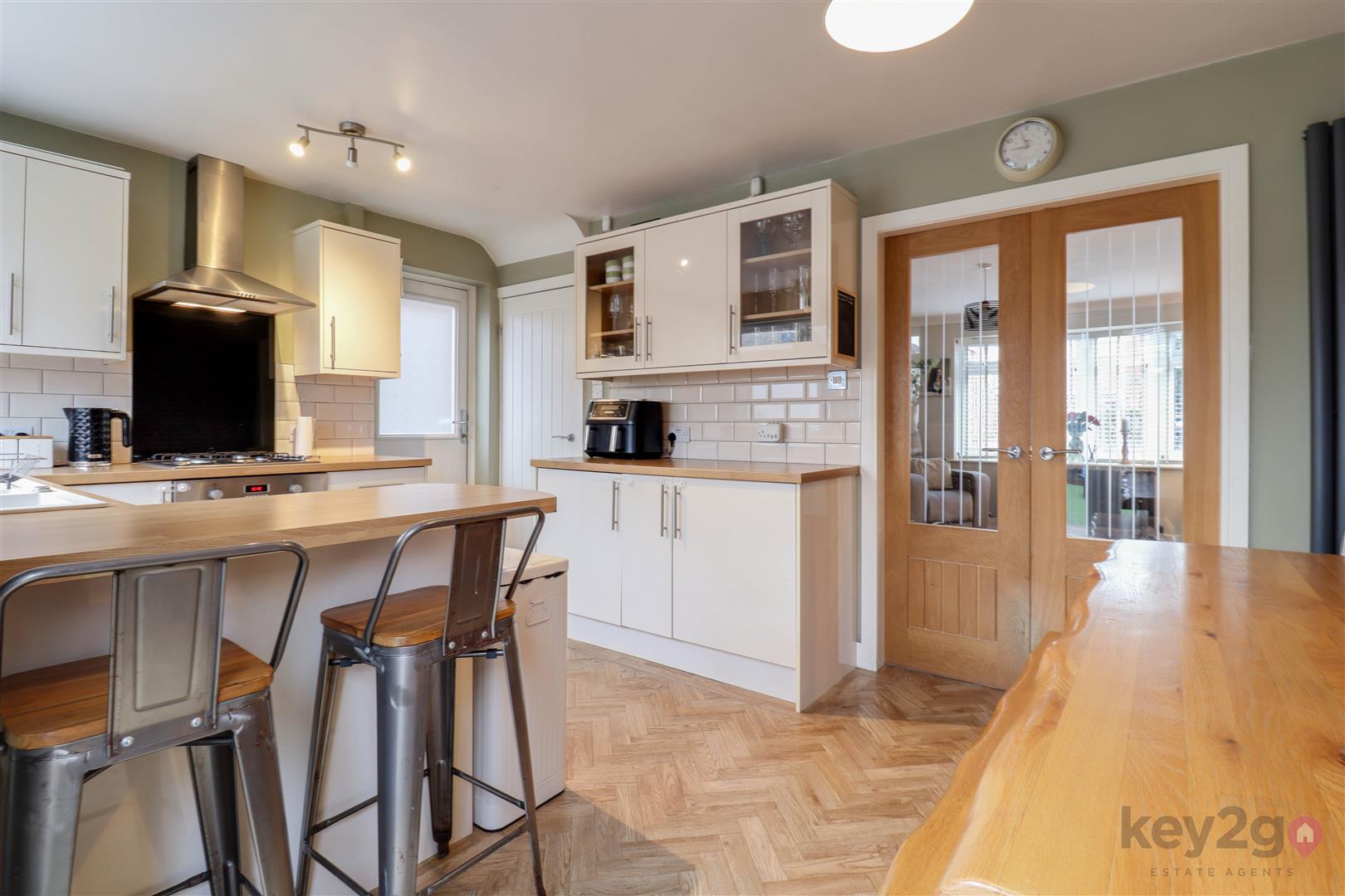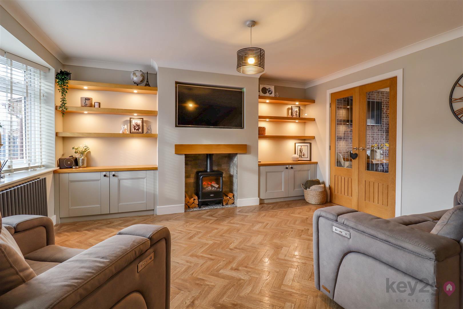A useful porch welcomes you into the property, featuring a window and stylish herringbone effect flooring which continues throughout the ground floor. A door leads into the lounge, where stairs rise to the first floor and a bay window overlooks the front. The lounge also benefits from a stunning media wall and double doors opening into the kitchen/diner. The high gloss fitted kitchen offers ample wall and base units, an understairs cupboard currently used as a utility space, and a window to the rear. There is also a side composite door and patio doors opening out to the garden.