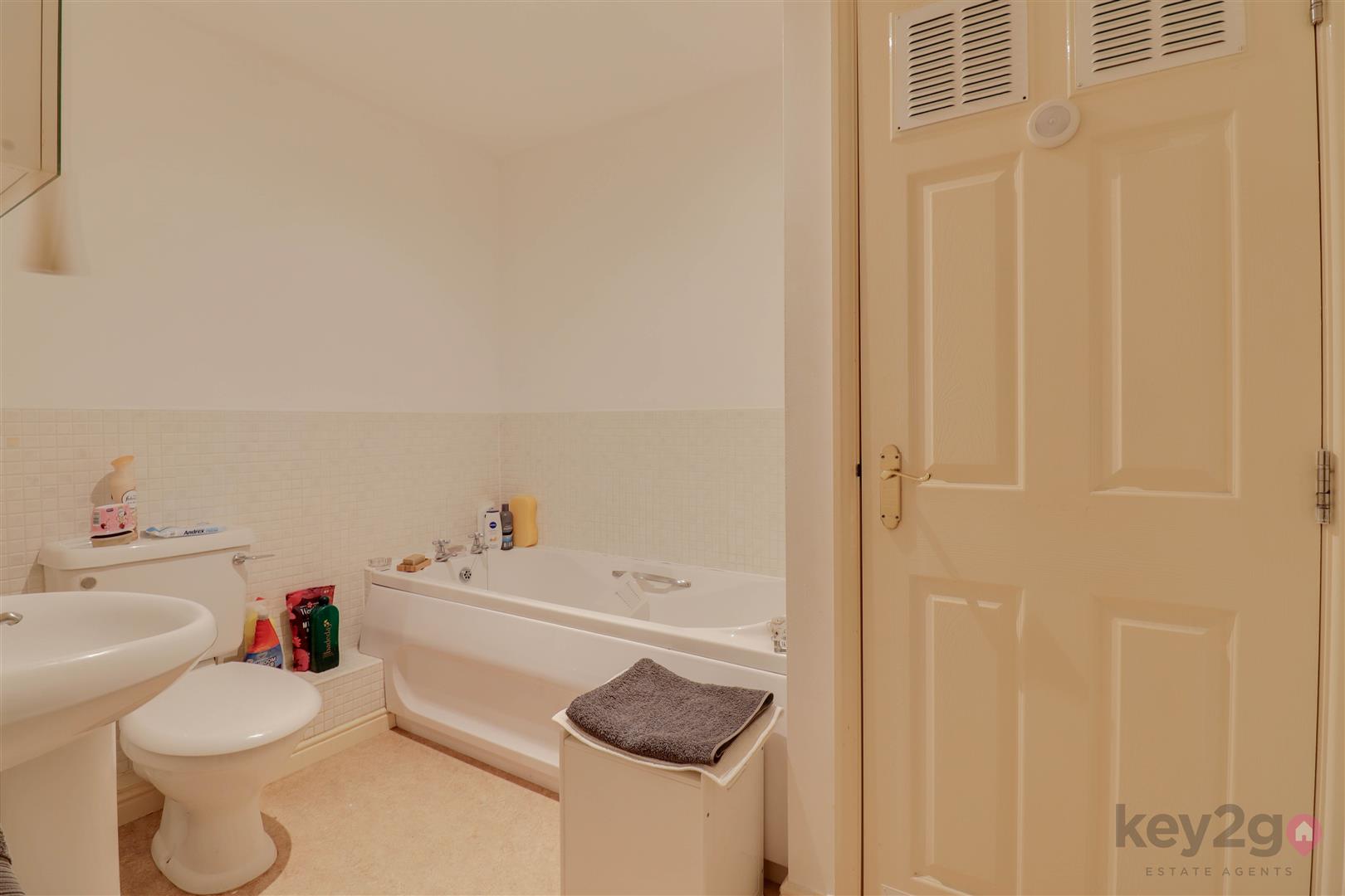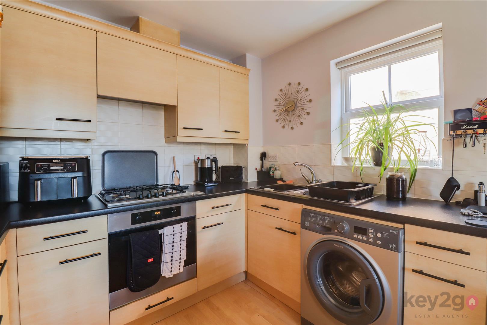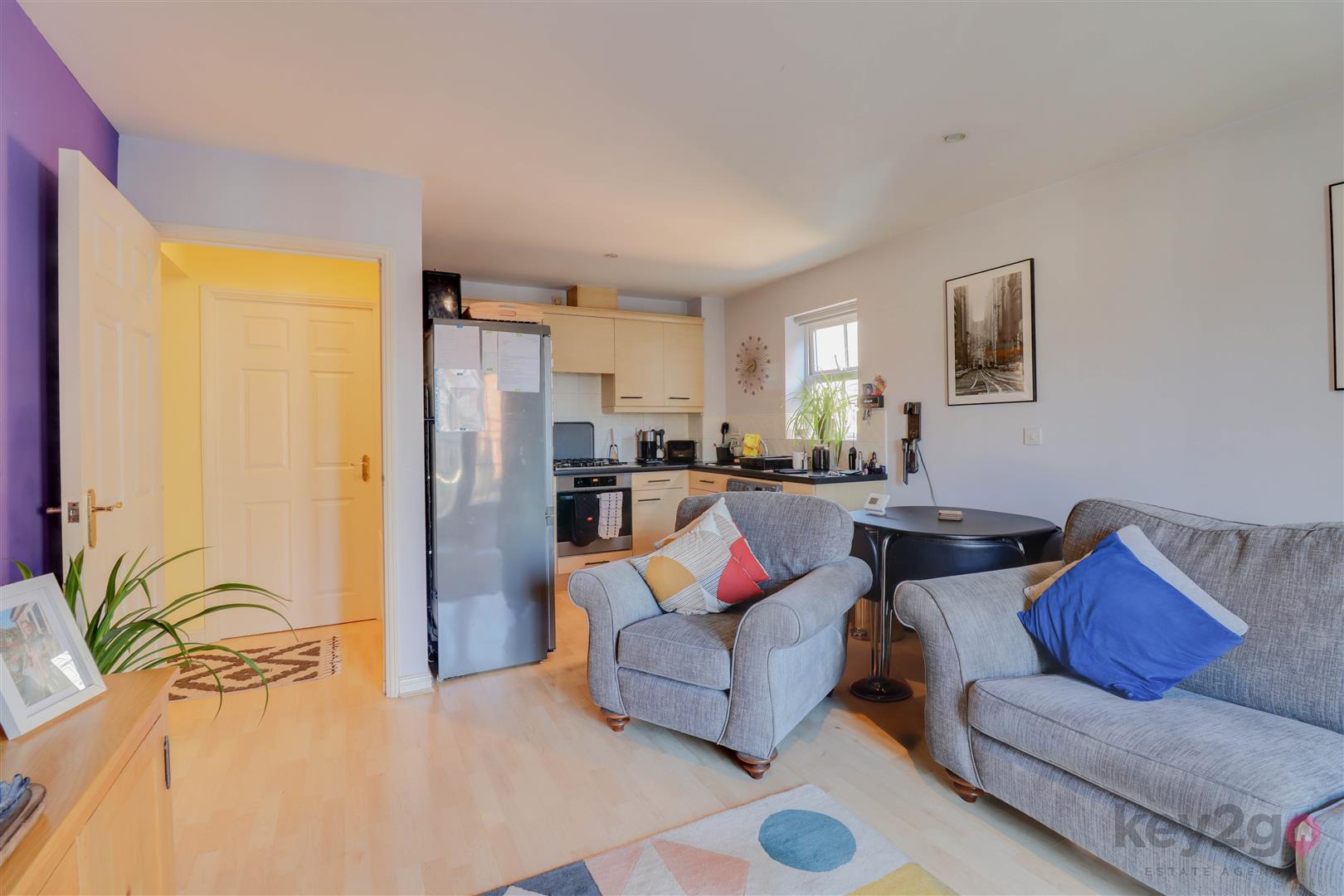 Entrance is into a welcoming hallway, with doors providing access to all rooms and a useful storage cupboard. The kitchen/diner/living area is bright and generously sized, featuring a Juliet balcony, wall and base units, an oven, hob and extractor fan, and space for a full-height fridge/freezer and washing machine/tumble dryer. The master bedroom is bright and spacious and benefits from access to an en-suite, which is fitted with a shower cubicle, WC and sink. Bedroom two is also a double bedroom. The bathroom is generously sized and comprises a bath, sink, WC and a cupboard housing the boiler.