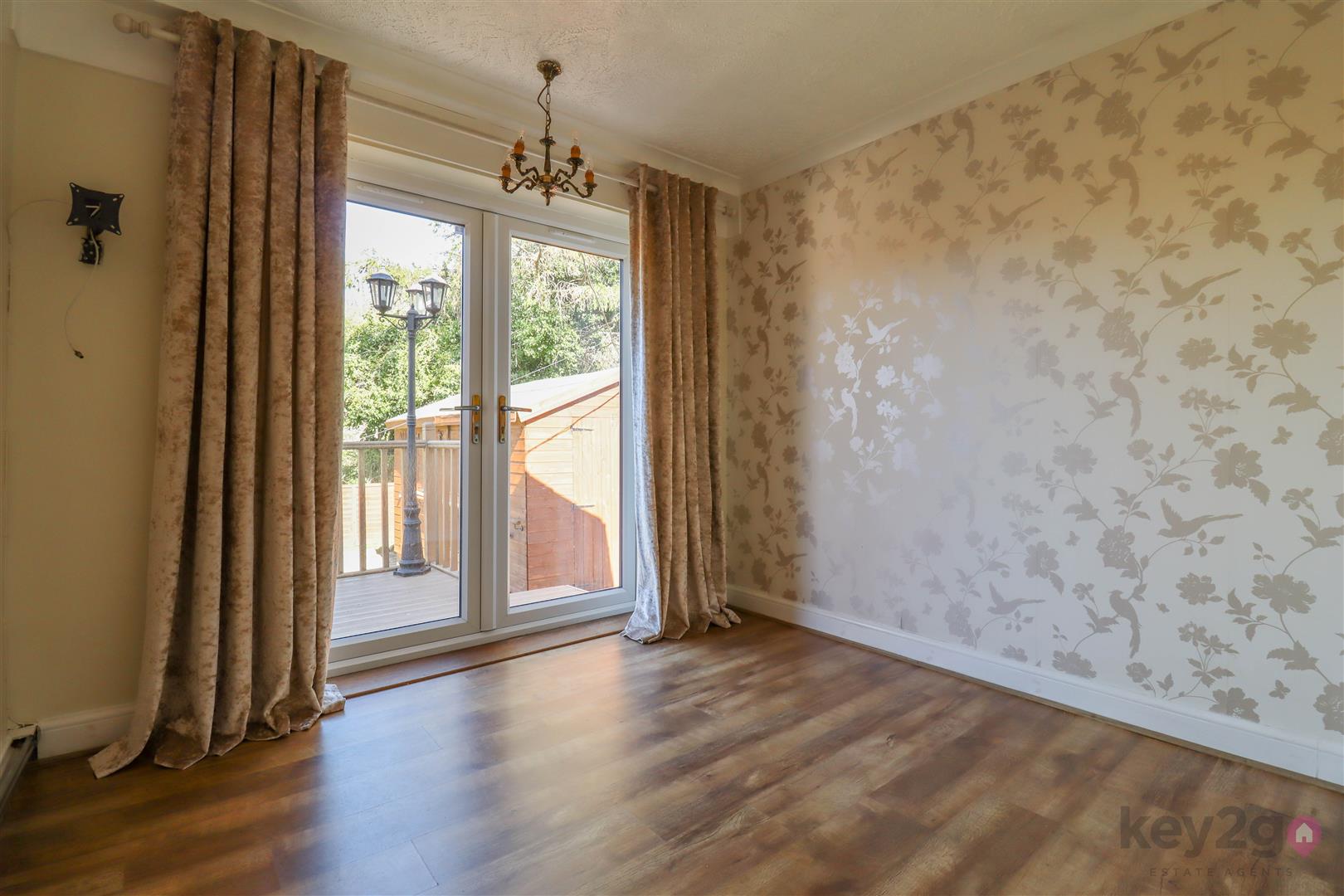 A useful porch area leads to a modern kitchen fitted with ample wall and base units, which is open to the living room. The living room is a bright reception space with a feature fireplace and a bay window to the front. A door leads to an inner hallway, providing access to a large double bedroom to the rear and a single bedroom with patio doors opening onto the rear garden. There is also a modern wet room.