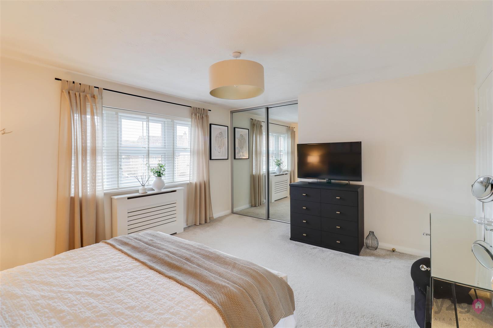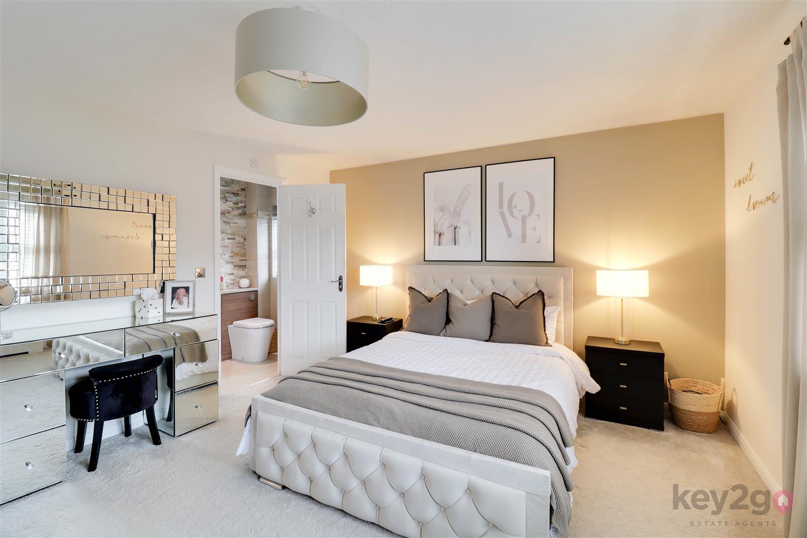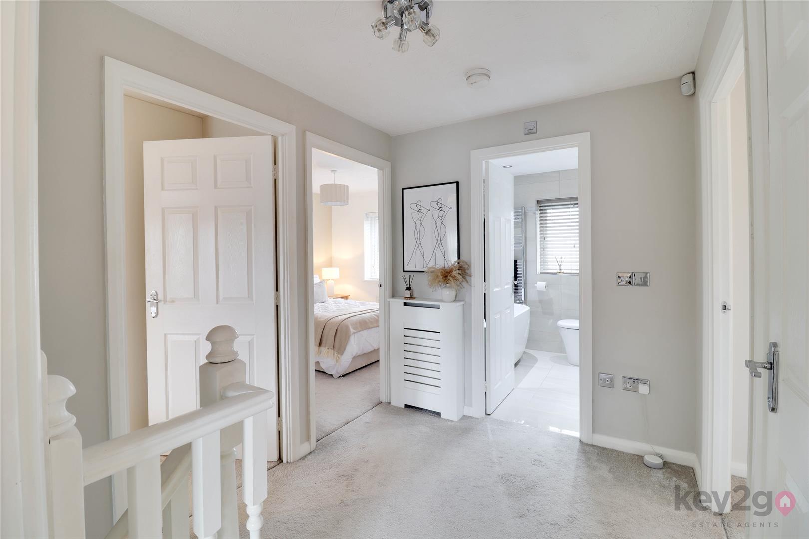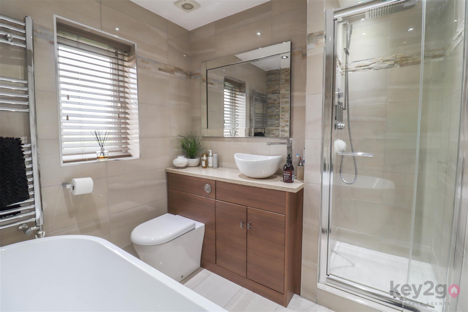Stairs rise to a spacious, carpeted landing which provides access to the loft, all four bedrooms and the family bathroom. Bedroom one is a large double room, beautifully presented in neutral décor with fitted carpet and built-in wardrobes featuring mirrored sliding doors. A window allows for plenty of natural light, and the room benefits from its own en-suite. The en-suite is modern and stylish, comprising a toilet and wash basin set within a storage unit, along with a walk-in shower with a glass sliding door and a window for ventilation and light. Bedroom two is a double room, neutrally decorated with carpet flooring and built-in wardrobes with mirrored sliding doors, along with a window. Bedroom three is also a double bedroom, finished in neutral tones with carpet, a built-in wardrobe and a window. Bedroom four completes the accommodation and is another well-proportioned double room, neutrally presented with carpet flooring and a window. The family bathroom is modern and stylish, fully tiled and fitted with a walk-in shower unit, a large vanity unit housing the toilet and wash basin with storage, and a striking freestanding bath. A window provides natural light.