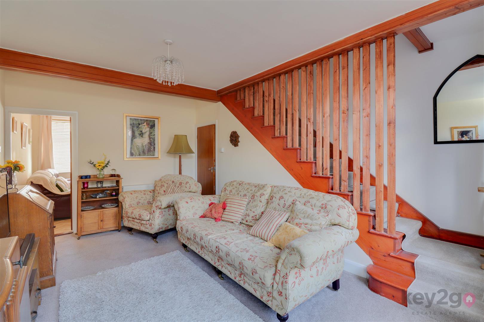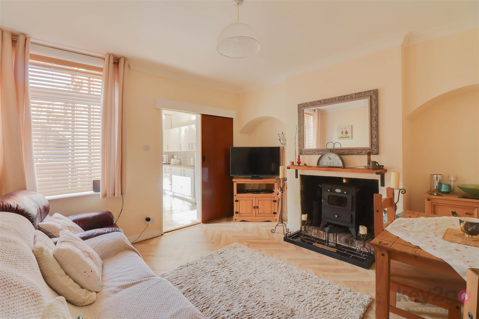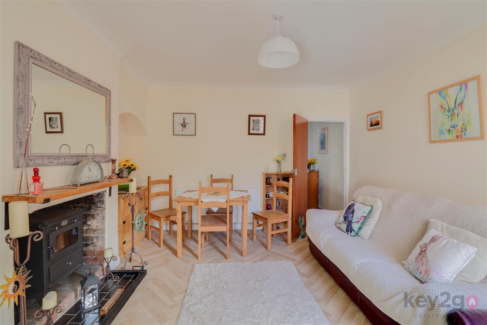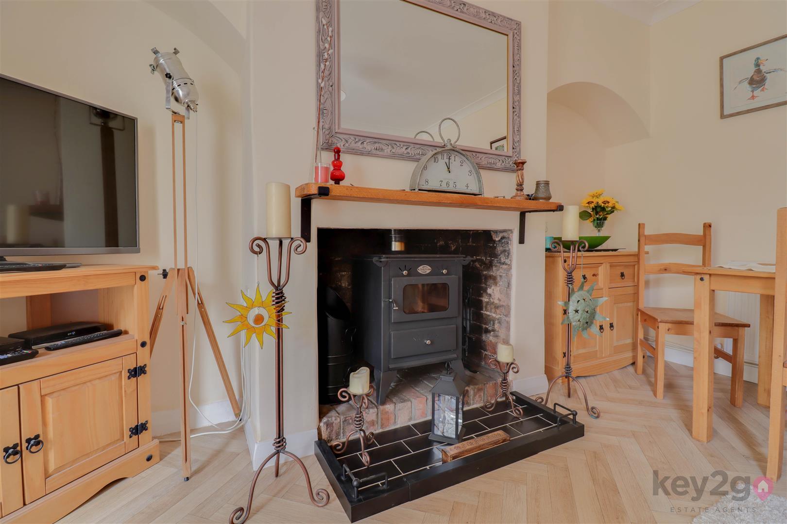 Entrance into a spacious lounge featuring a beam to the ceiling, an under stairs storage cupboard, and stairs rising to the first floor. A door leads to the dining room, which has a feature fireplace with a log burner and a sliding door to the kitchen. The kitchen is modern and fitted with ample wall and base units, oven, hob, and extractor fan, with space for a full-height fridge/freezer and washing machine/tumble dryer. A door provides access to the rear garden.