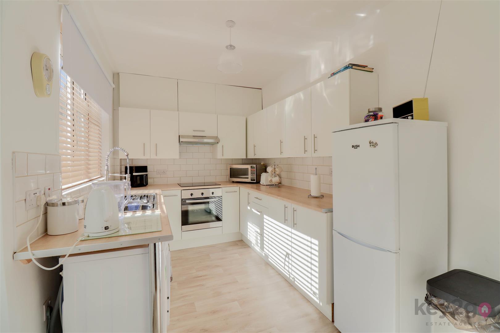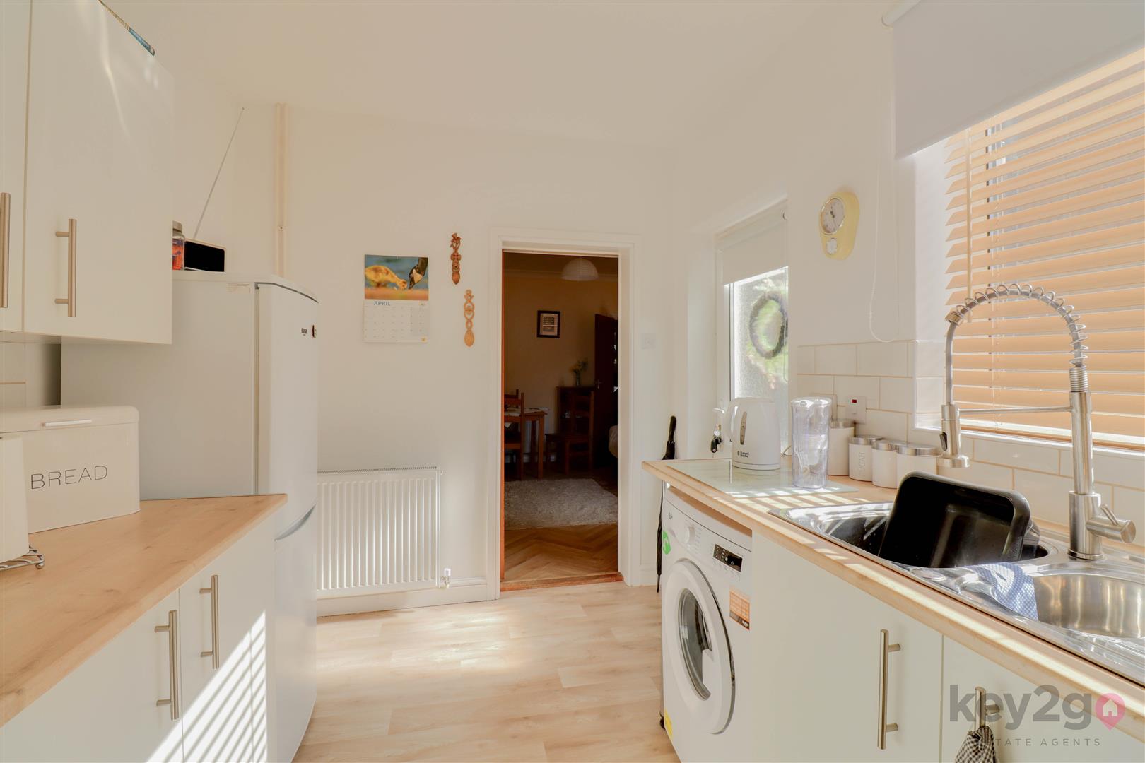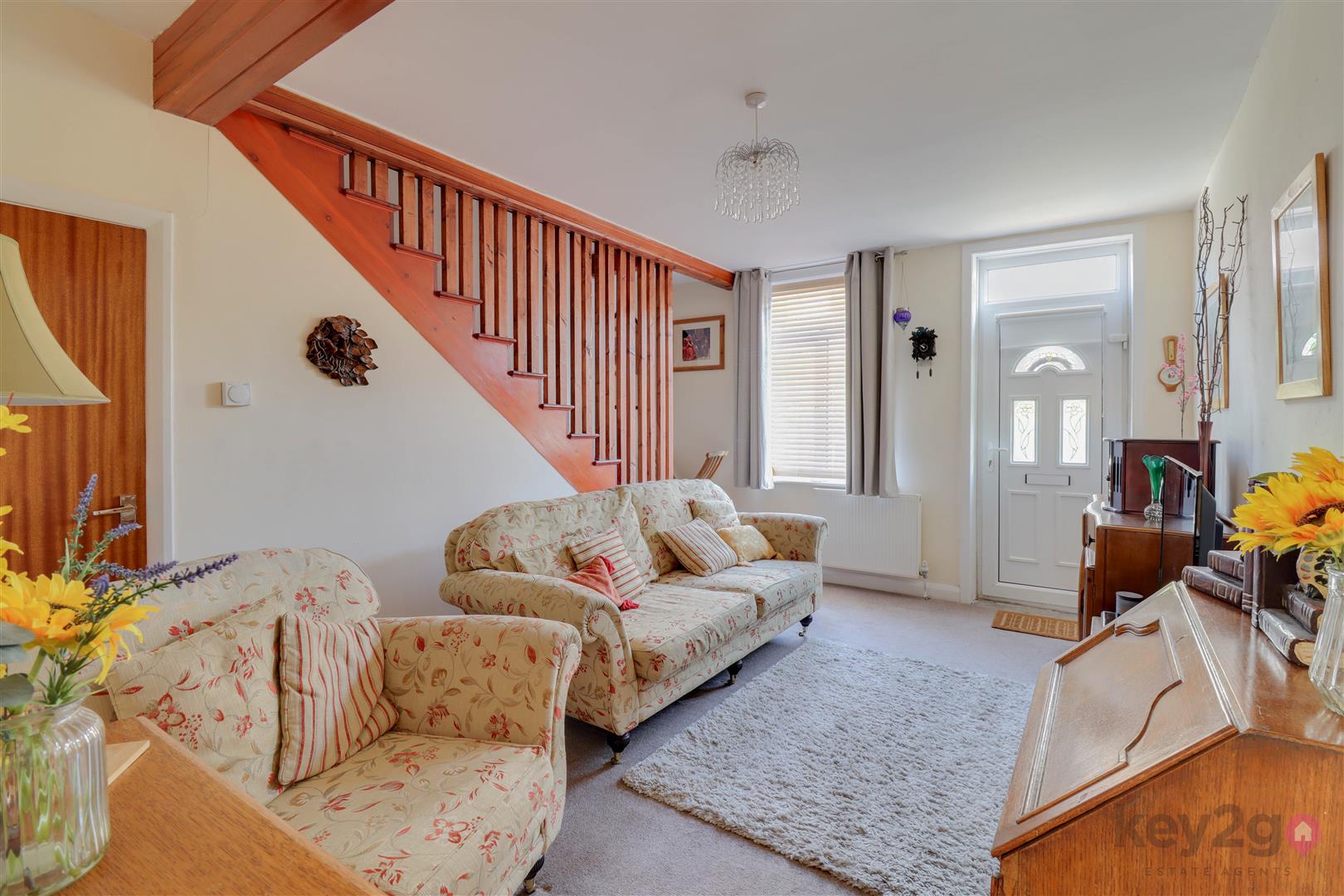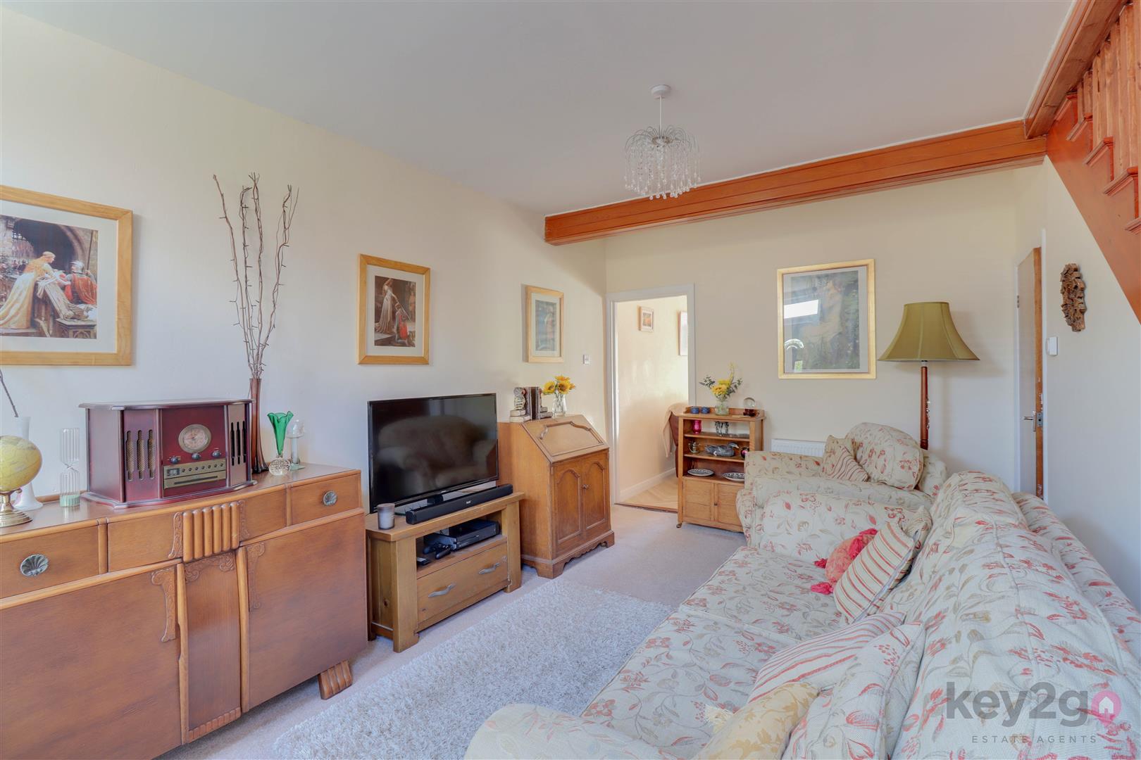 Entrance into a spacious lounge featuring a beam to the ceiling, an under stairs storage cupboard, and stairs rising to the first floor. A door leads to the dining room, which has a feature fireplace with a log burner and a sliding door to the kitchen. The kitchen is modern and fitted with ample wall and base units, oven, hob, and extractor fan, with space for a full-height fridge/freezer and washing machine/tumble dryer. A door provides access to the rear garden.