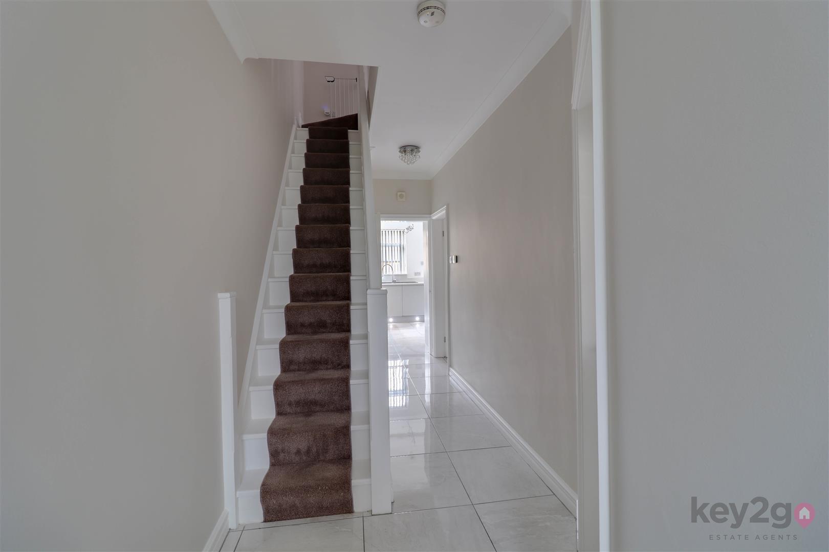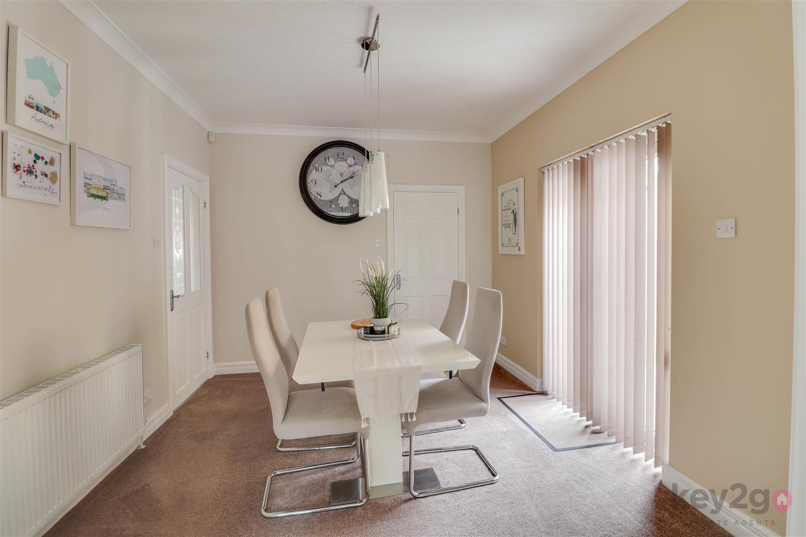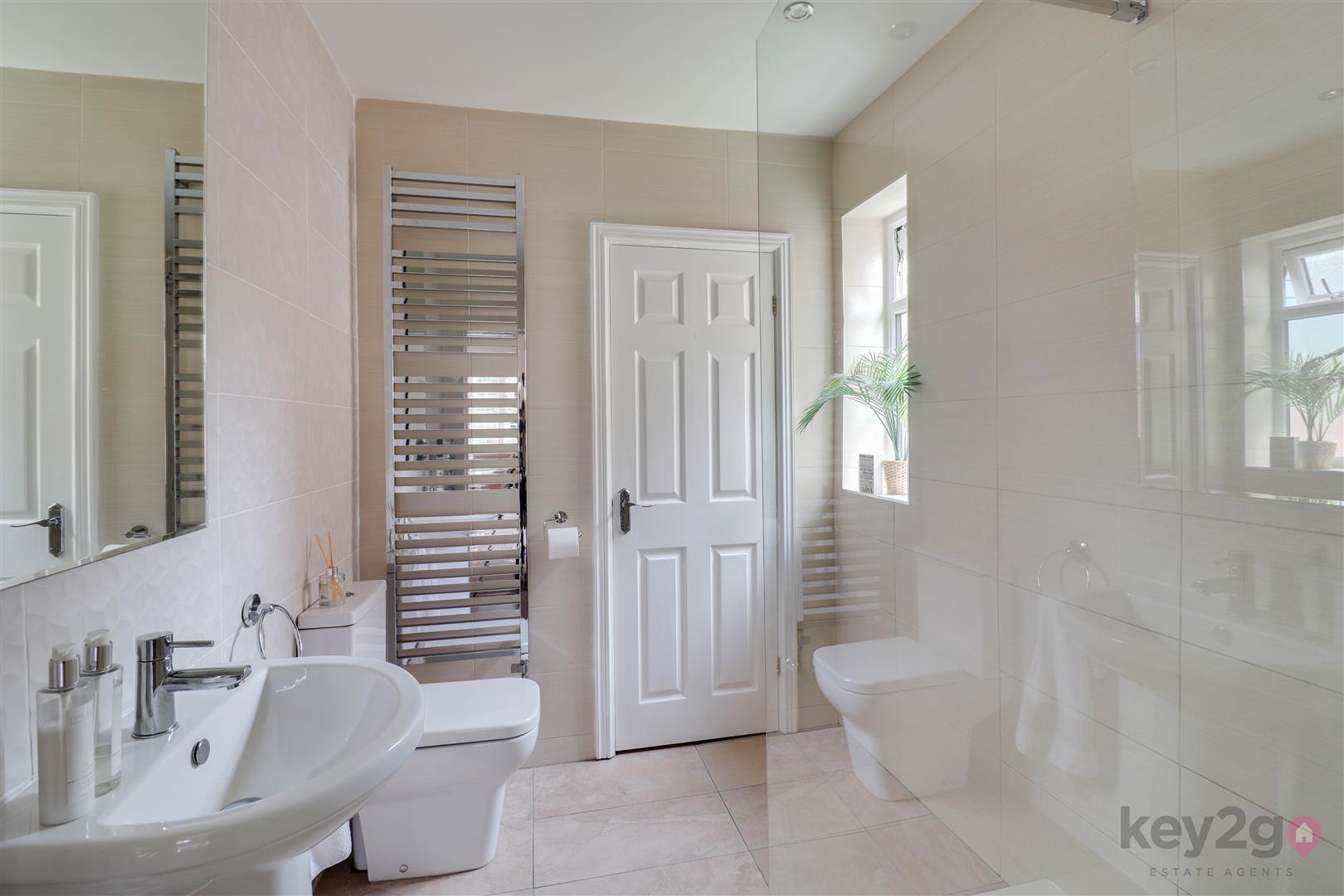 Composite door leading to a welcoming hallway that is wide, spacious, and bright with a tiled floor and underfloor heating which offering access to the stairs, lounge/diner, and kitchen. The lounge features neutral décor, a bay window, and carpet, with an open archway leading to the dining area. The dining room is neutral and carpeted, with double doors to the side and access to a modern, stylish shower room. The shower room is well presented with floor-to-ceiling tiling, a large walk-in shower unit with handheld and overhead showers, sink, close-coupled WC, tiled floor, large walk-in storage cupboard/utility area, and an obscure window. The modern kitchen is immaculate, with ample wall and base units, integrated oven, microwave, gas hob, extractor, space for a large double fridge, tiled floor, double sink, under floor heating, window, and access to the rear.